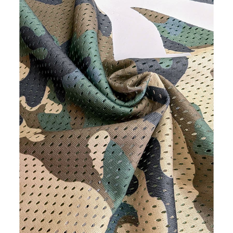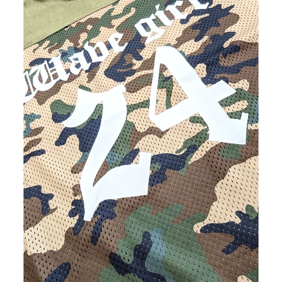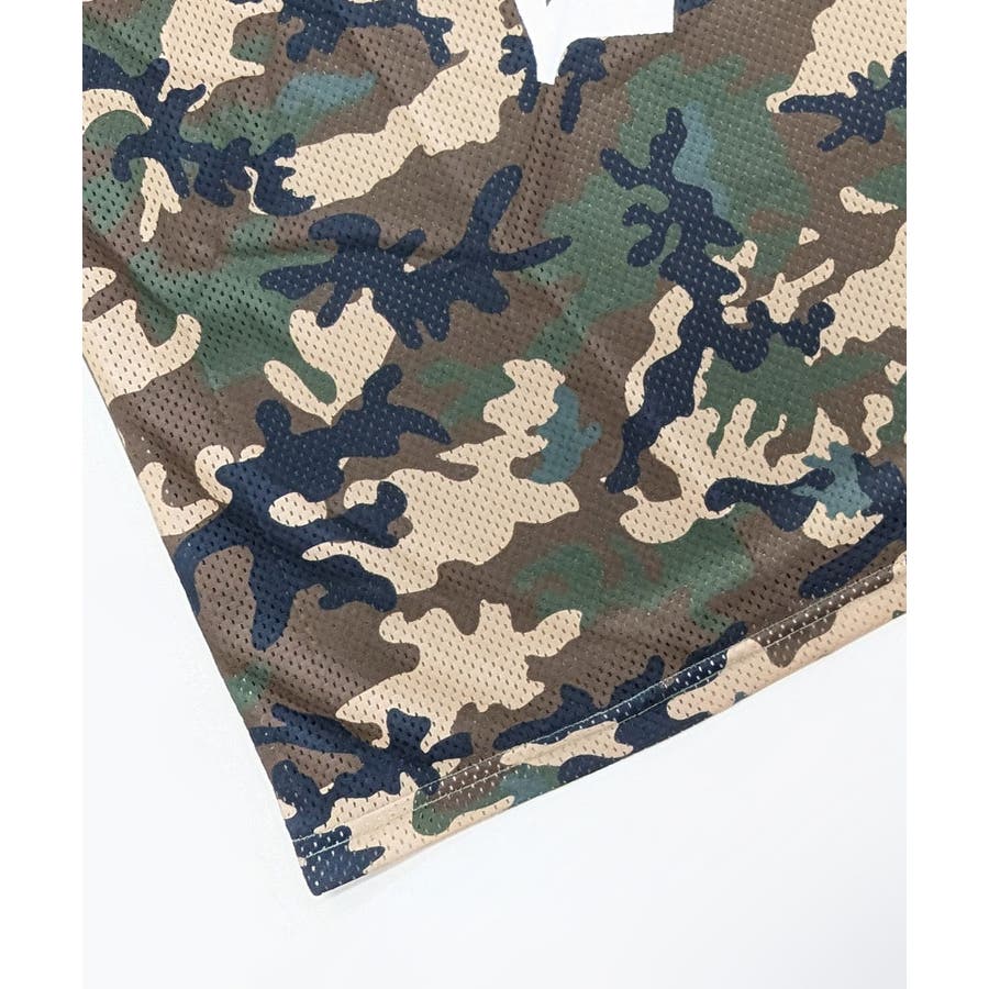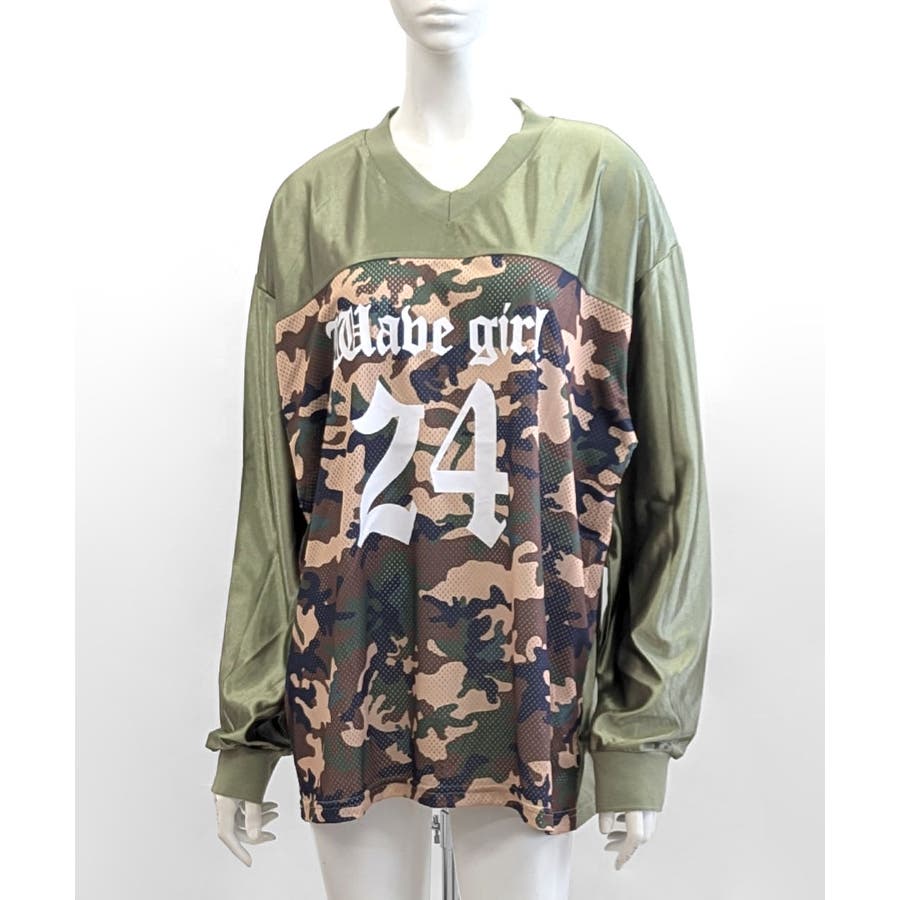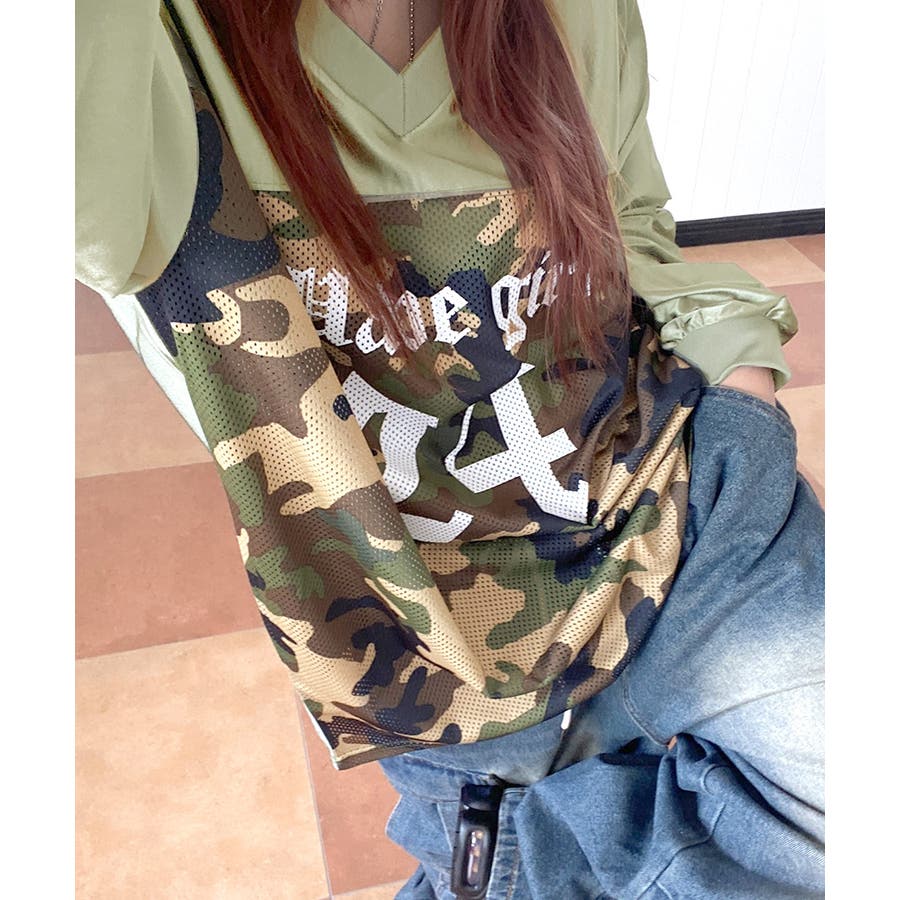 迷彩柄ナンバープリントトップス メッシュ Vネック