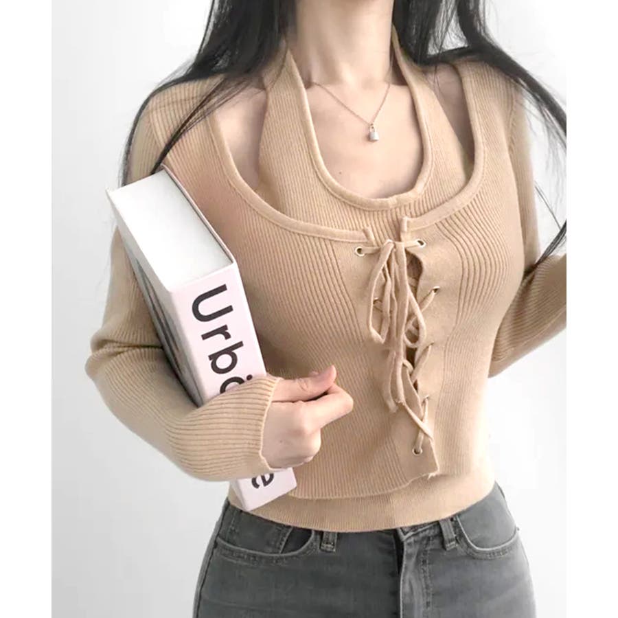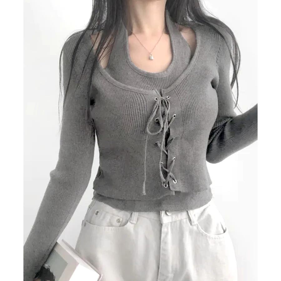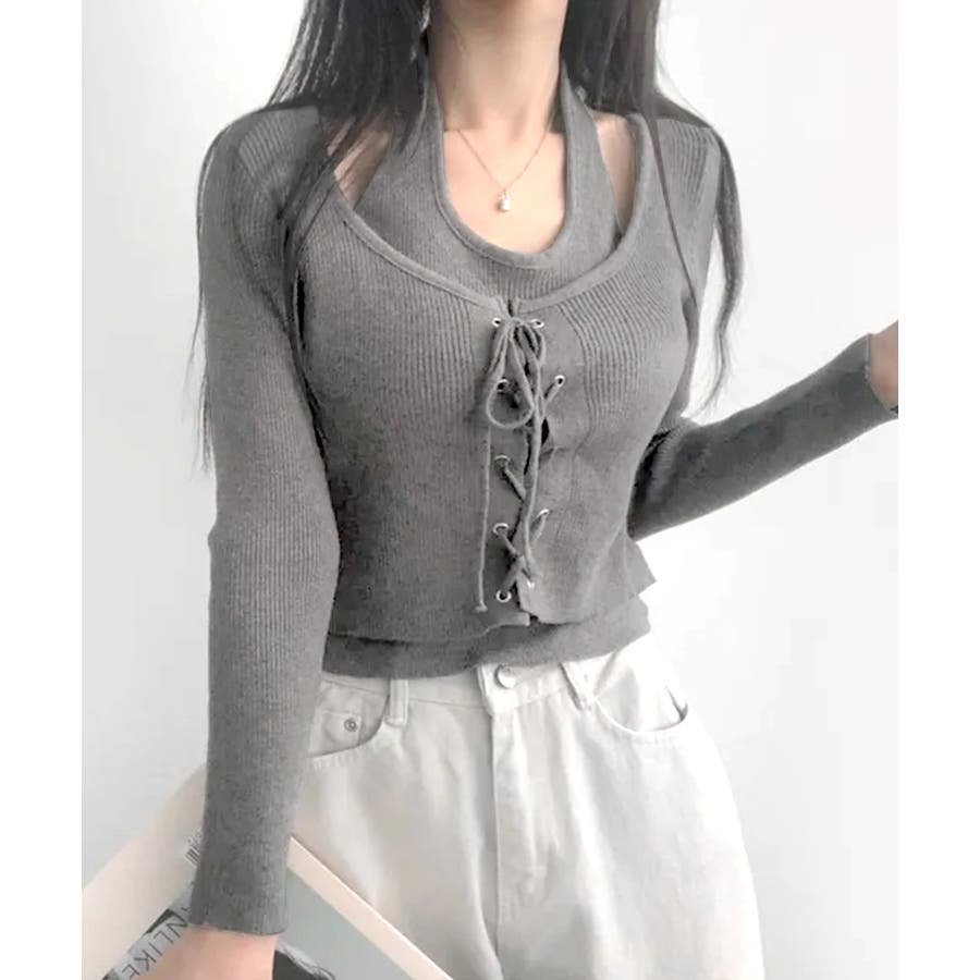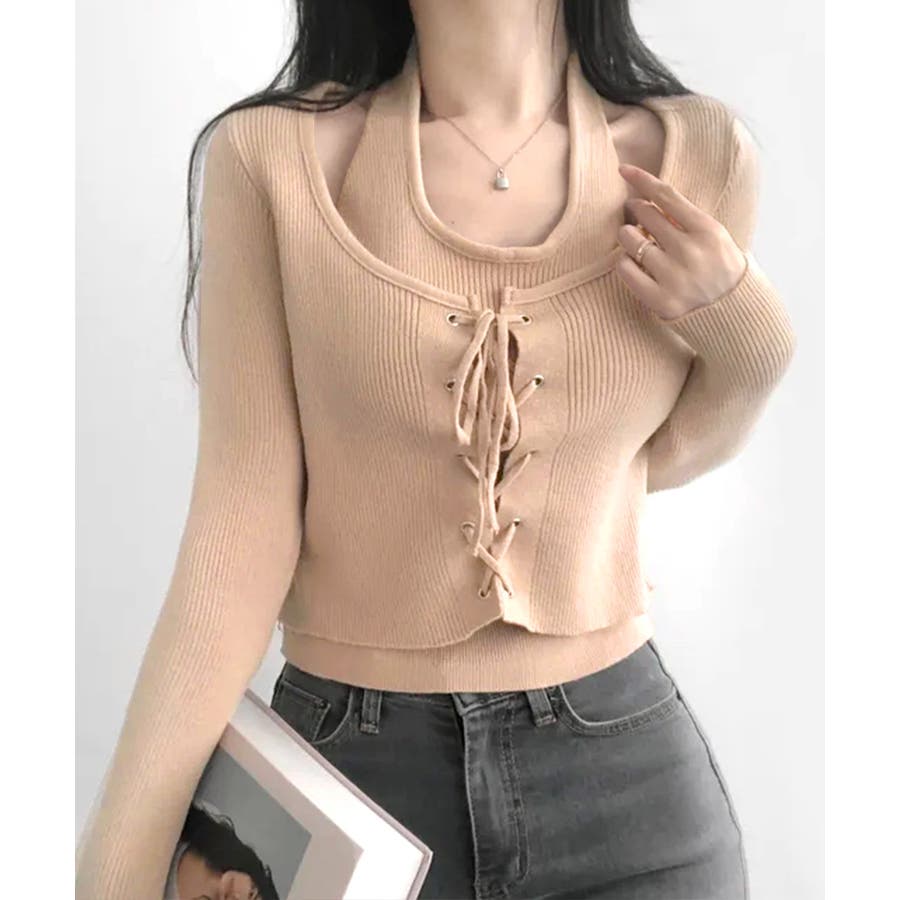 ホルターネックレイヤード風レースアップリブニット フェイクレイヤード ドッキング