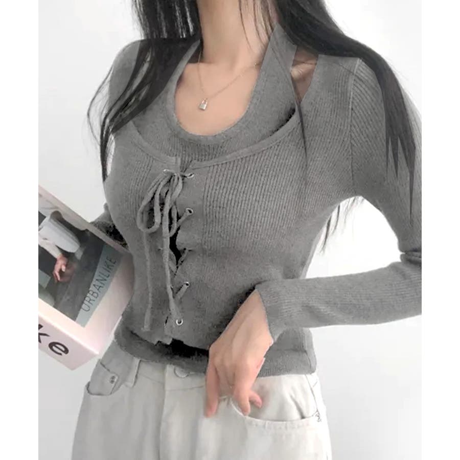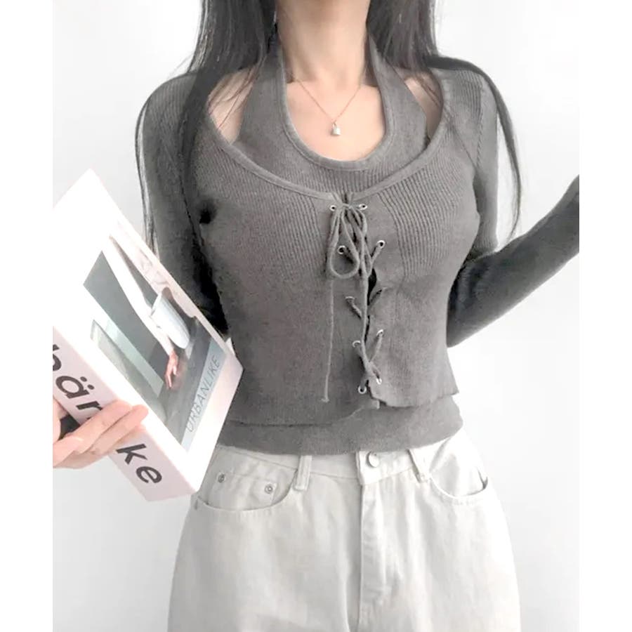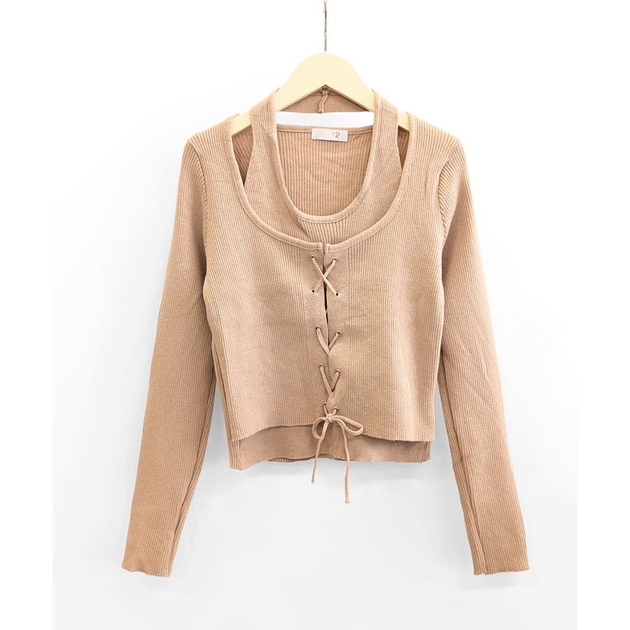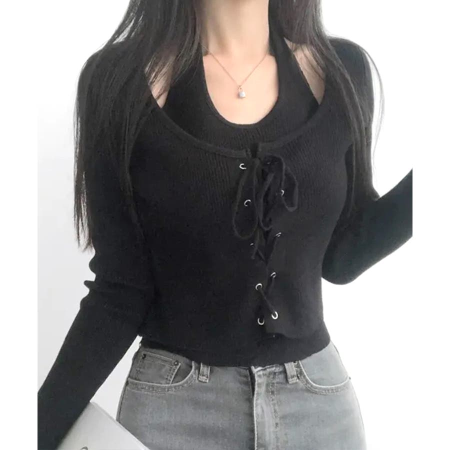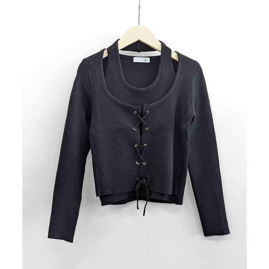 ホルターネックレイヤード風レースアップリブニット フェイクレイヤード ドッキング