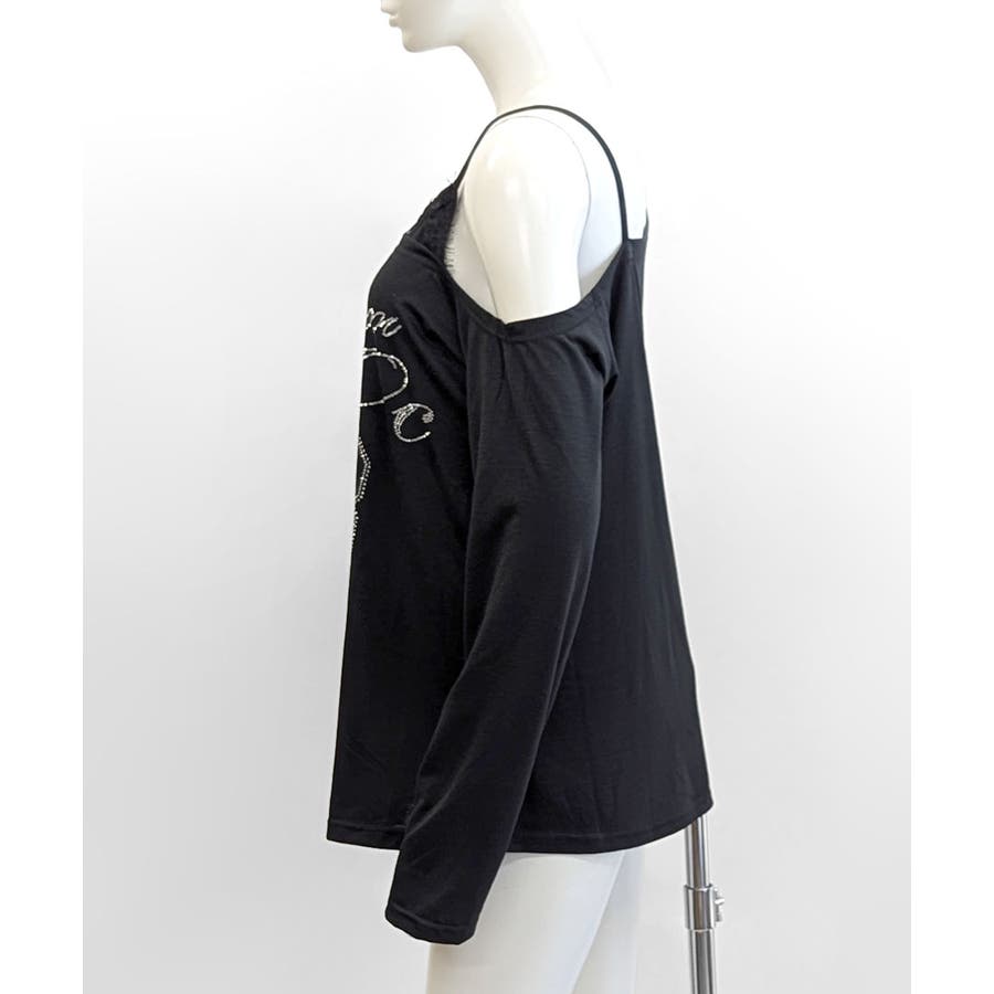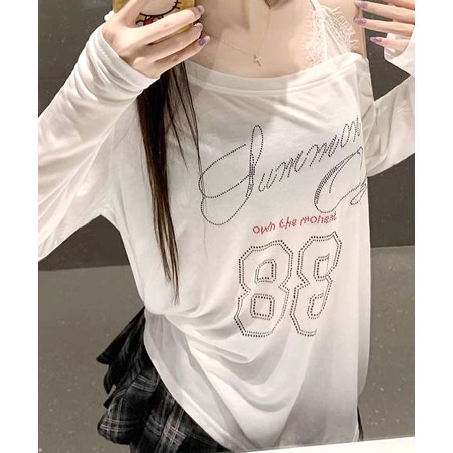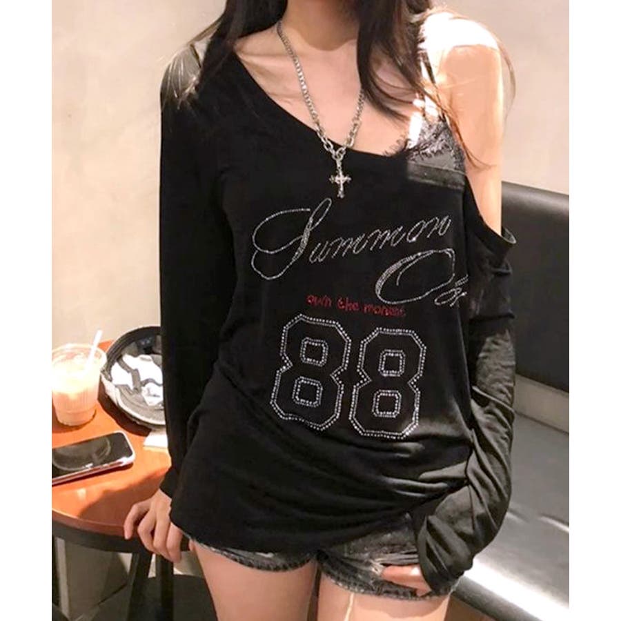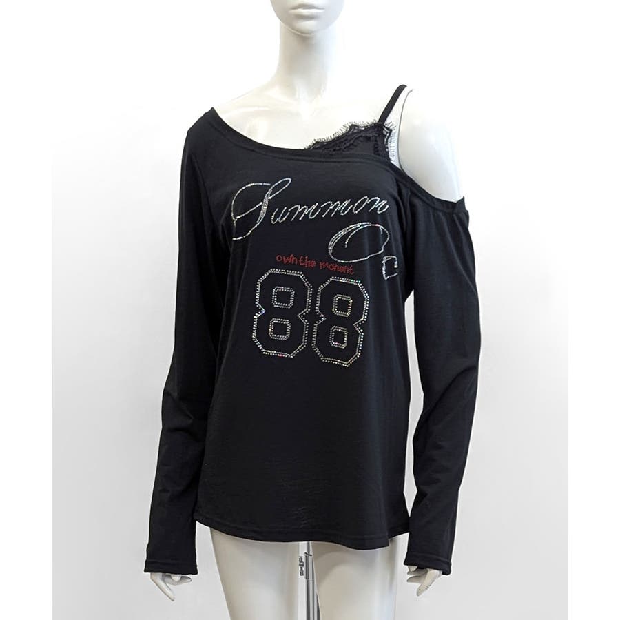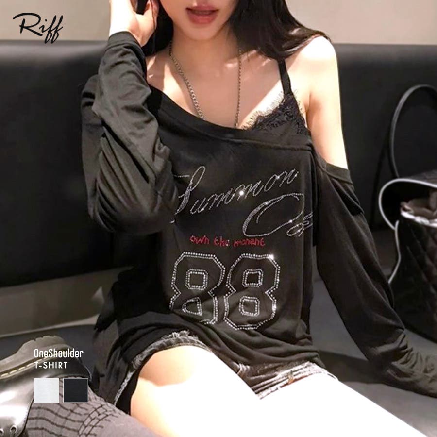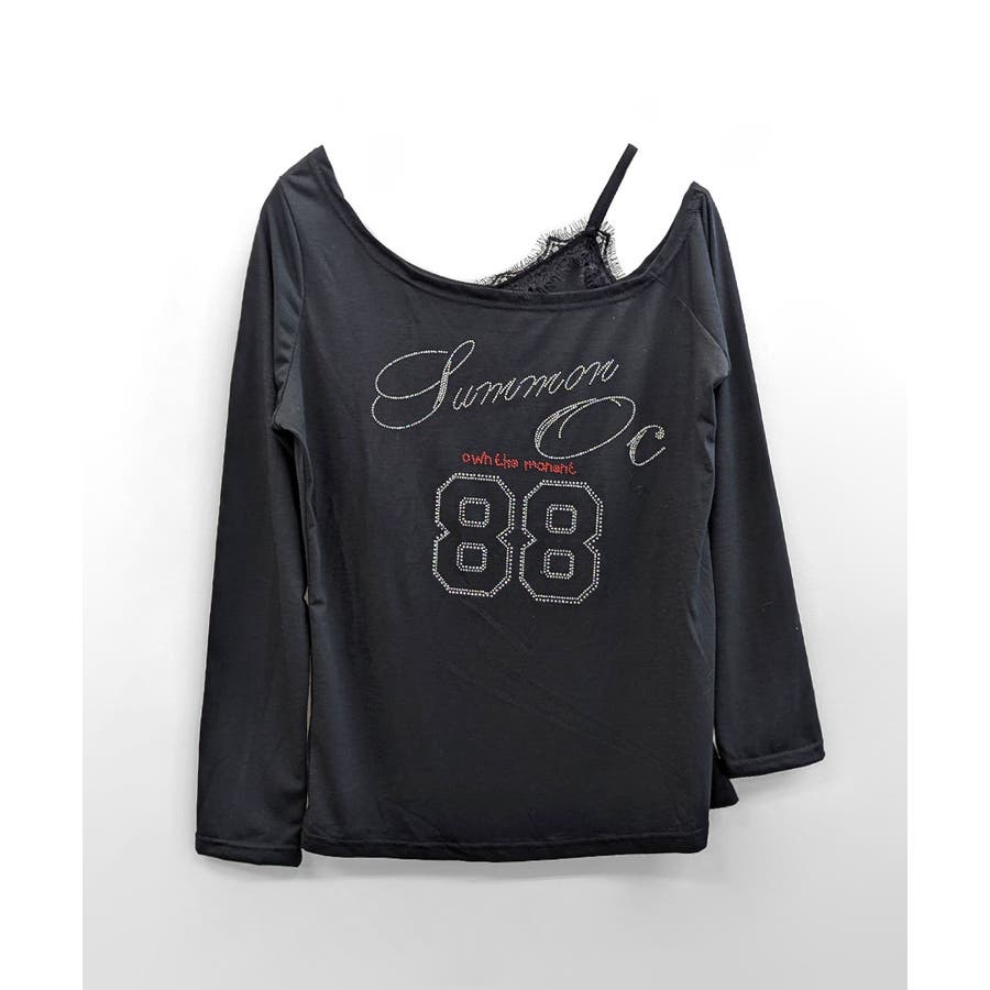 ラインストーンロゴワンショルダーロンT ドッキング レイヤード