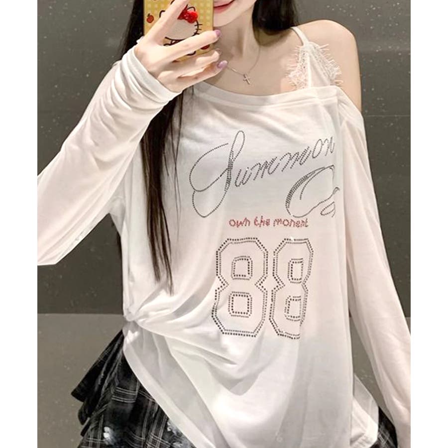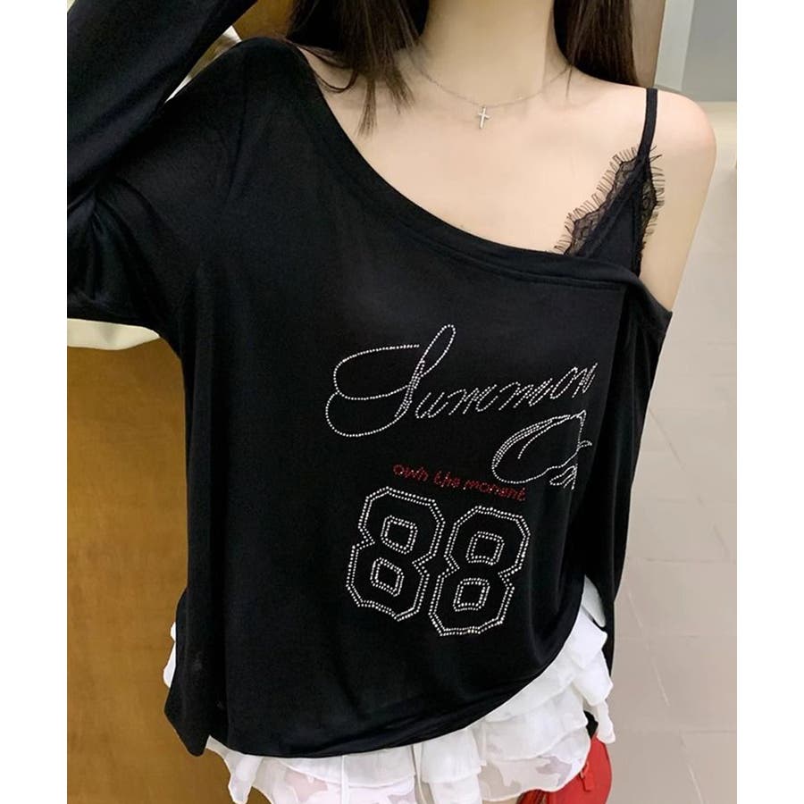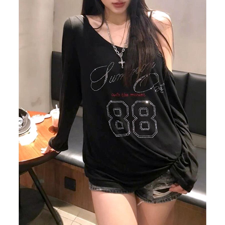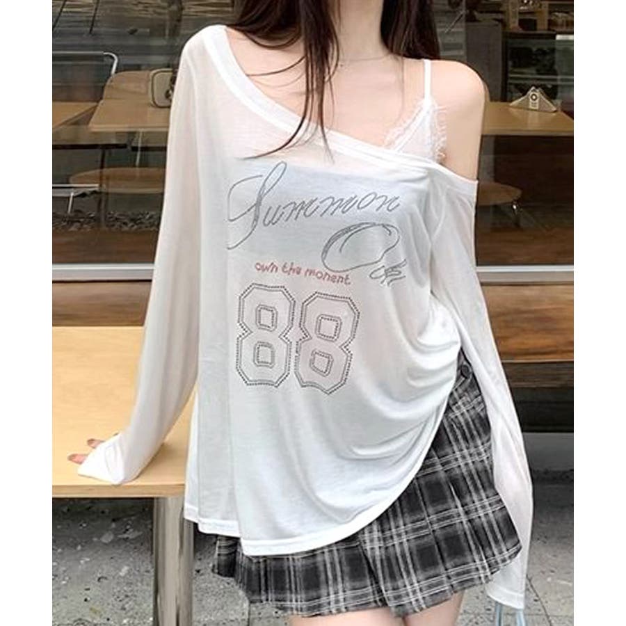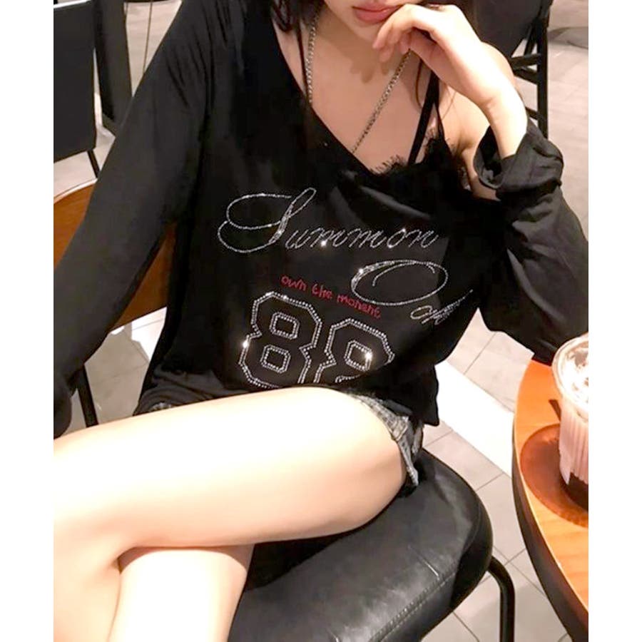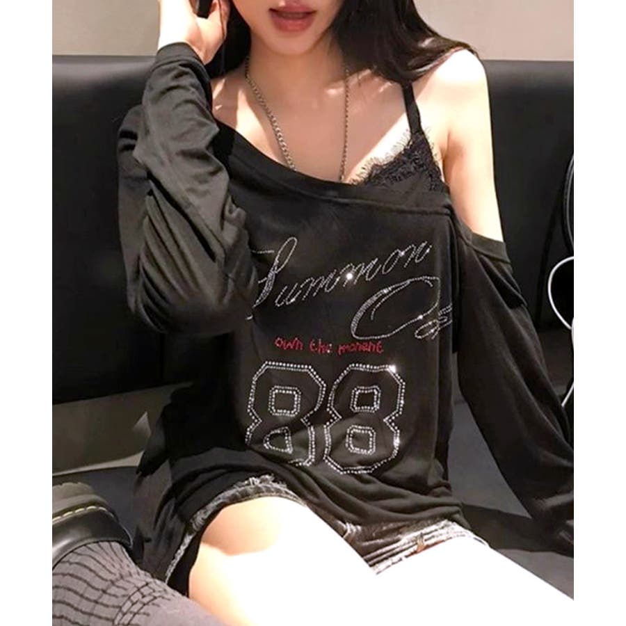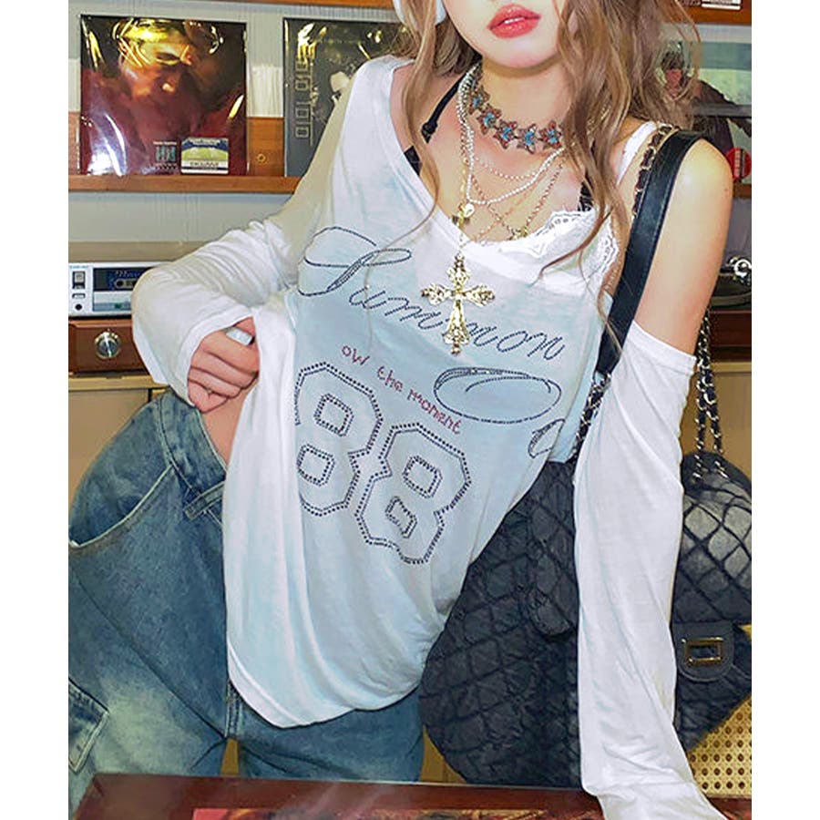 ラインストーンロゴワンショルダーロンT ドッキング レイヤード