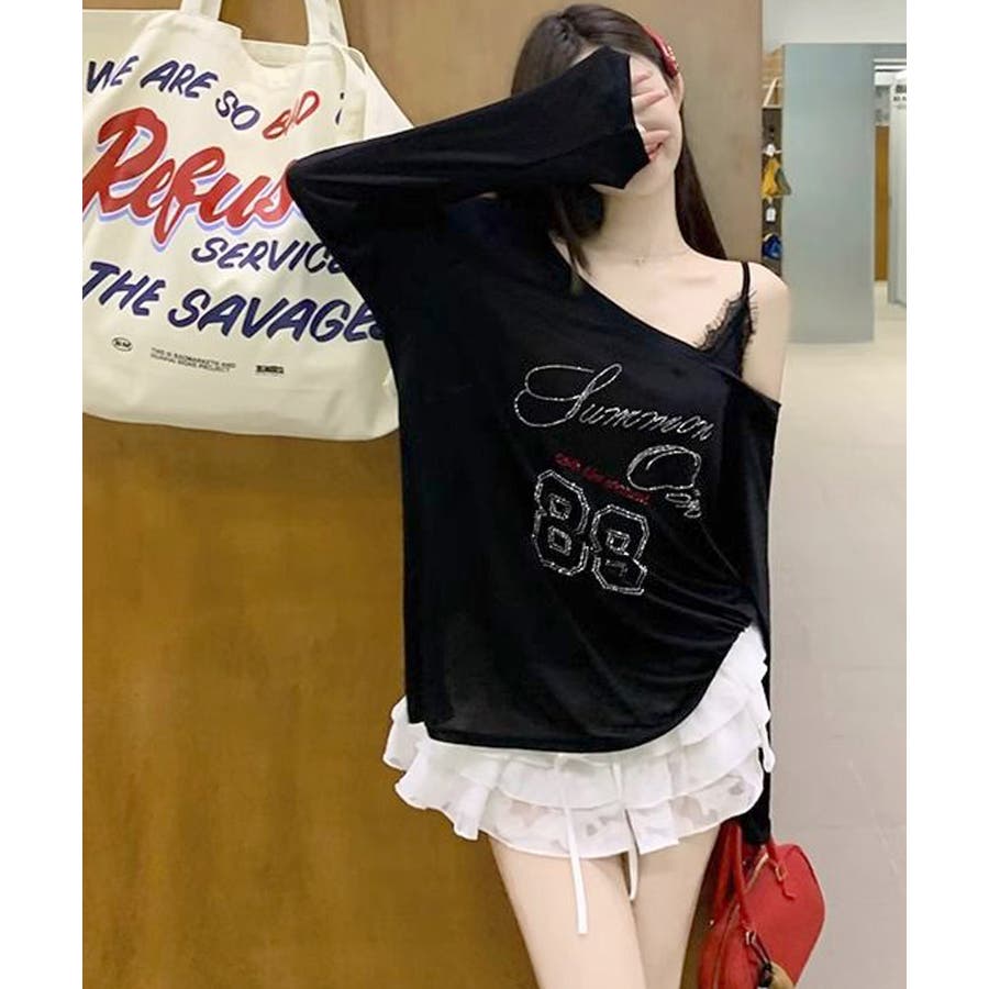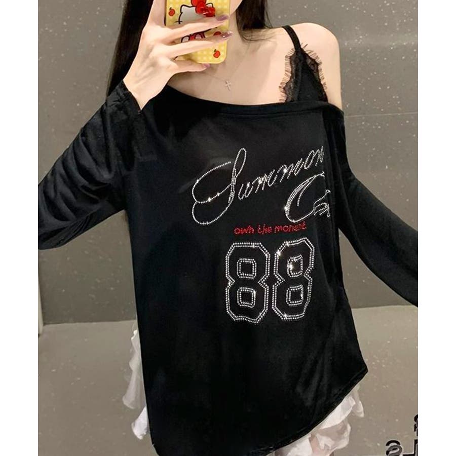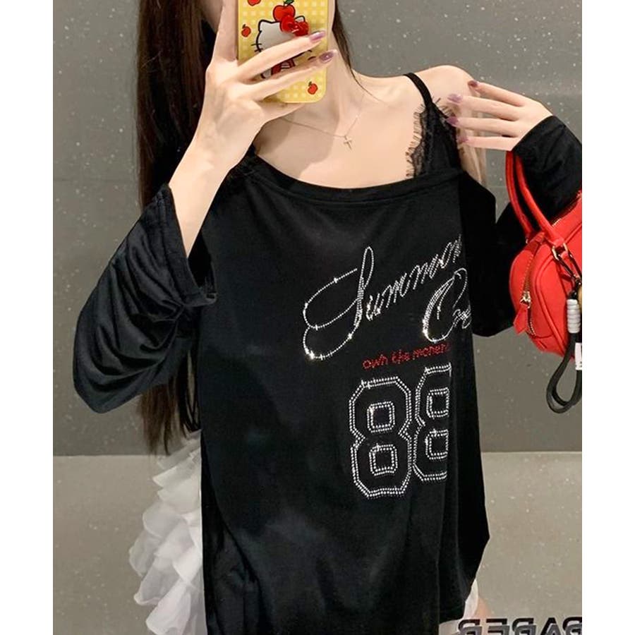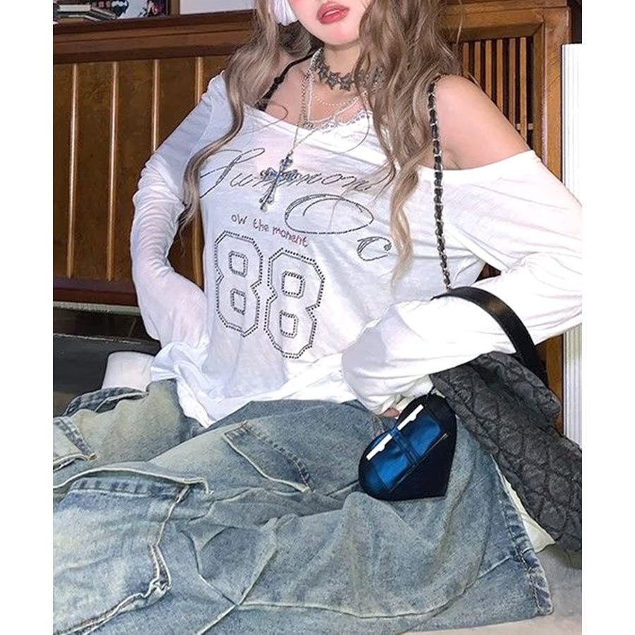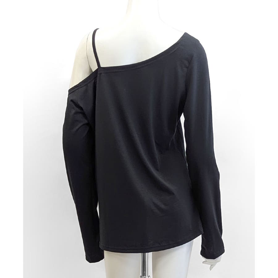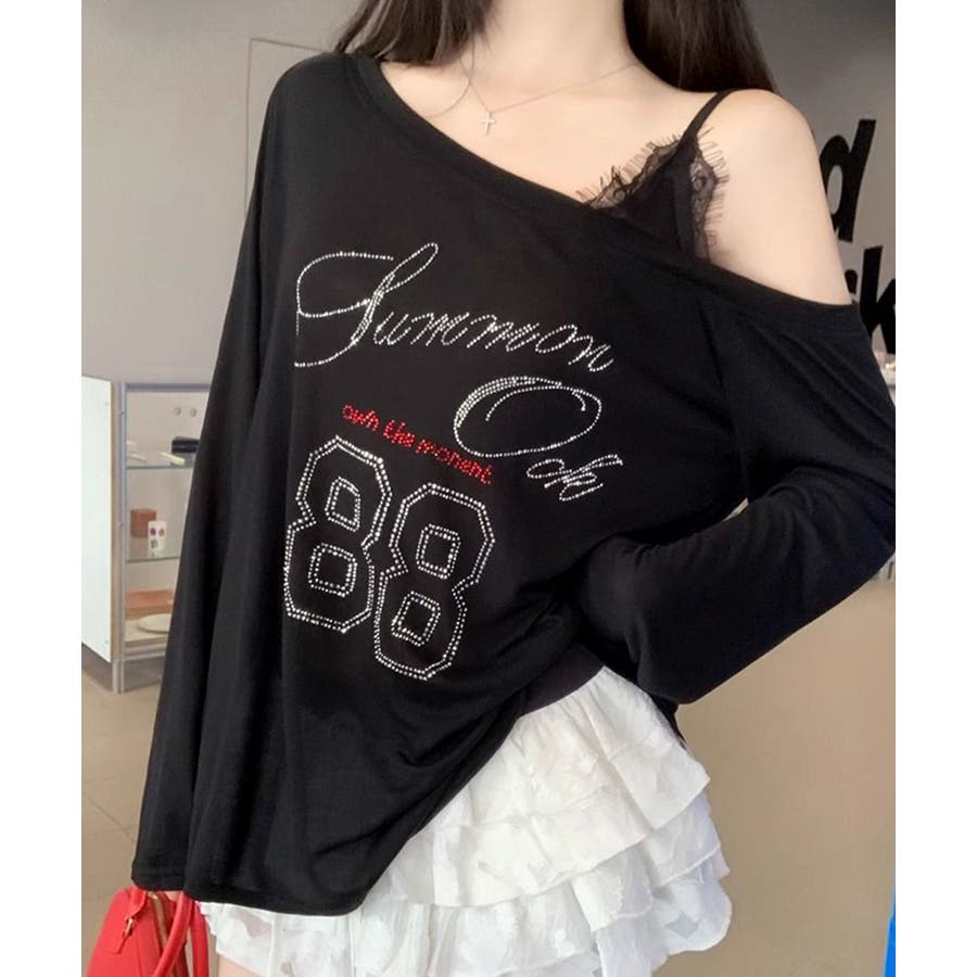 ラインストーンロゴワンショルダーロンT ドッキング レイヤード