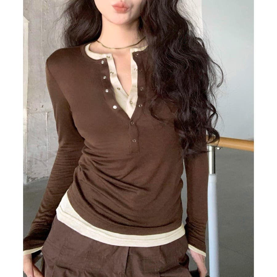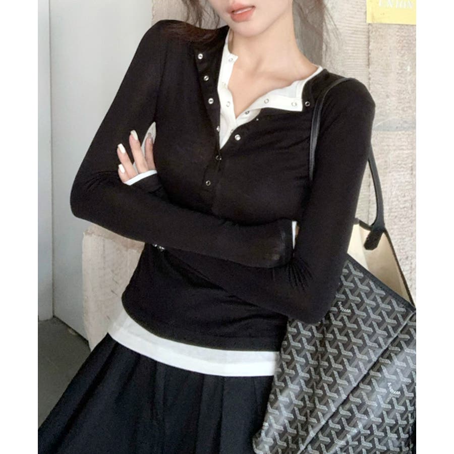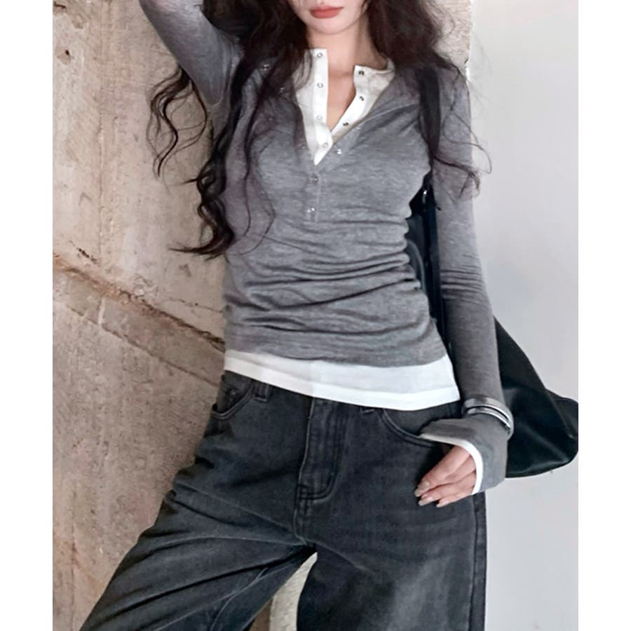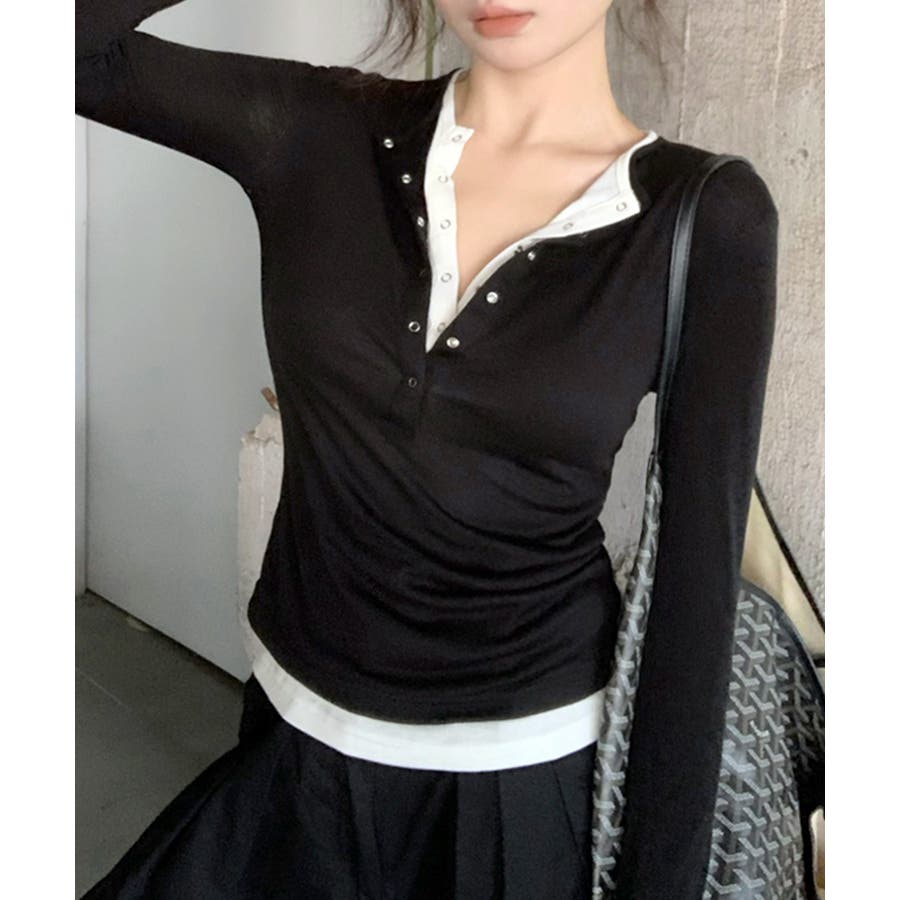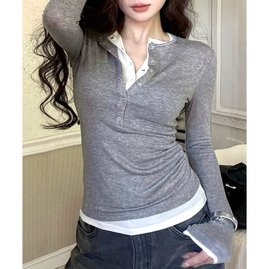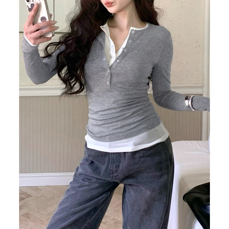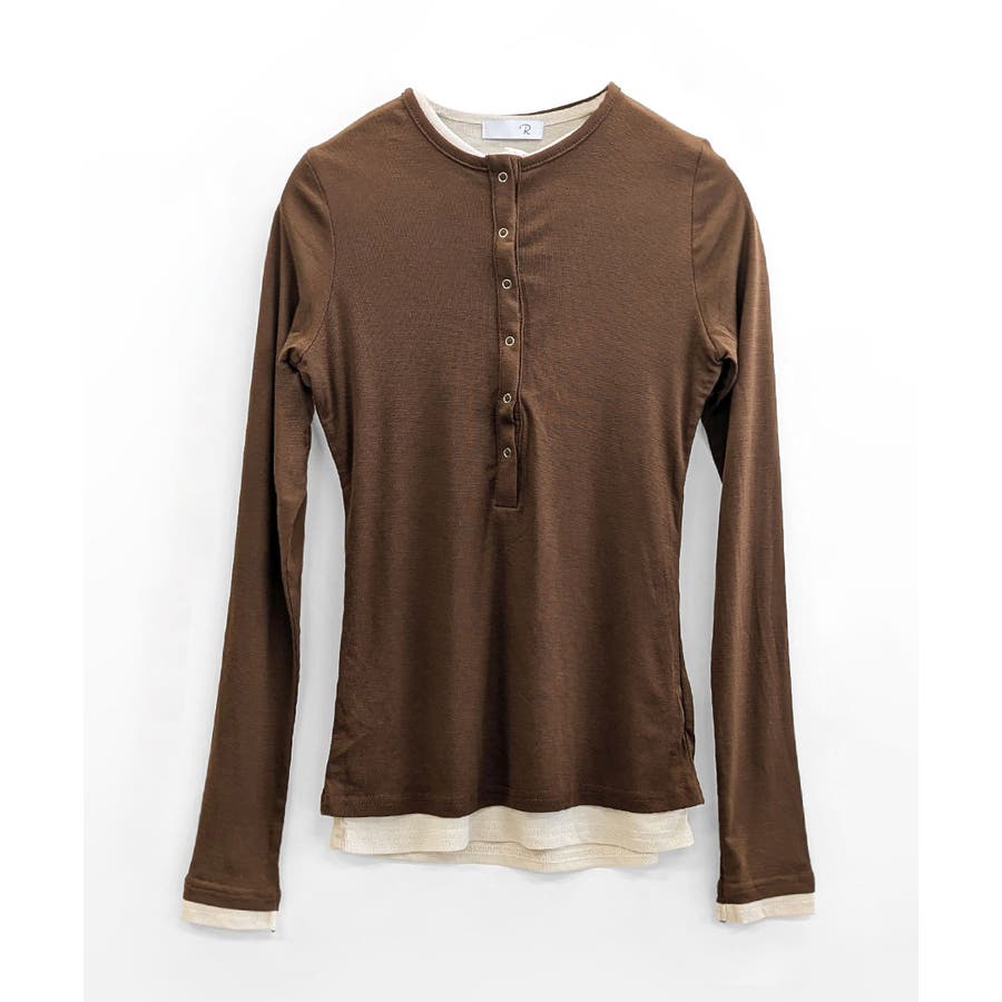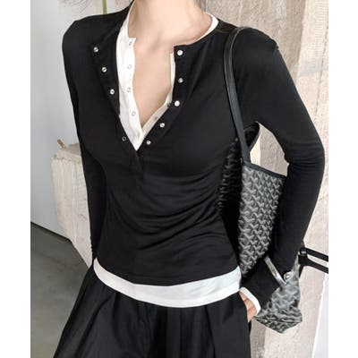 ヘンリーネックレイヤード風トップス フェイクレイヤード ドッキング
