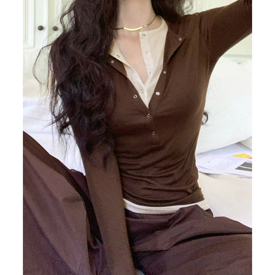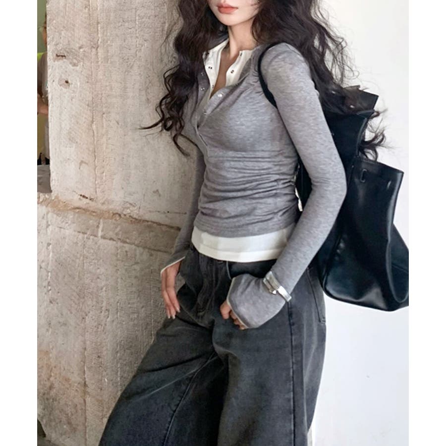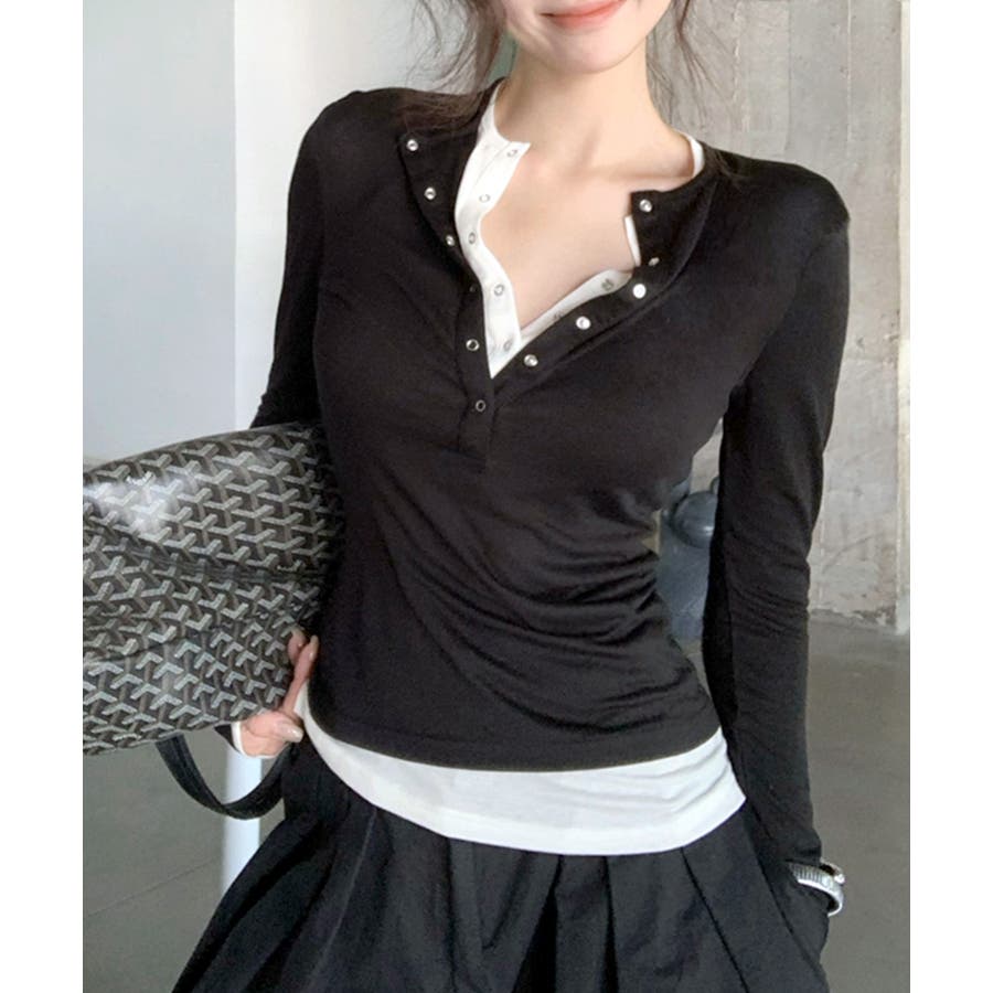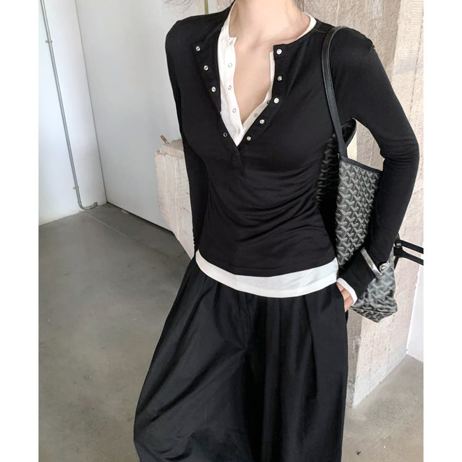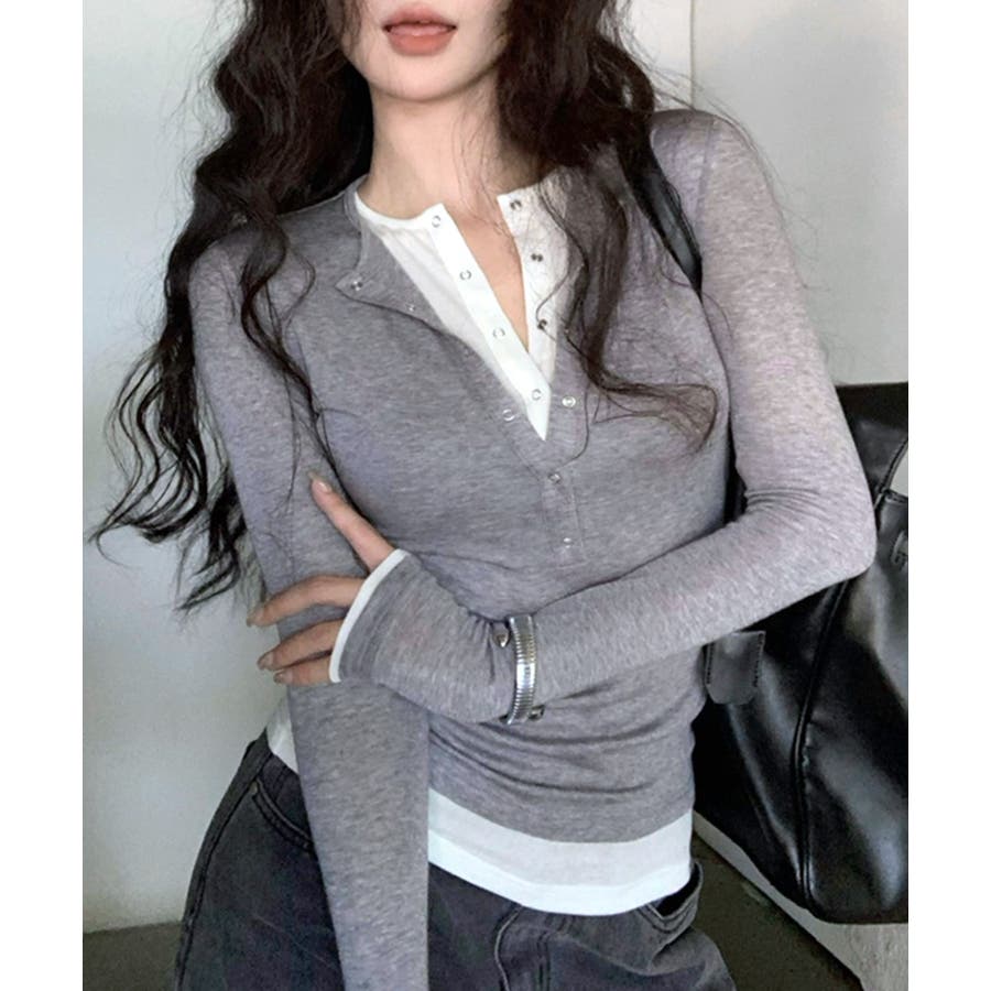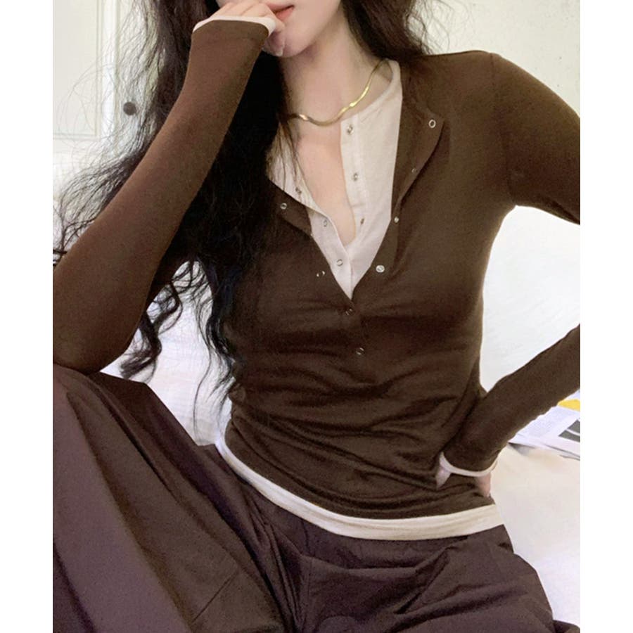 ヘンリーネックレイヤード風トップス フェイクレイヤード ドッキング