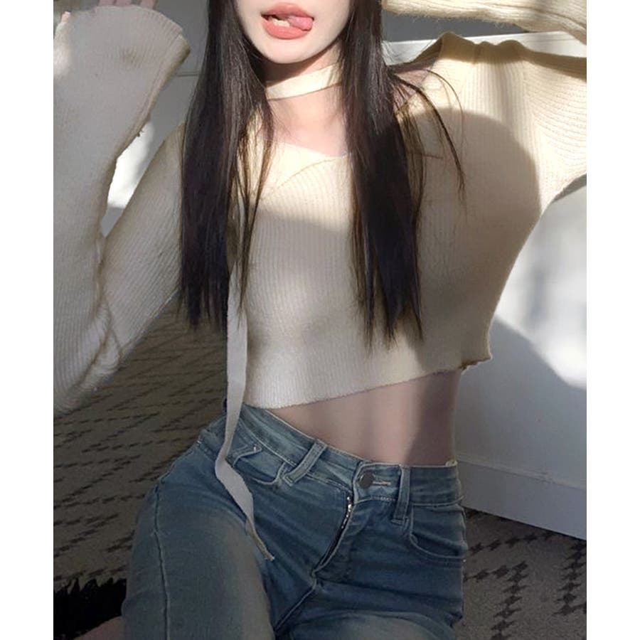 チョーカーリボン付きショート丈リブニット
