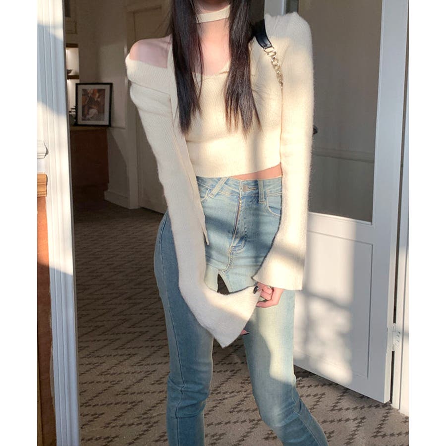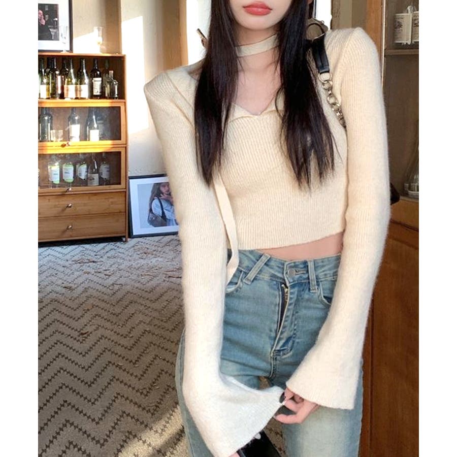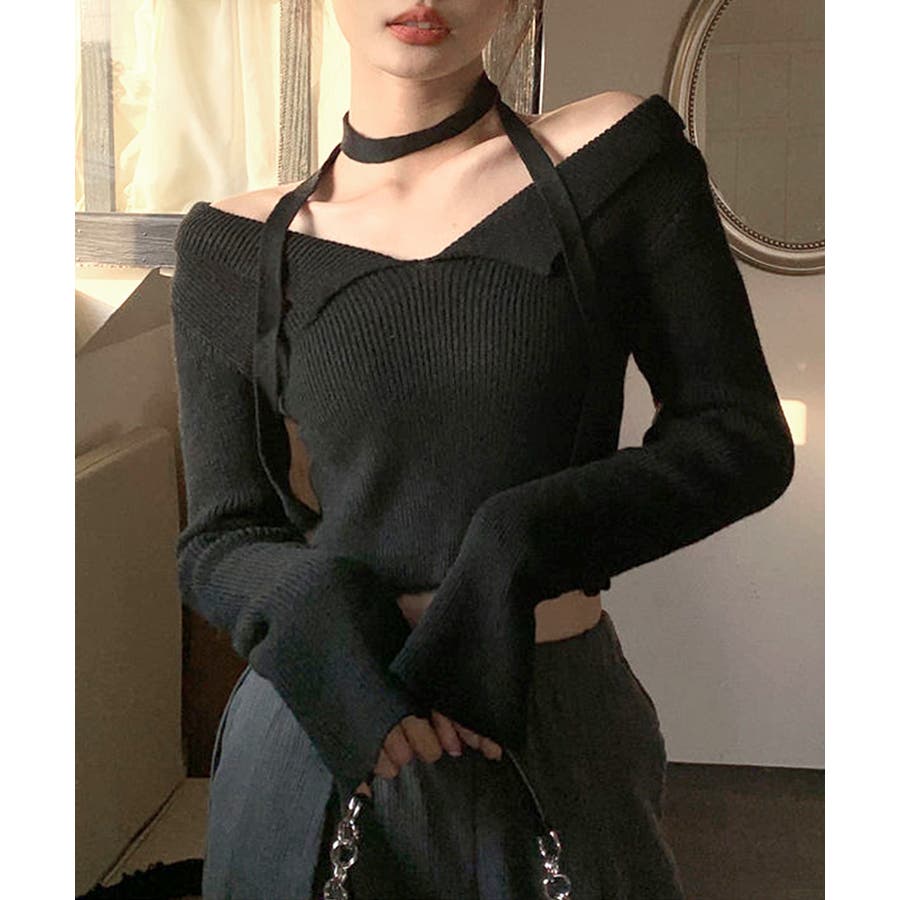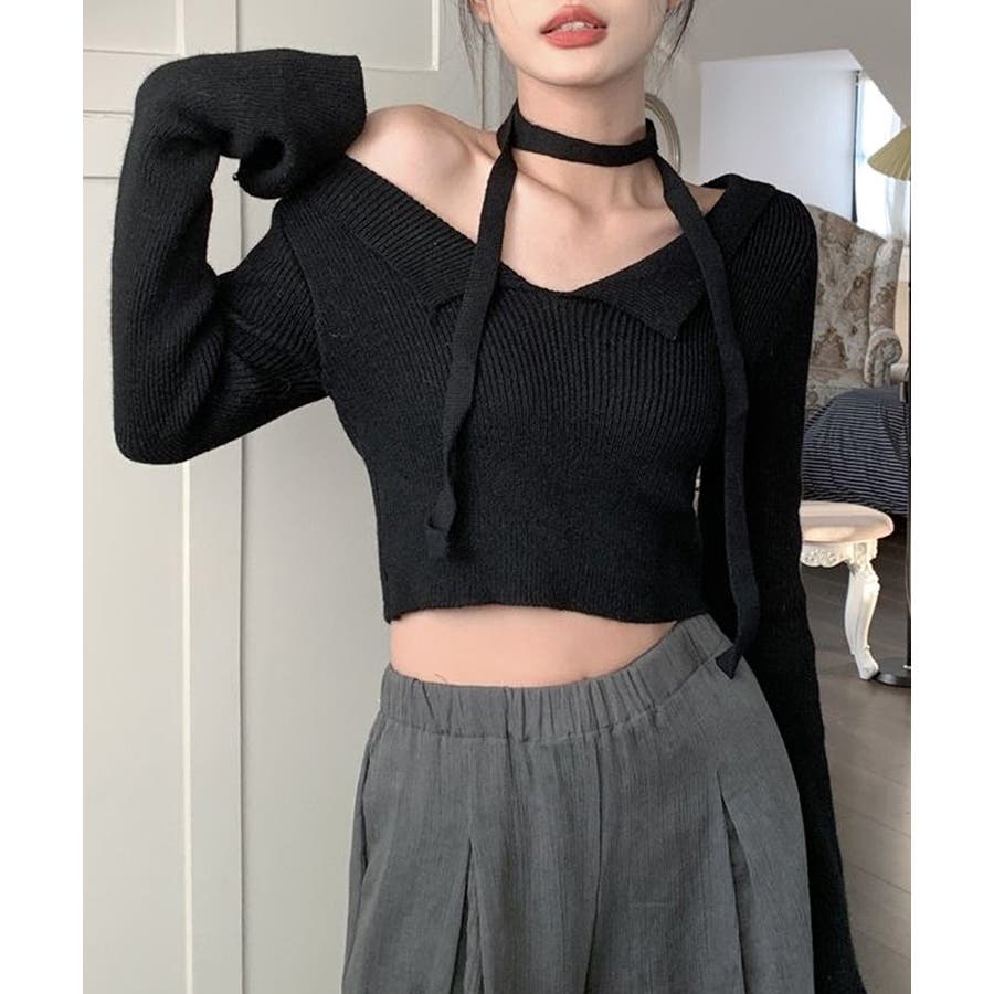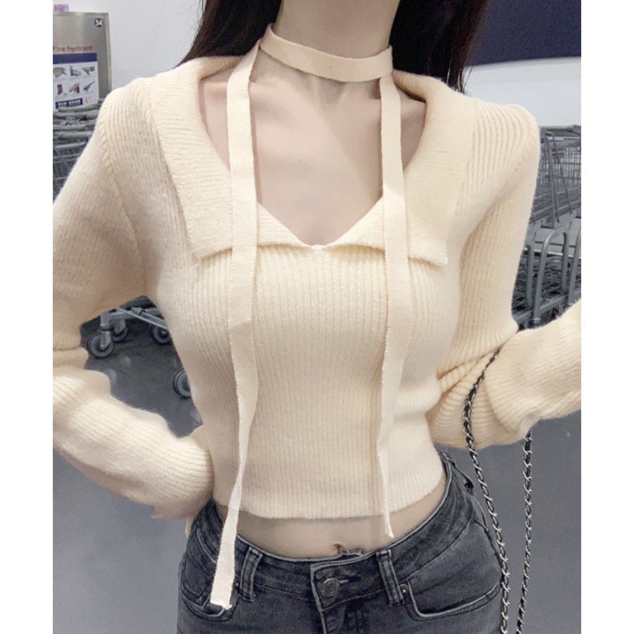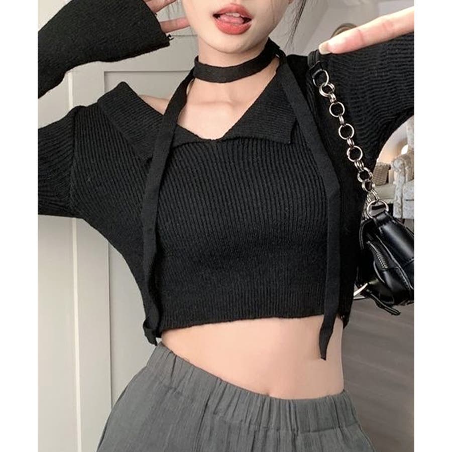 チョーカーリボンがセットのオープンカラーニット。