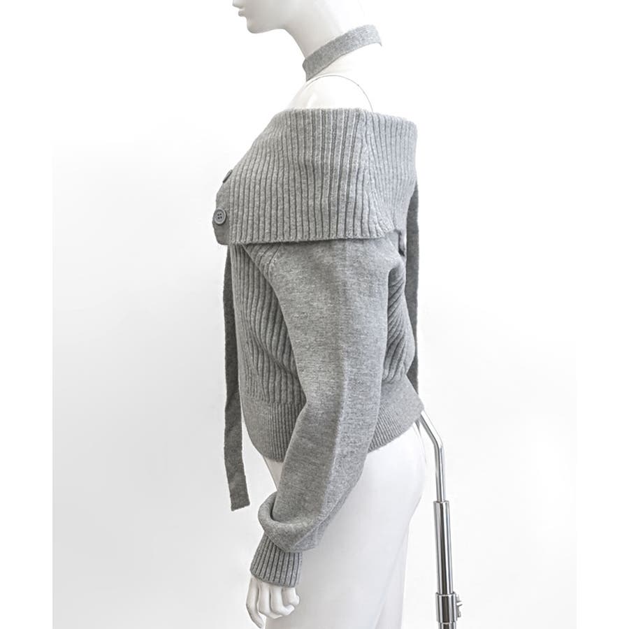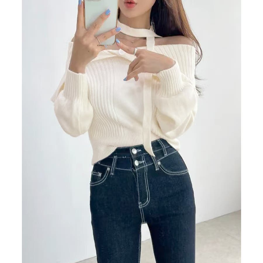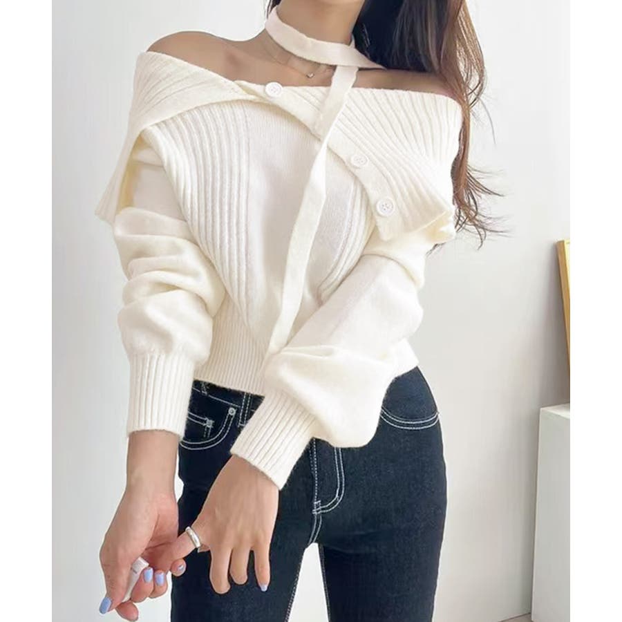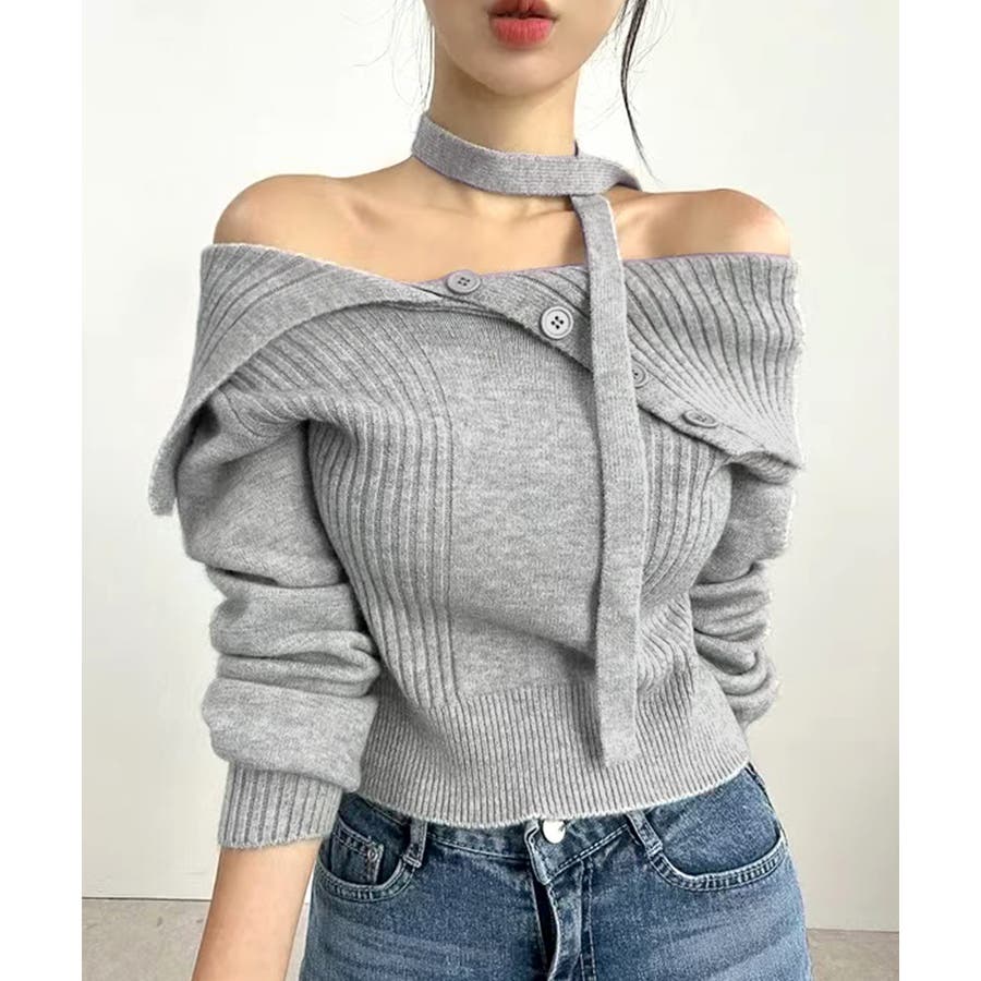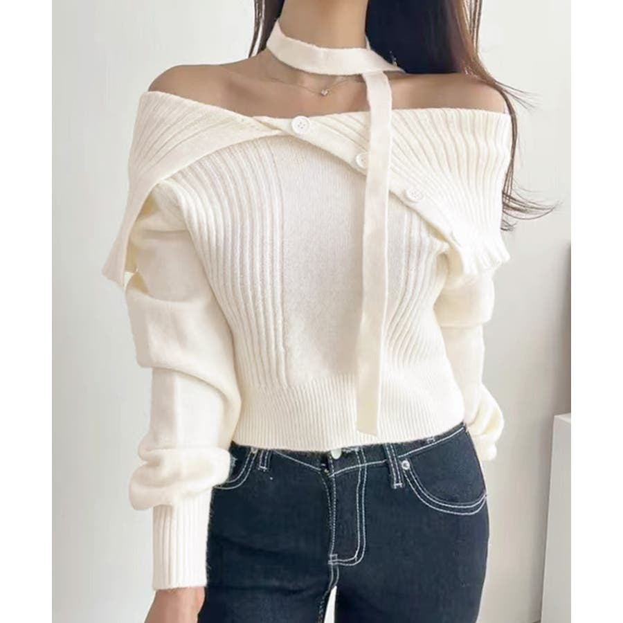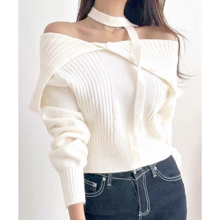 チョーカー付き♡トレンド感あるオフショルニット。