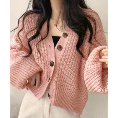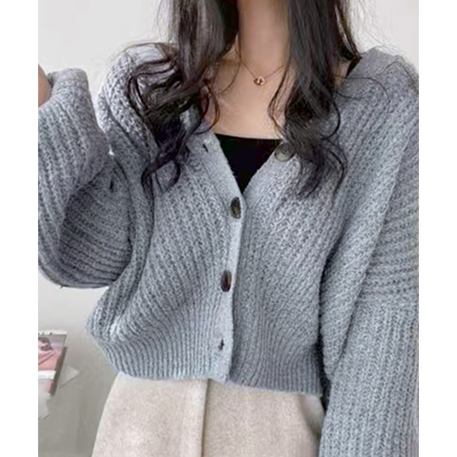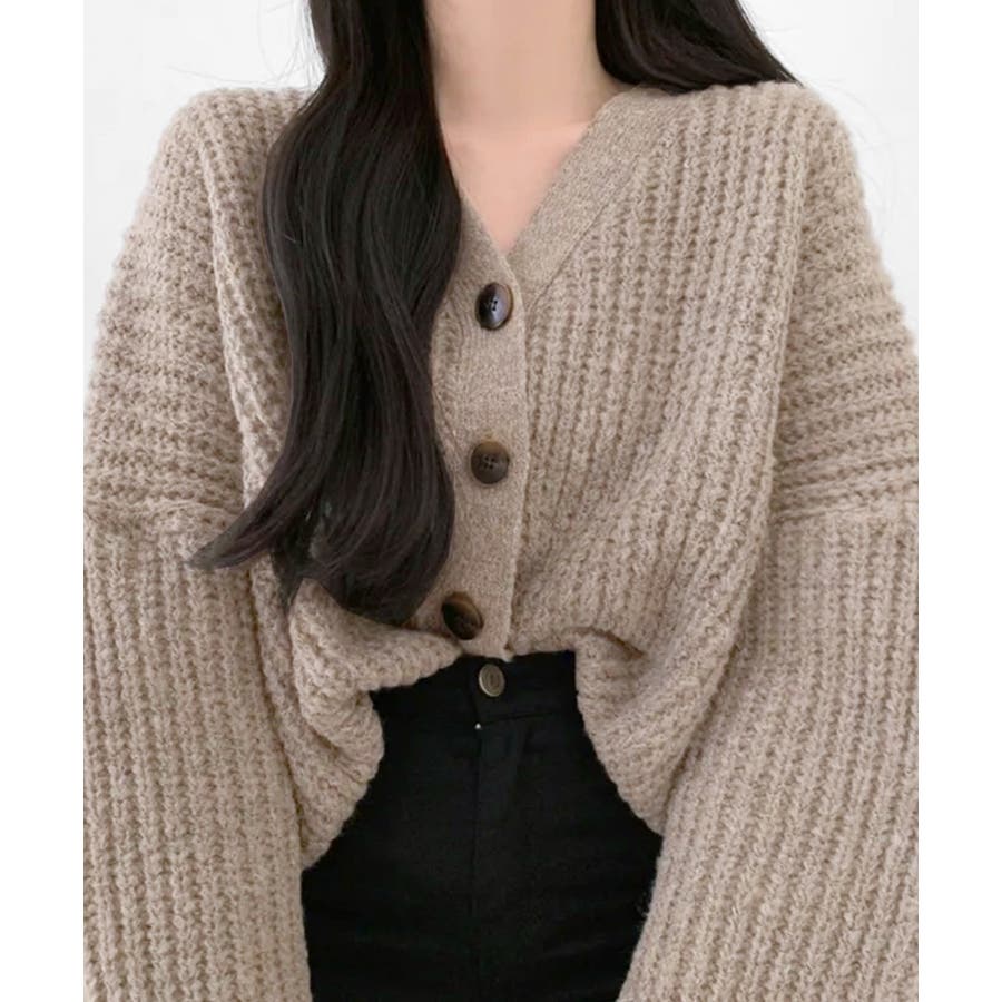 【モカ】ボリューム袖Vネックニットカーディガン ショート丈 ショートカーデ