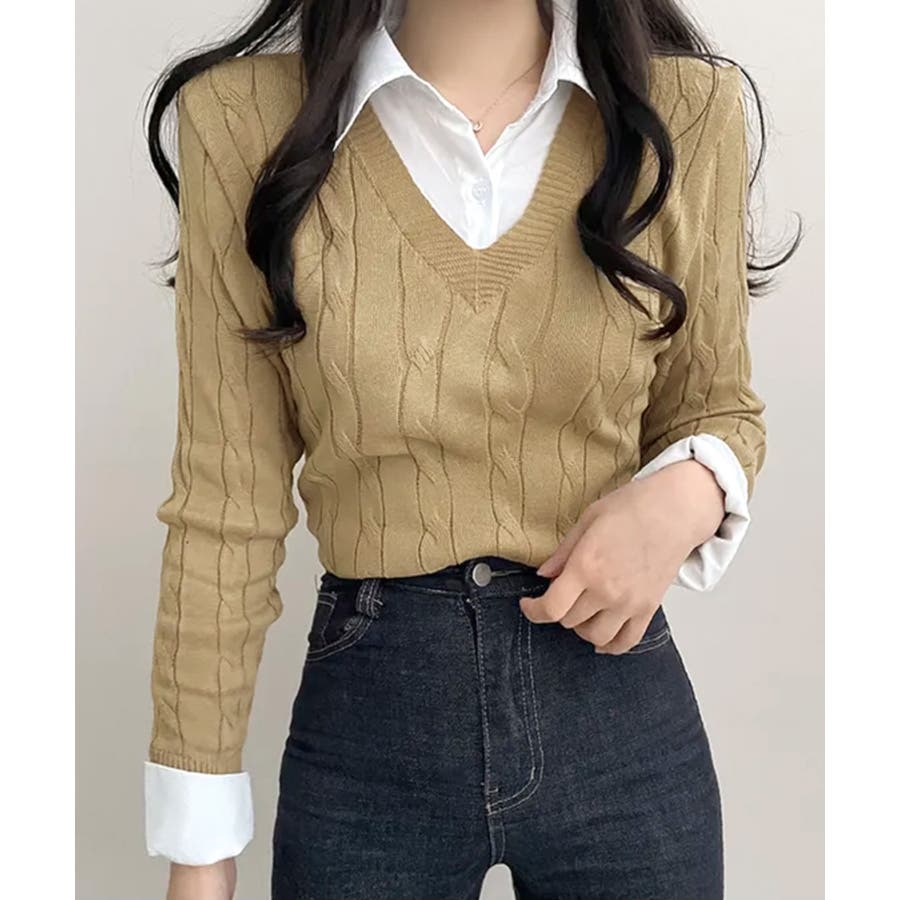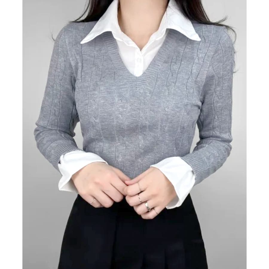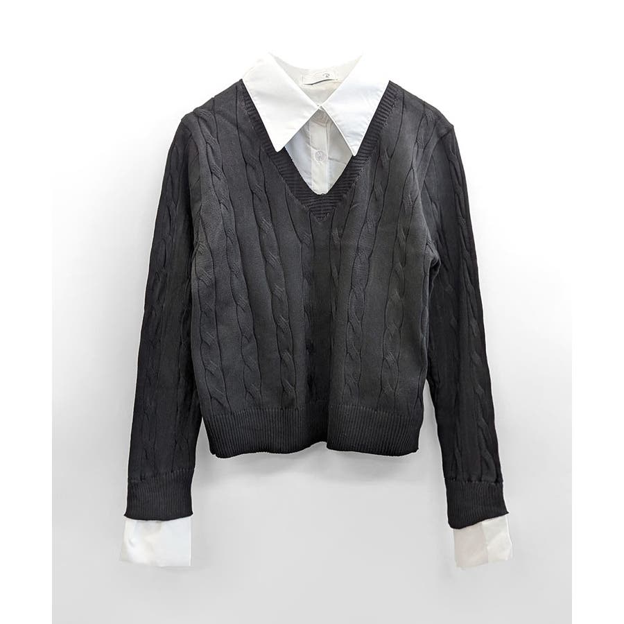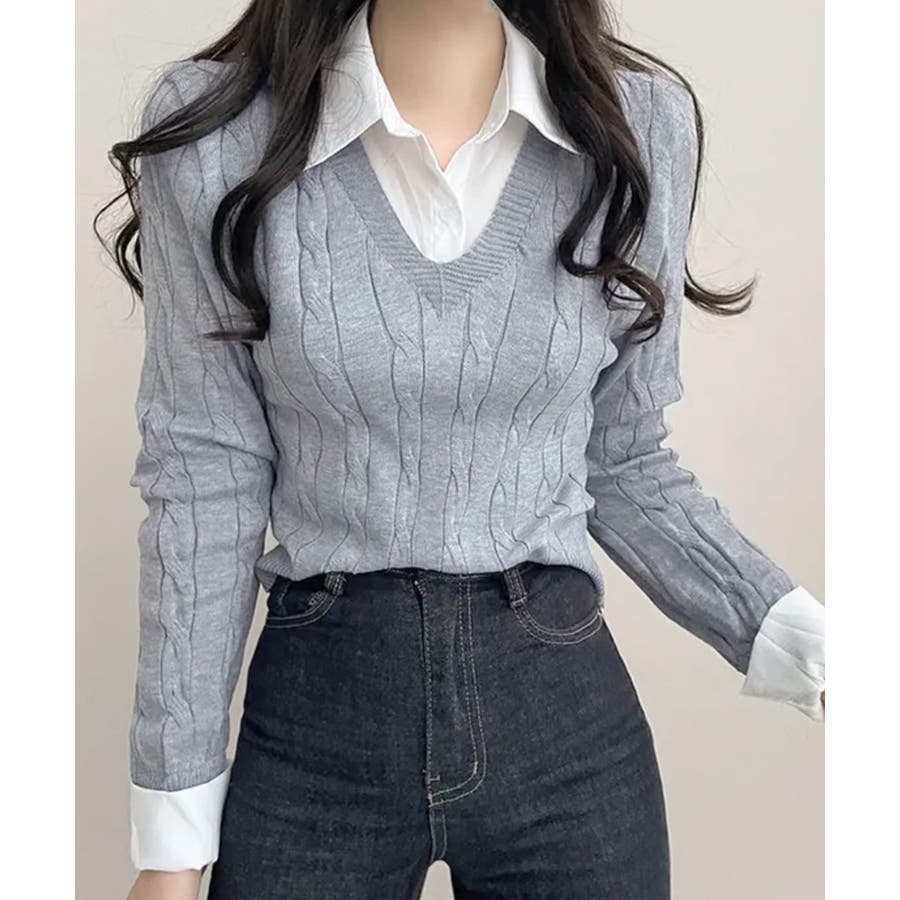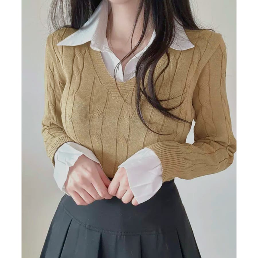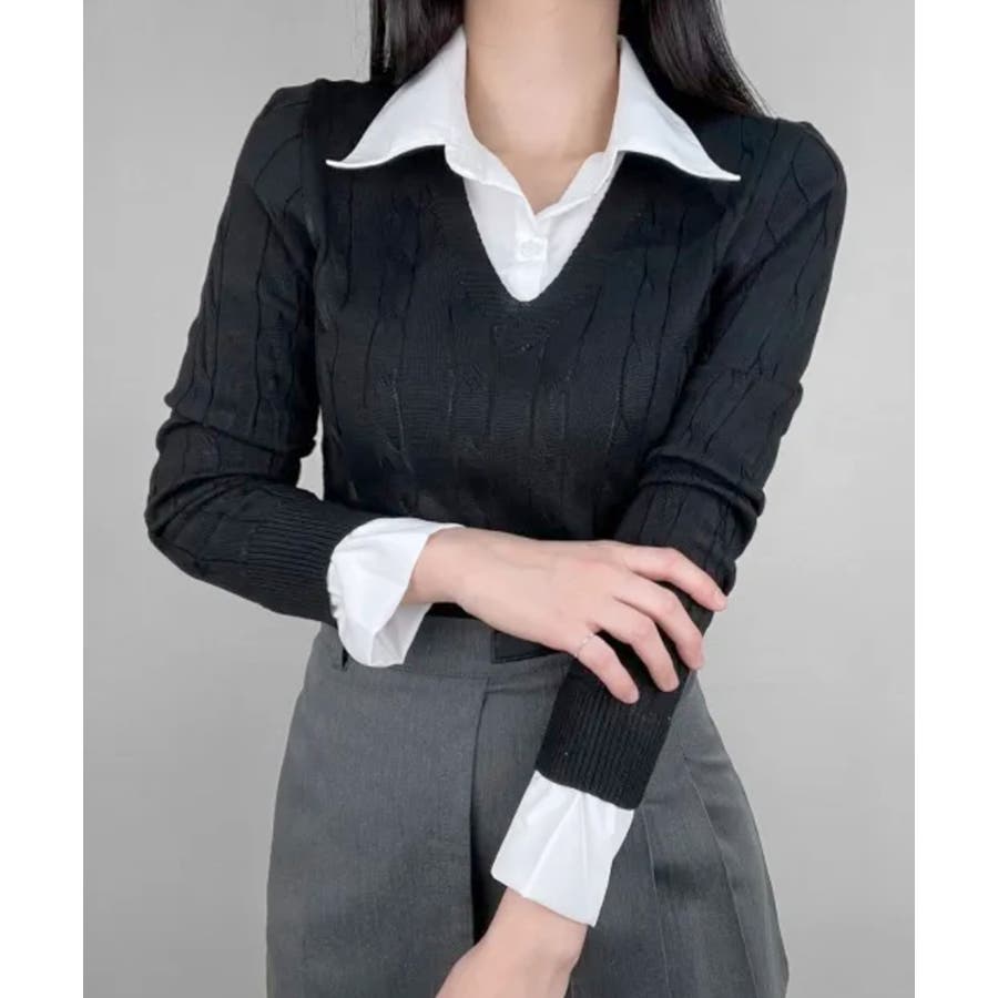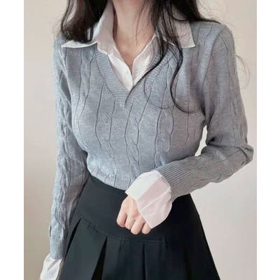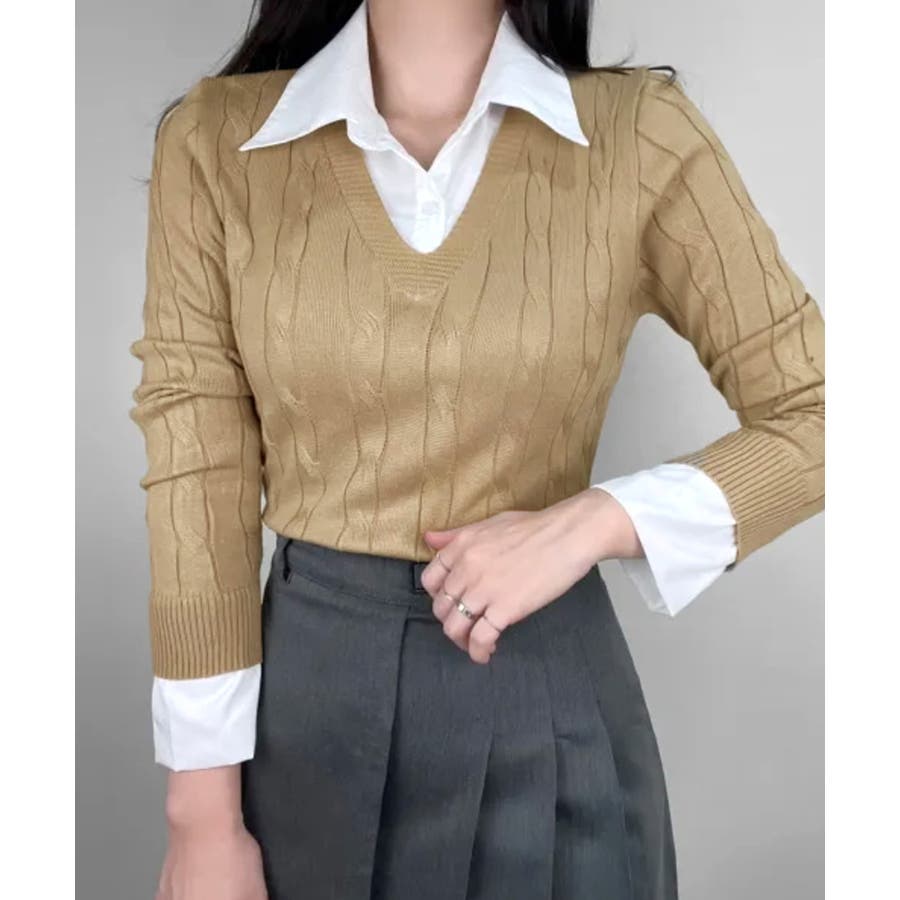 シャツレイヤード風ケーブルニット フェイクレイヤード ドッキング