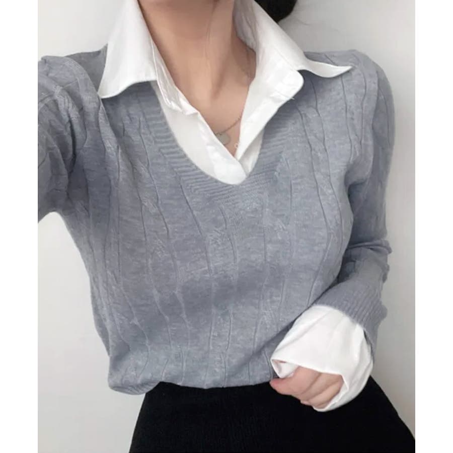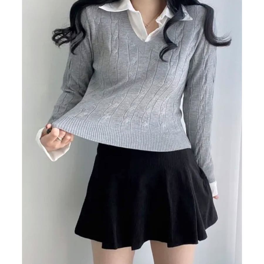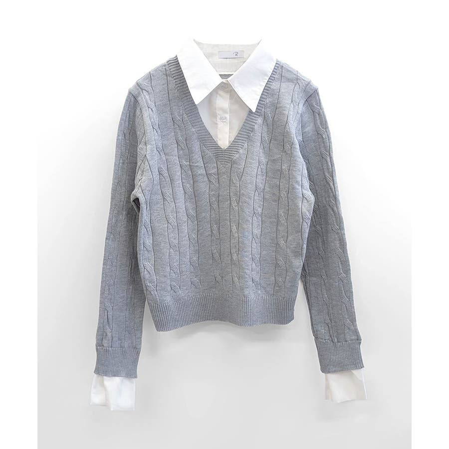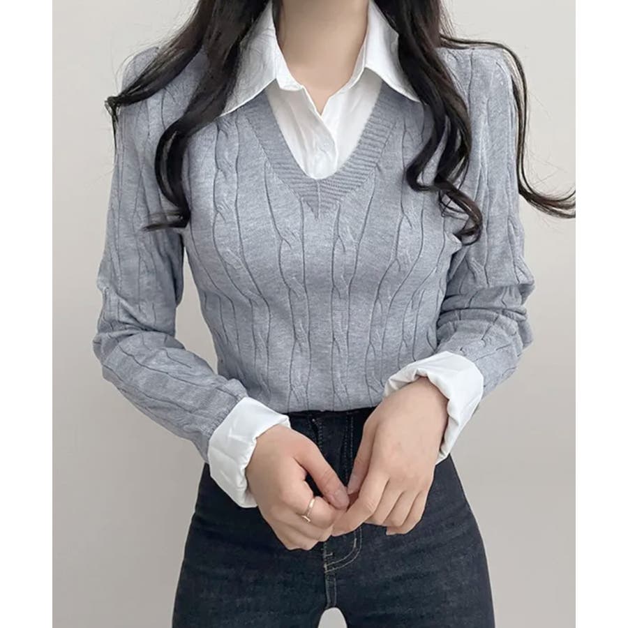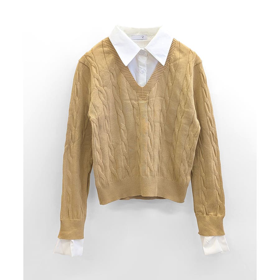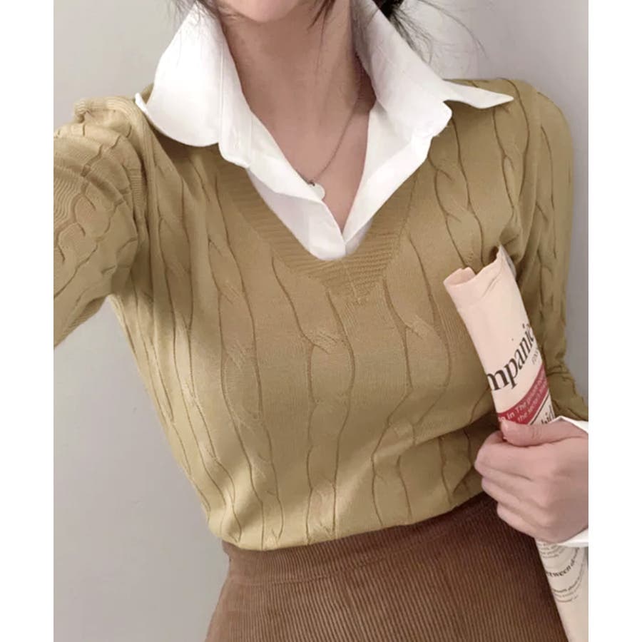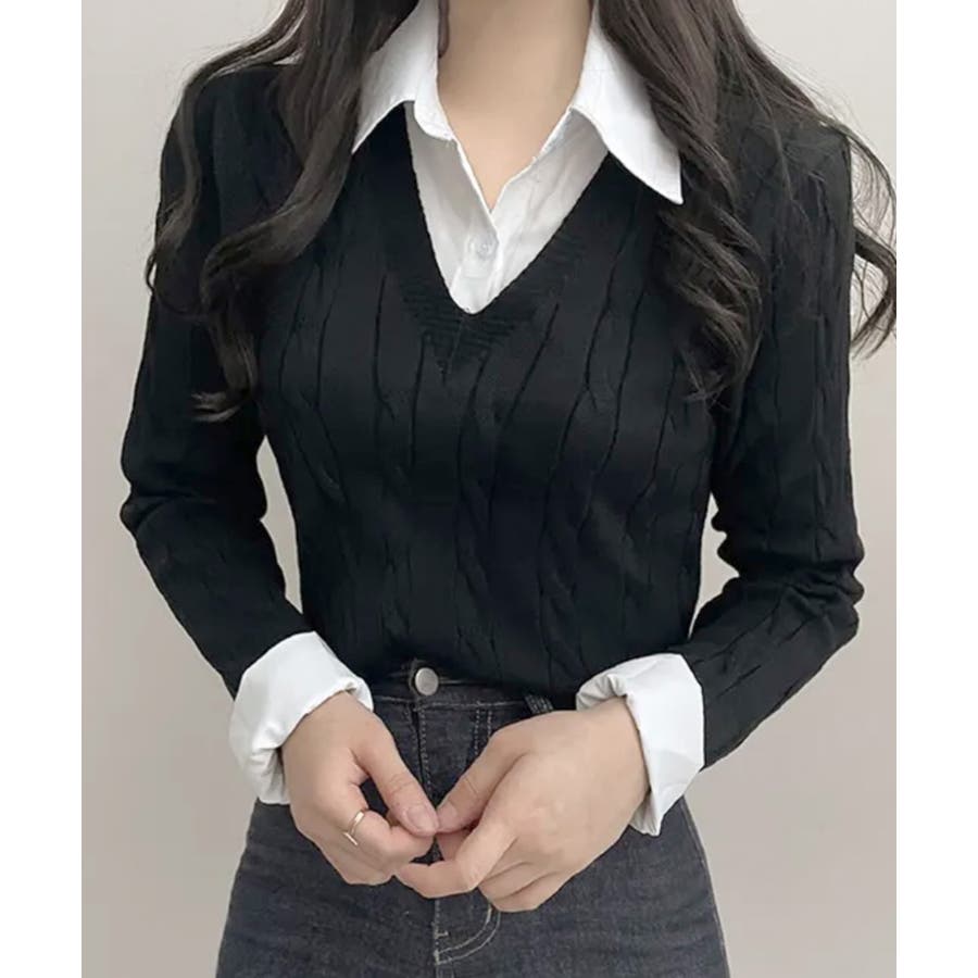 シャツレイヤード風ケーブルニット フェイクレイヤード ドッキング
