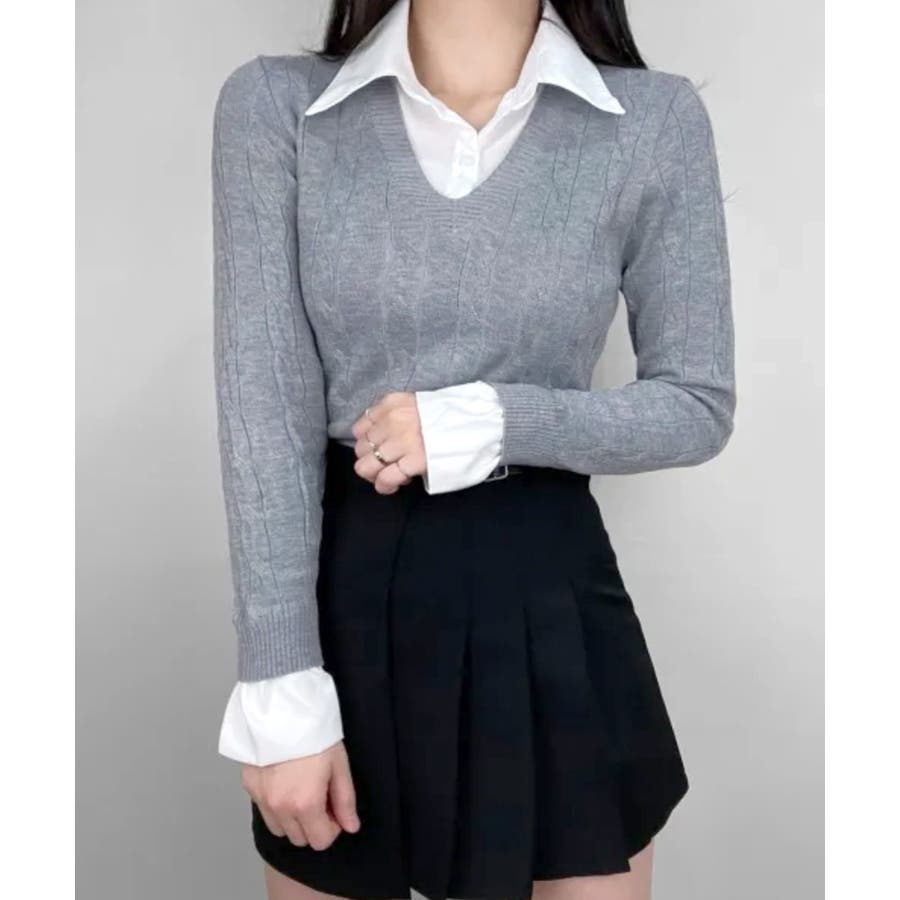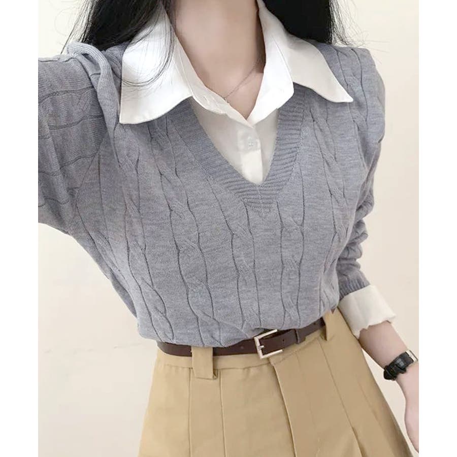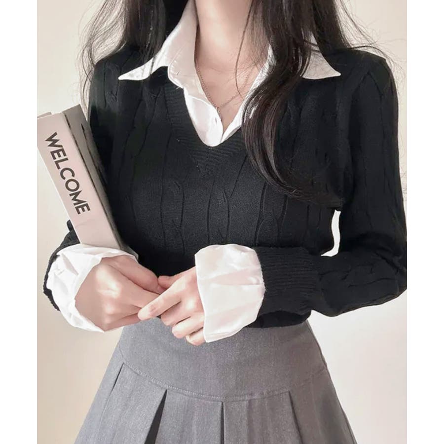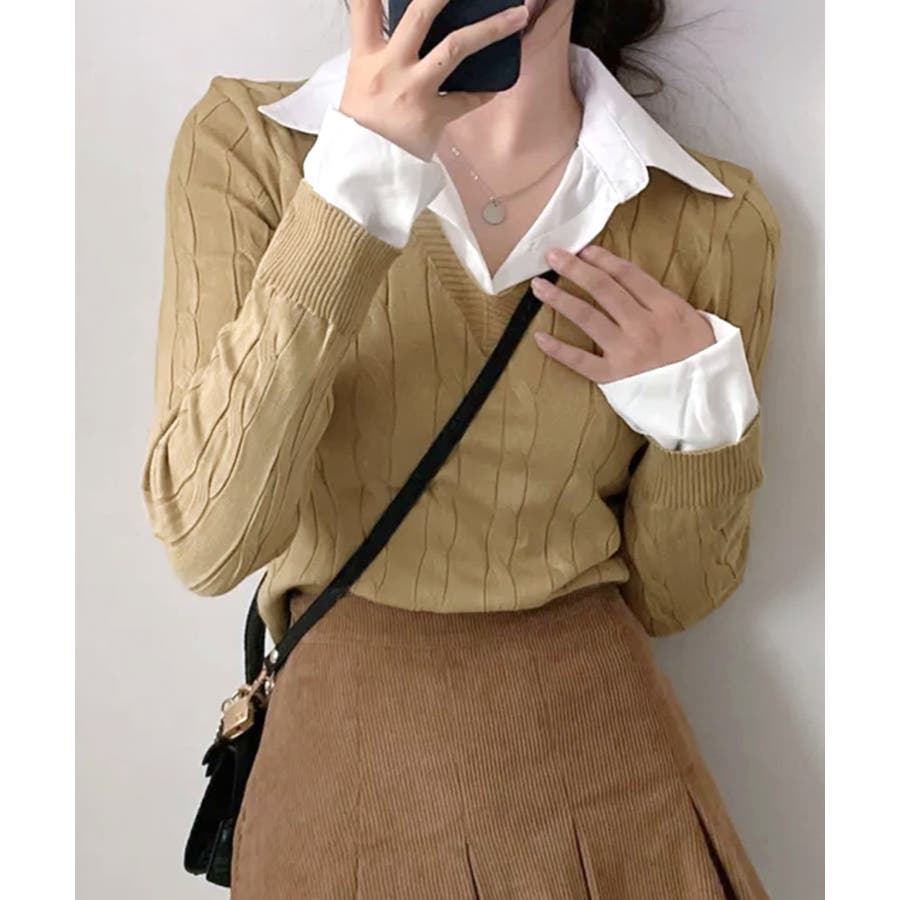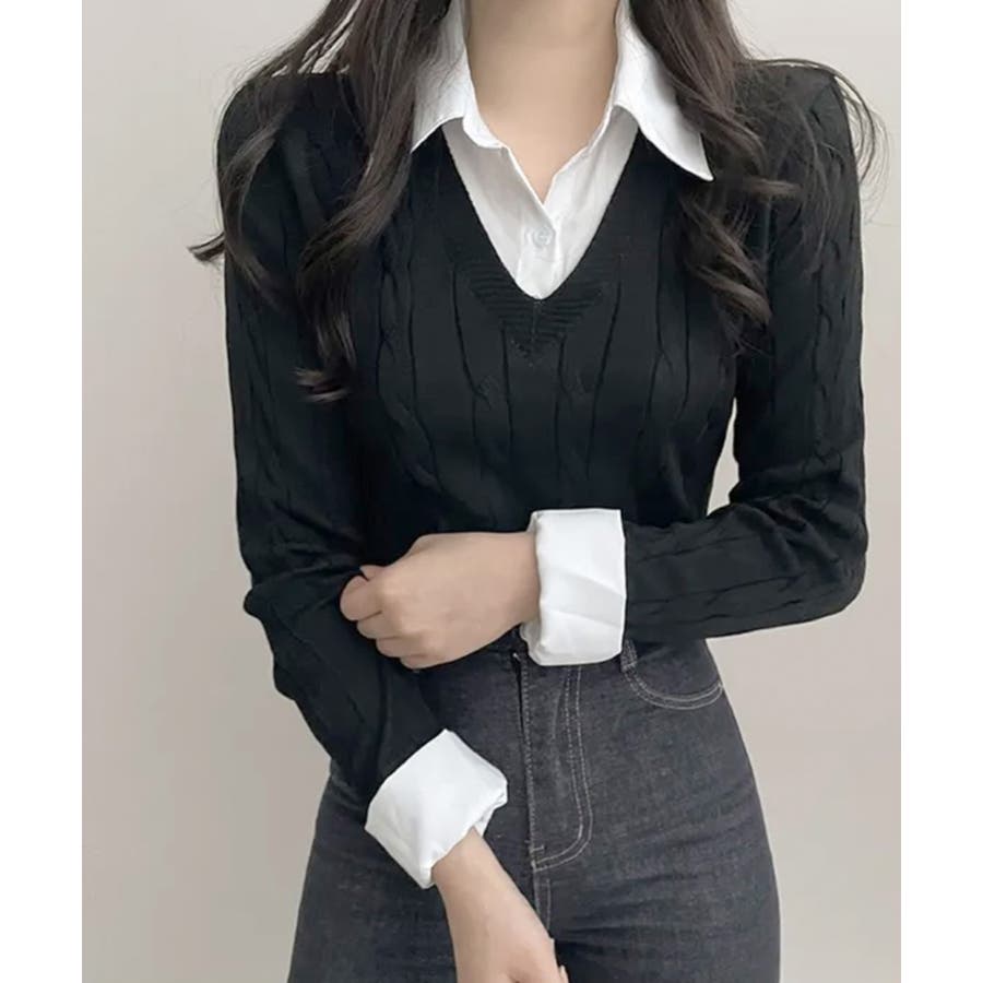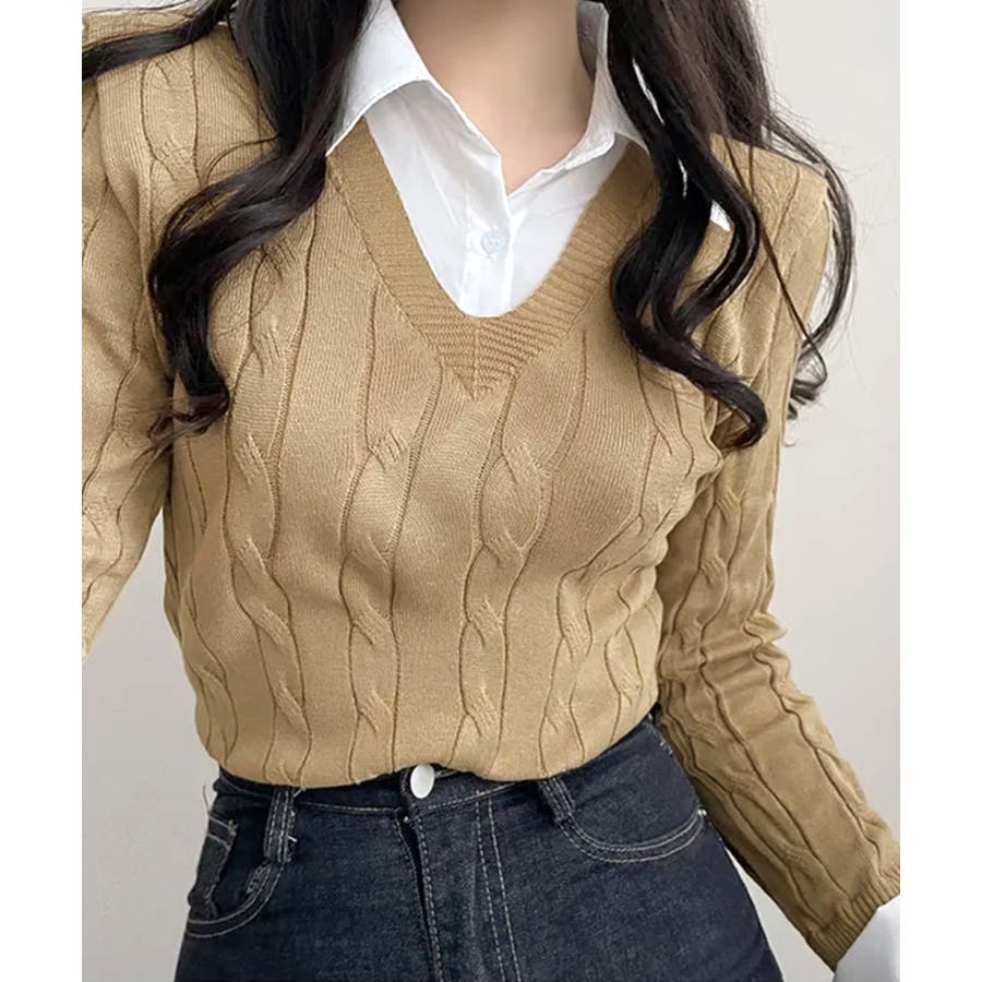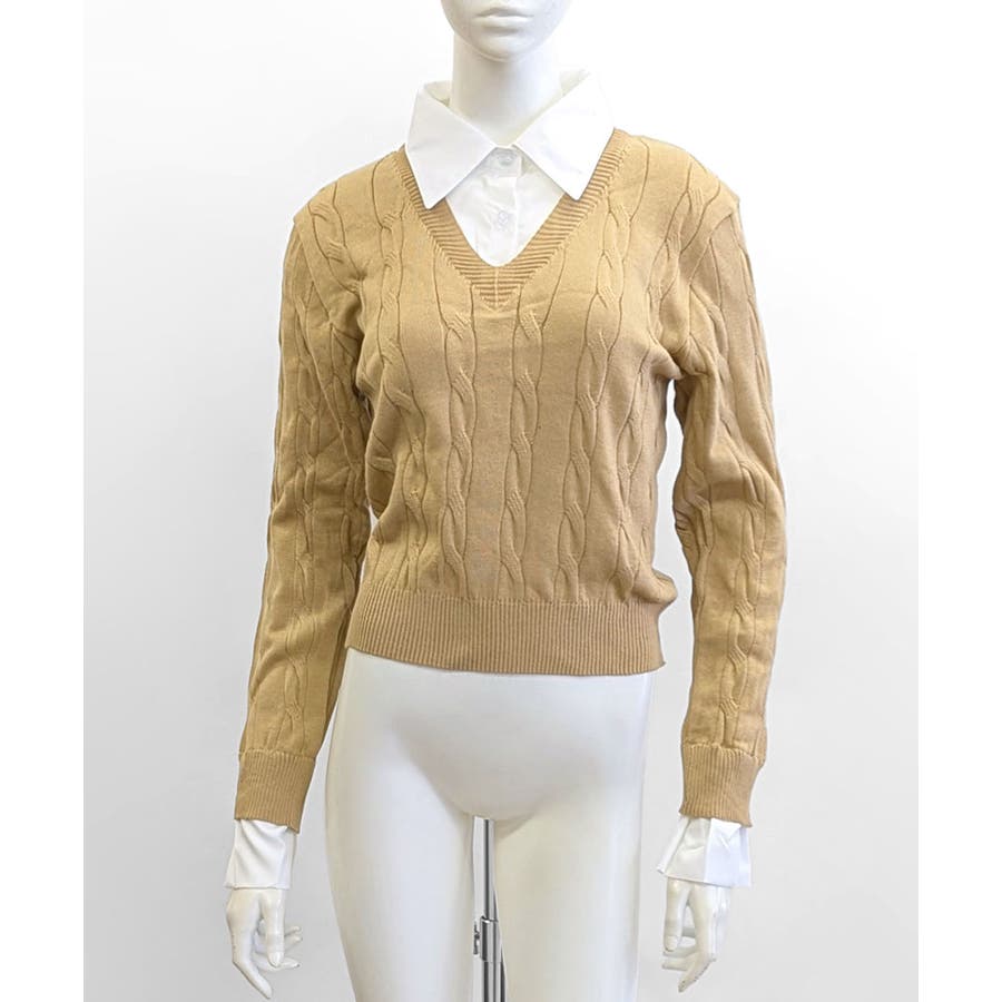 シャツレイヤード風ケーブルニット フェイクレイヤード ドッキング