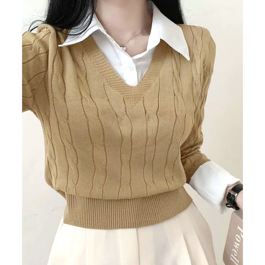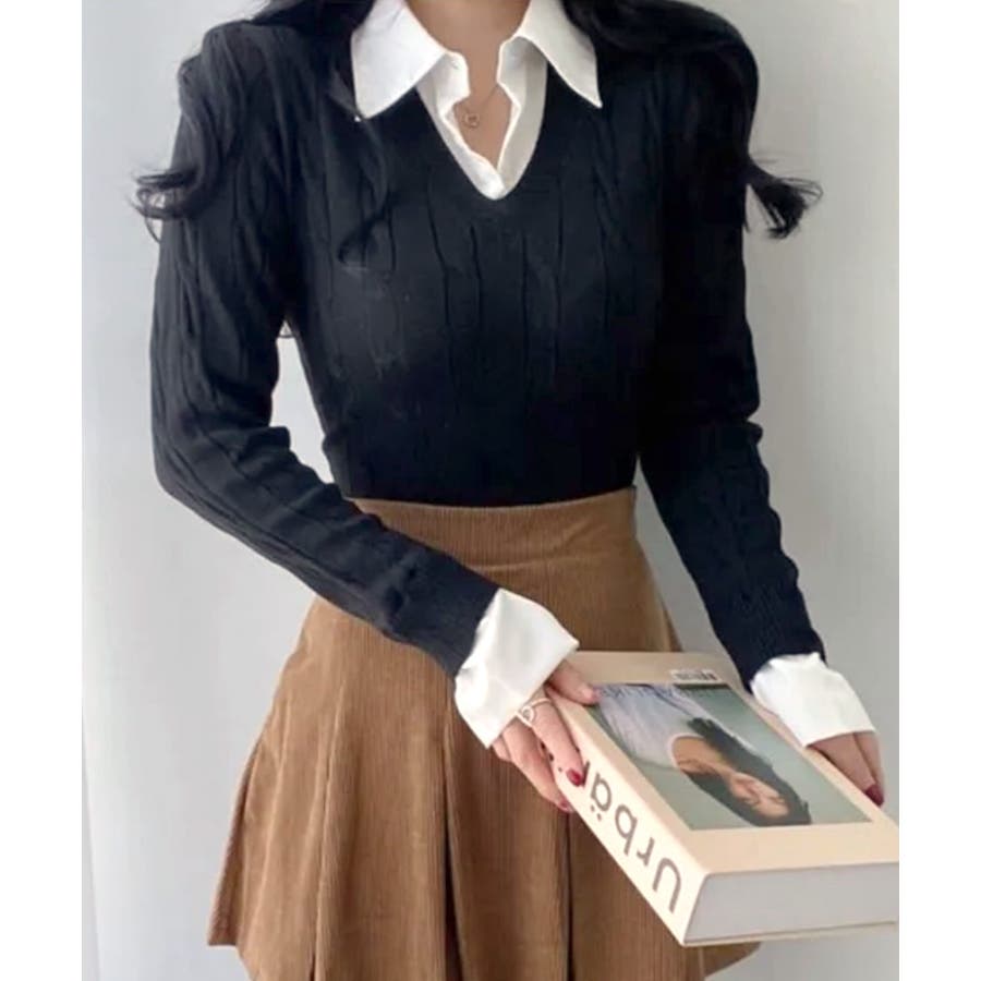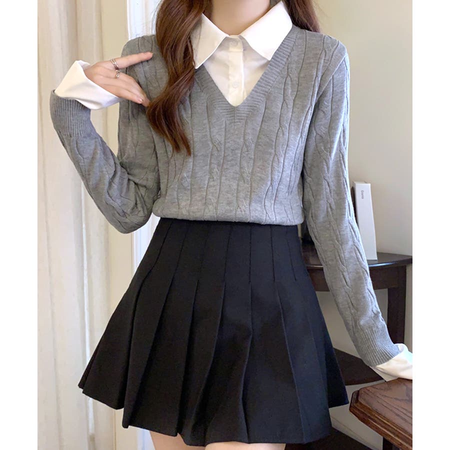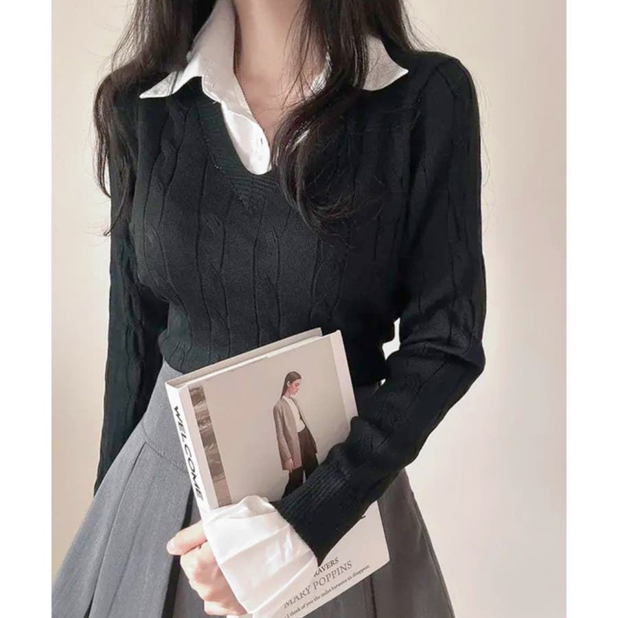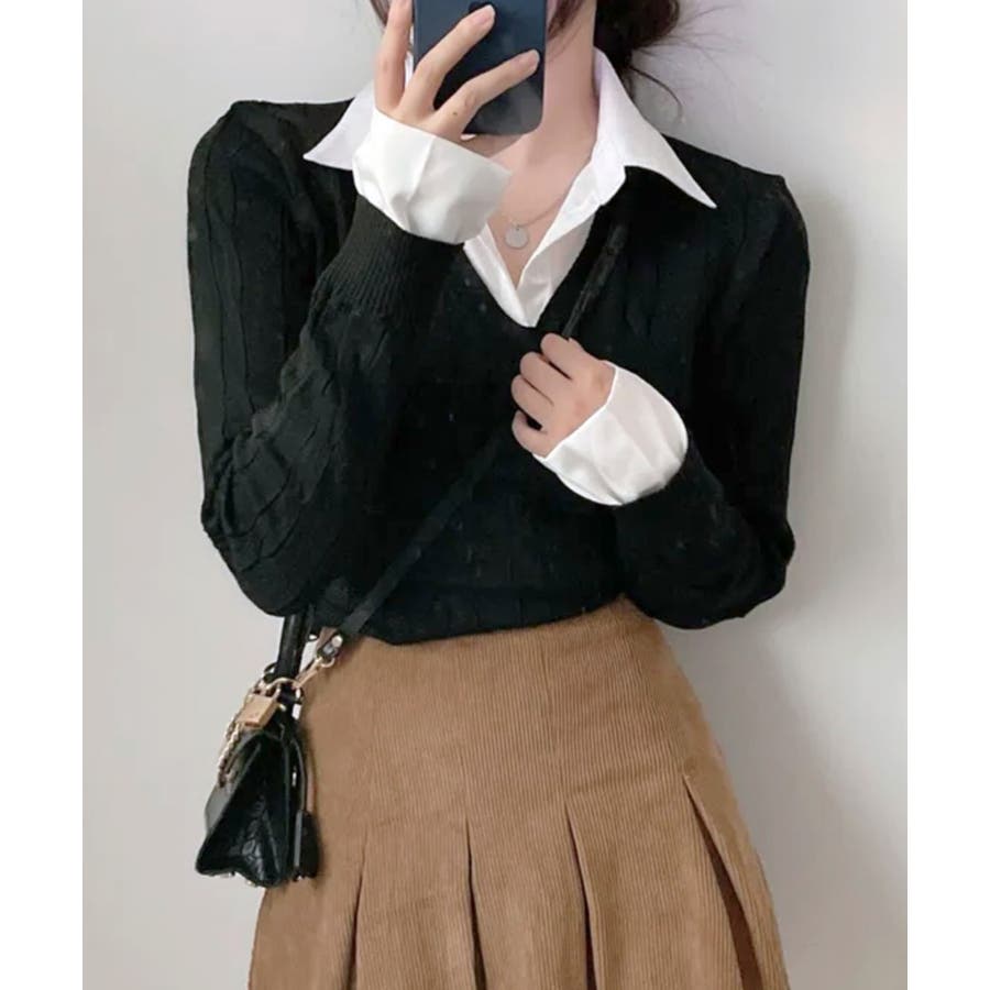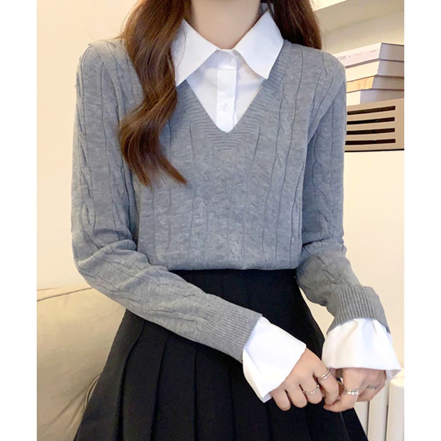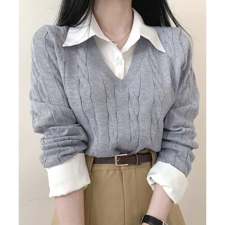 シャツレイヤード風ケーブルニット フェイクレイヤード ドッキング