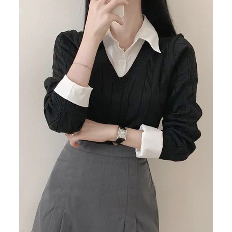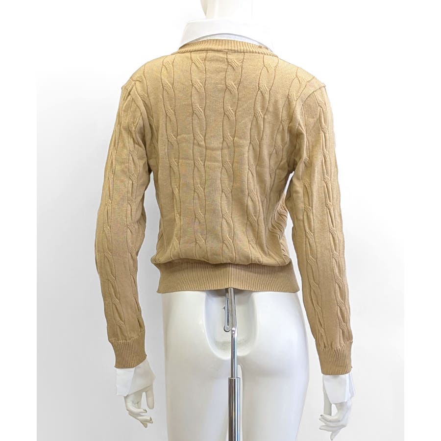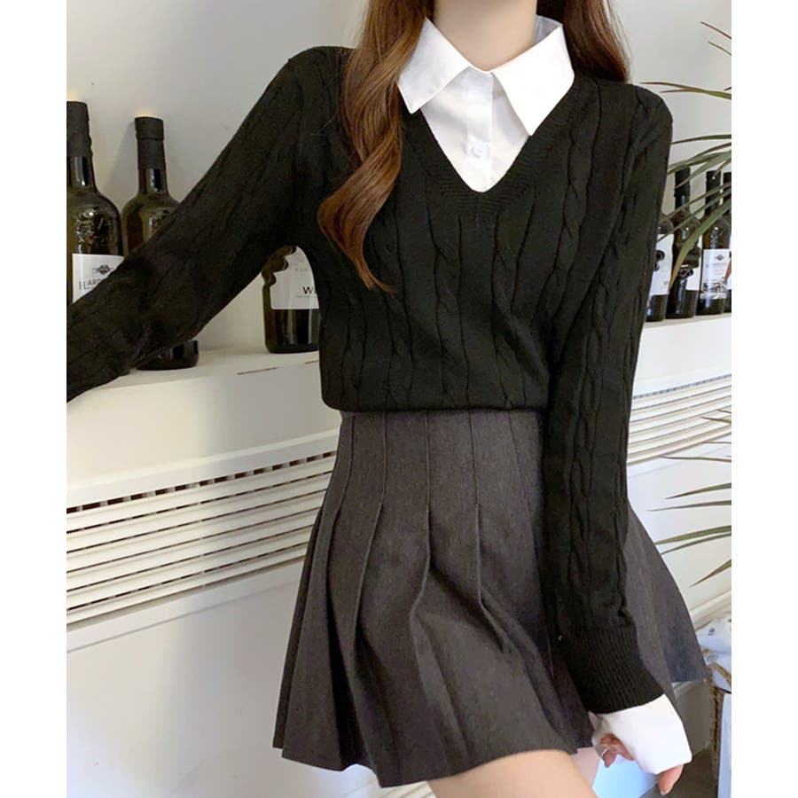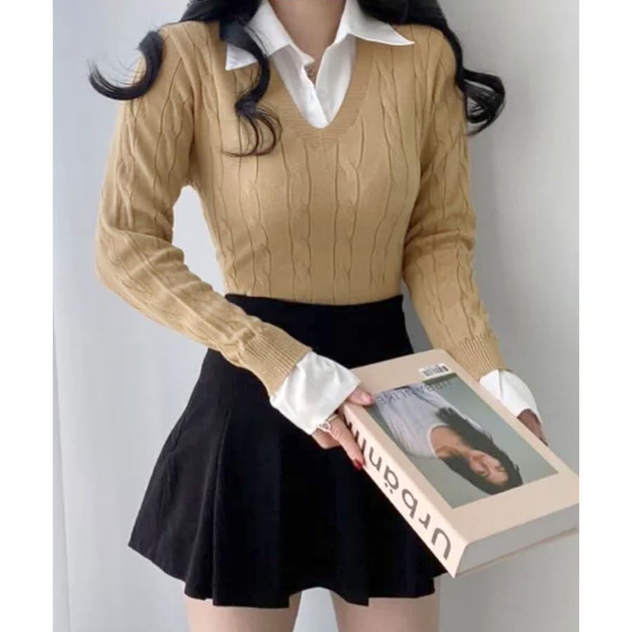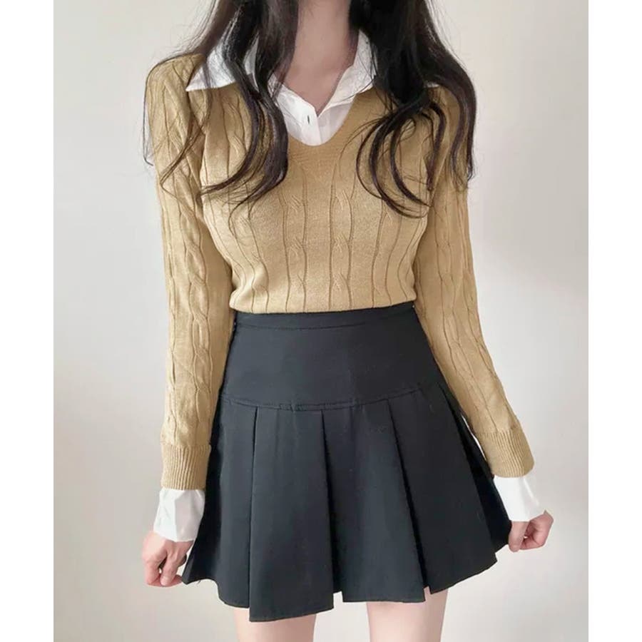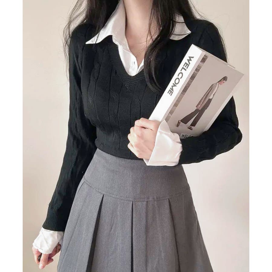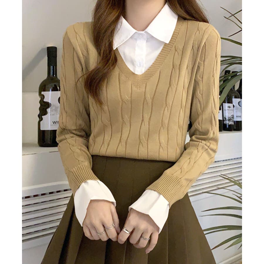 シャツレイヤード風ケーブルニット フェイクレイヤード ドッキング