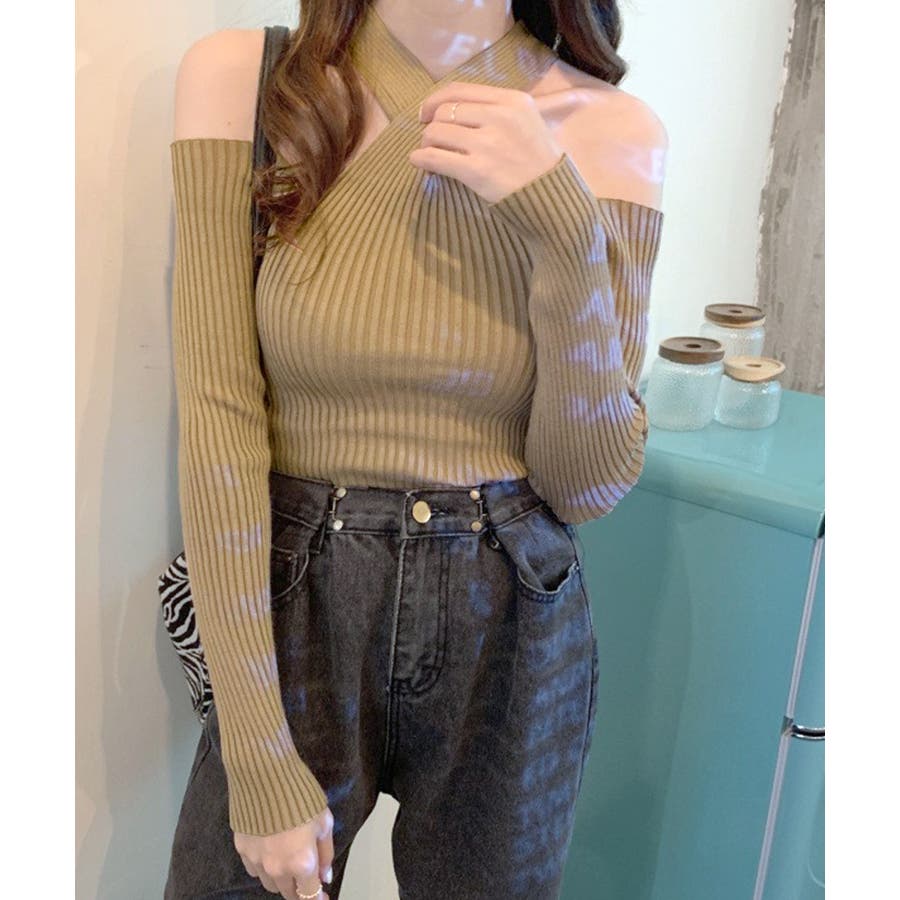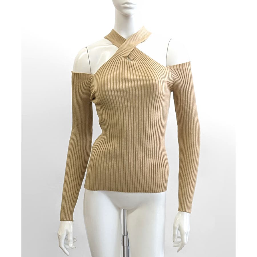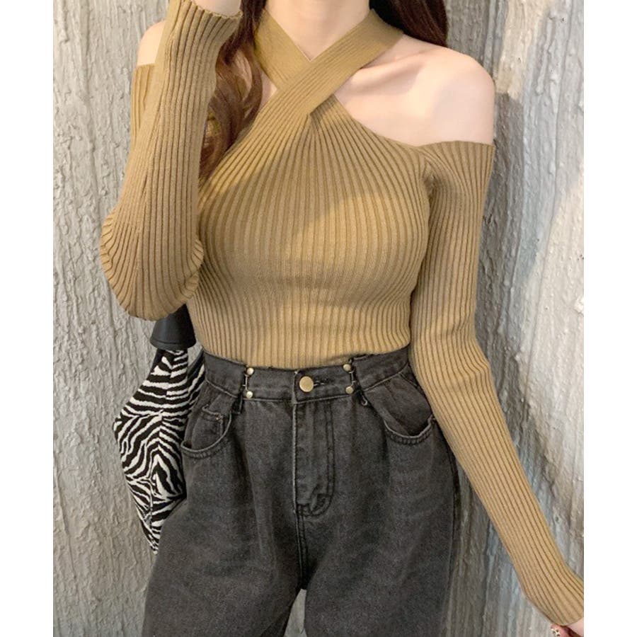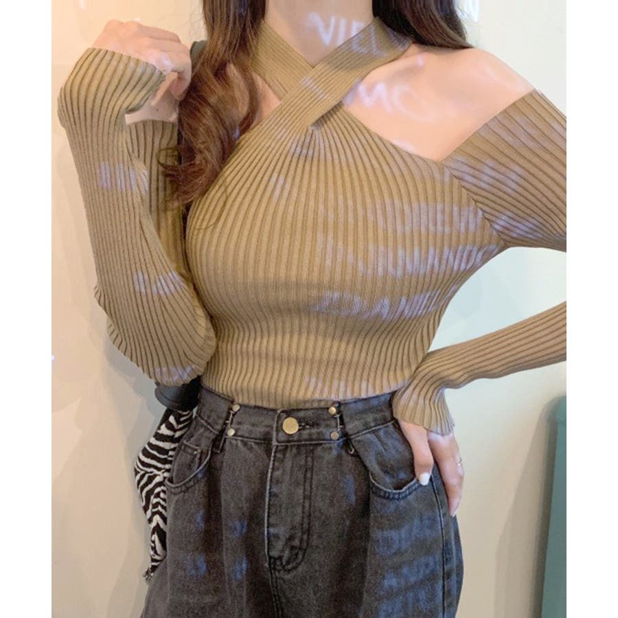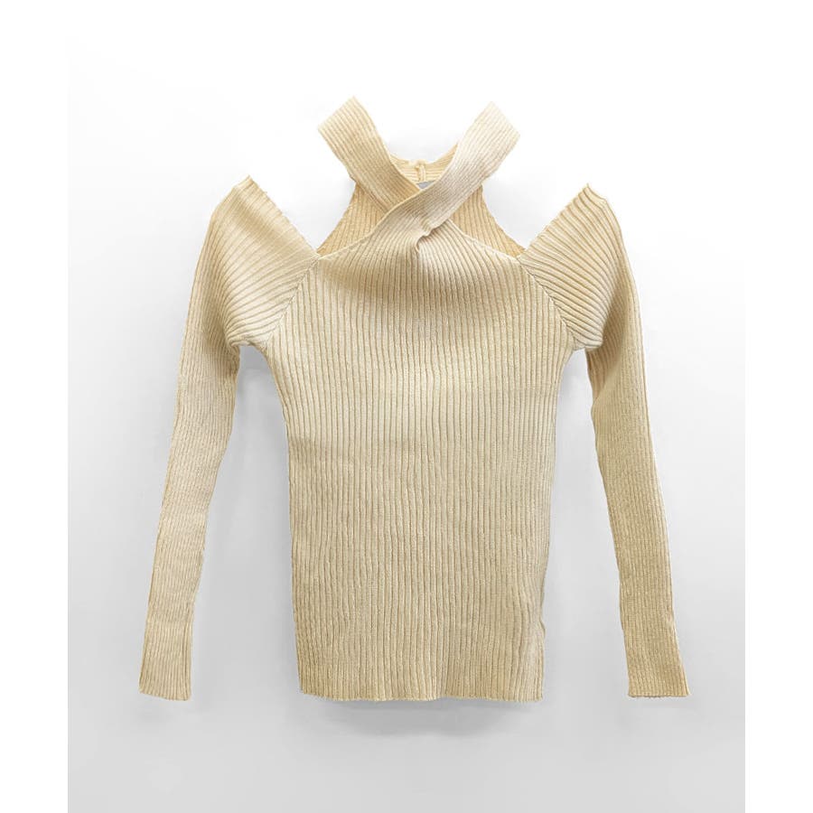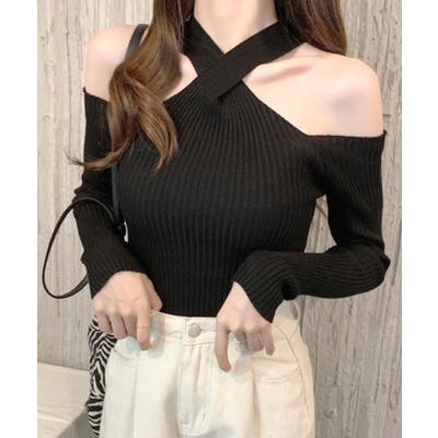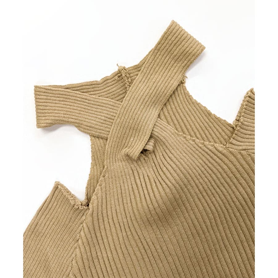 クロスホルターネックオフショルリブニット オフショルダー リブ編み