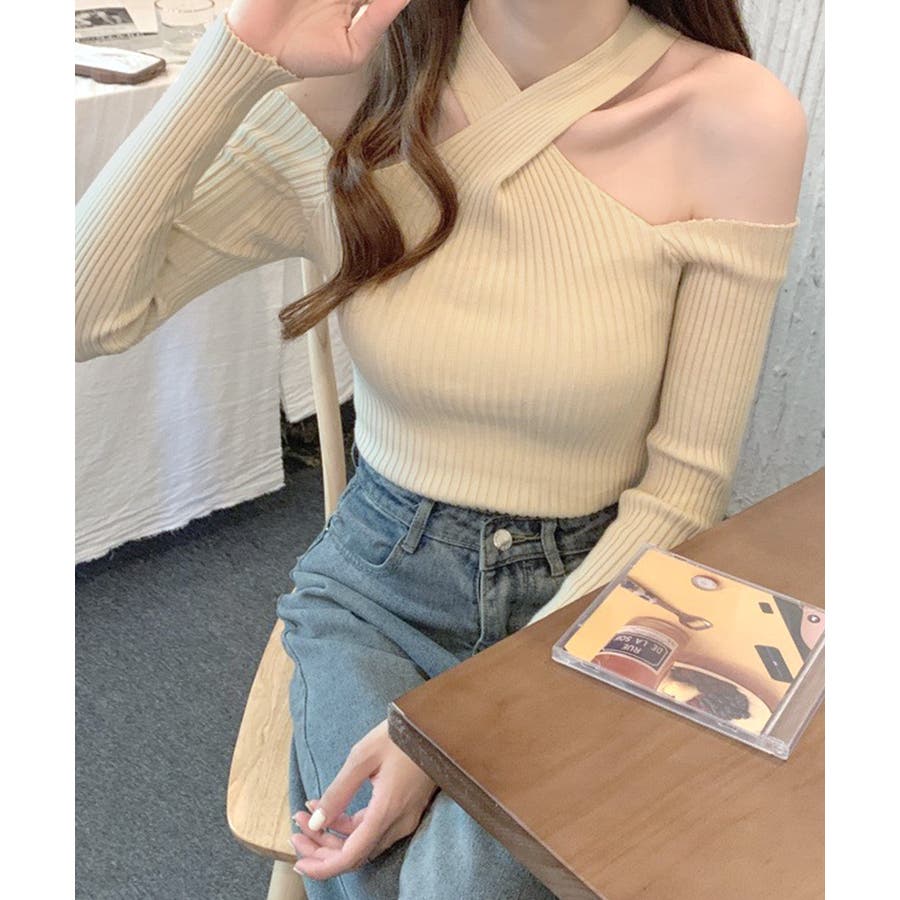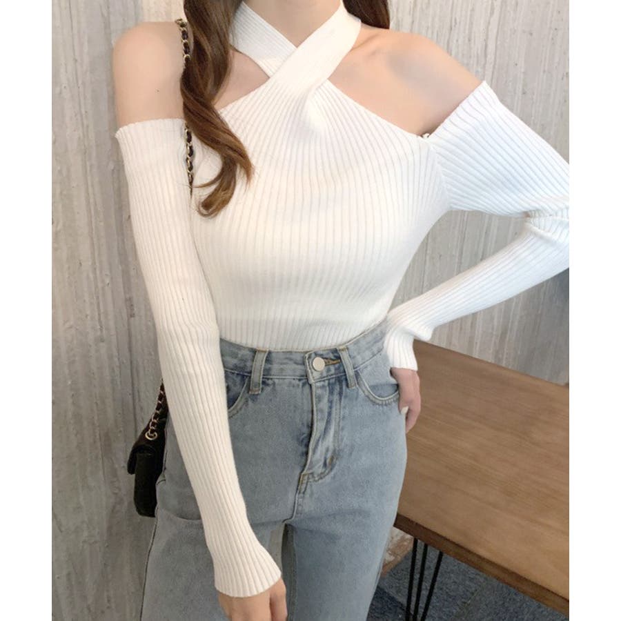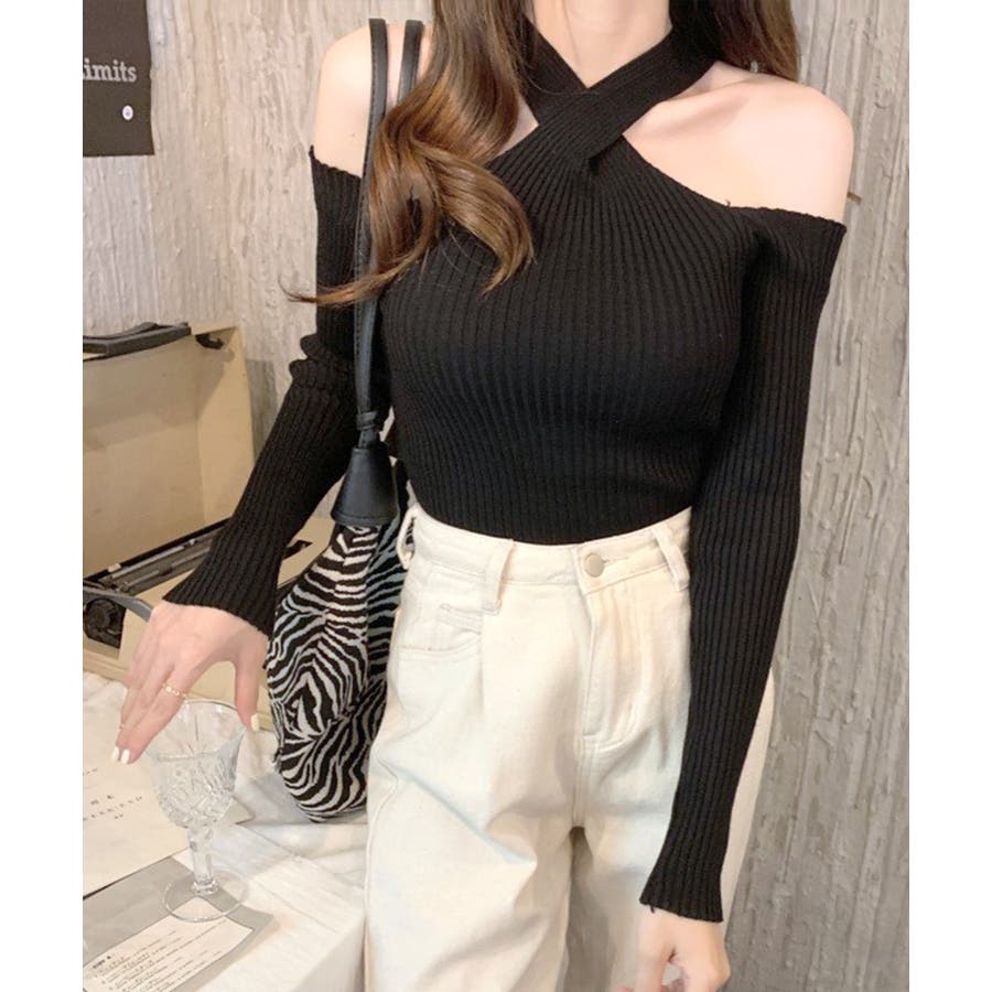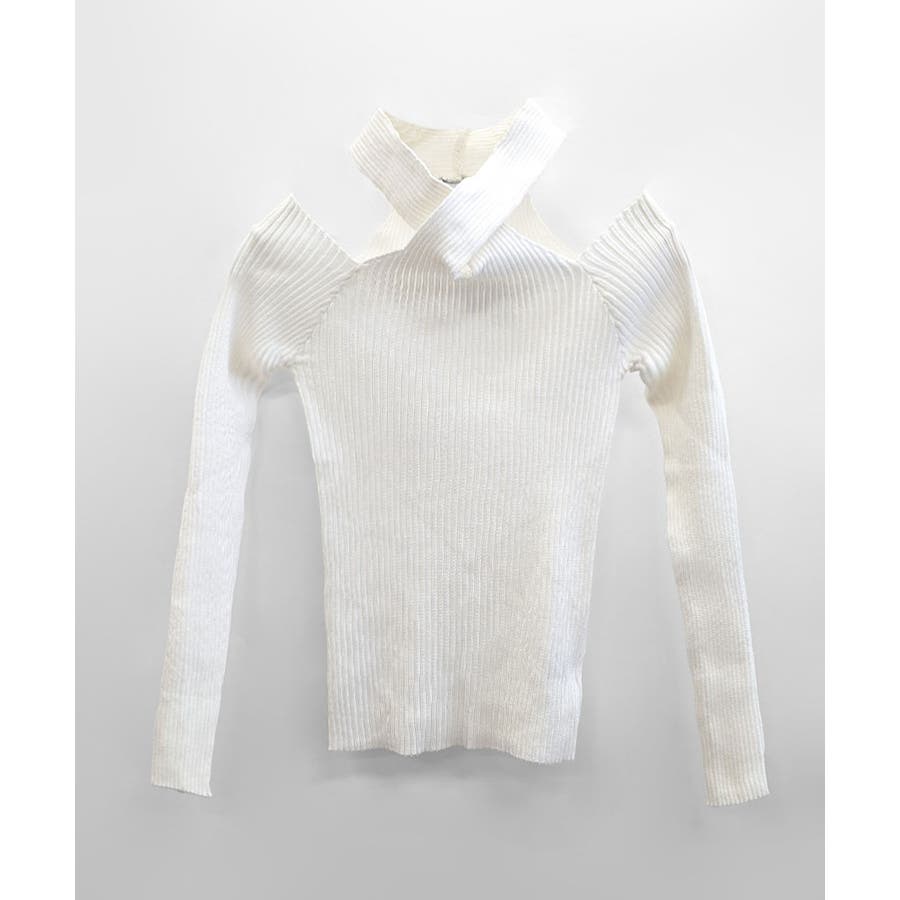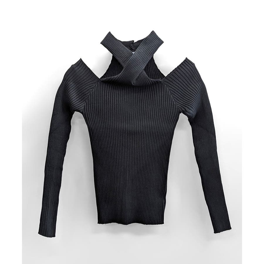 クロスホルターネックオフショルリブニット オフショルダー リブ編み