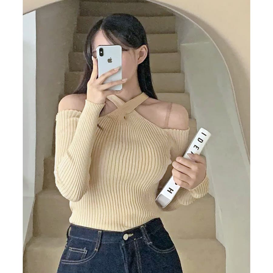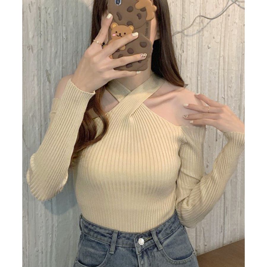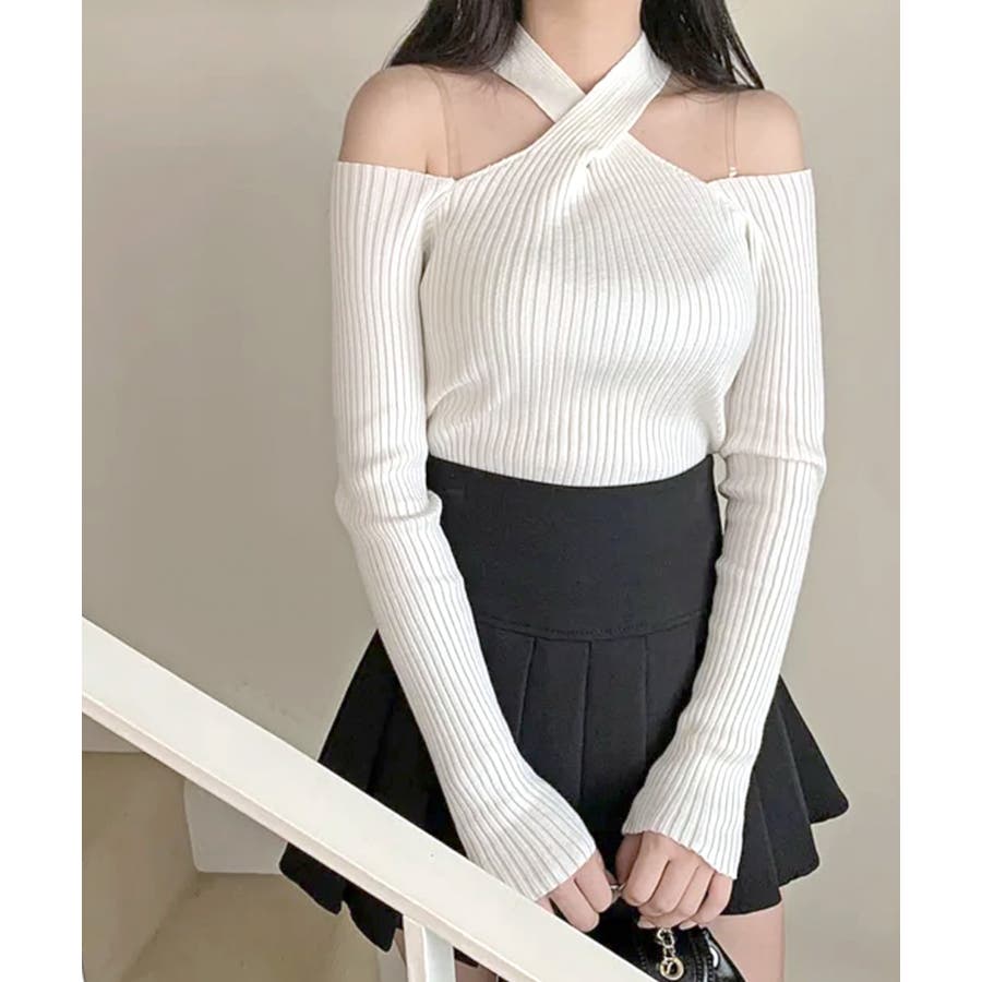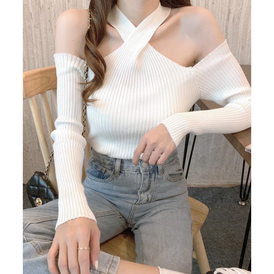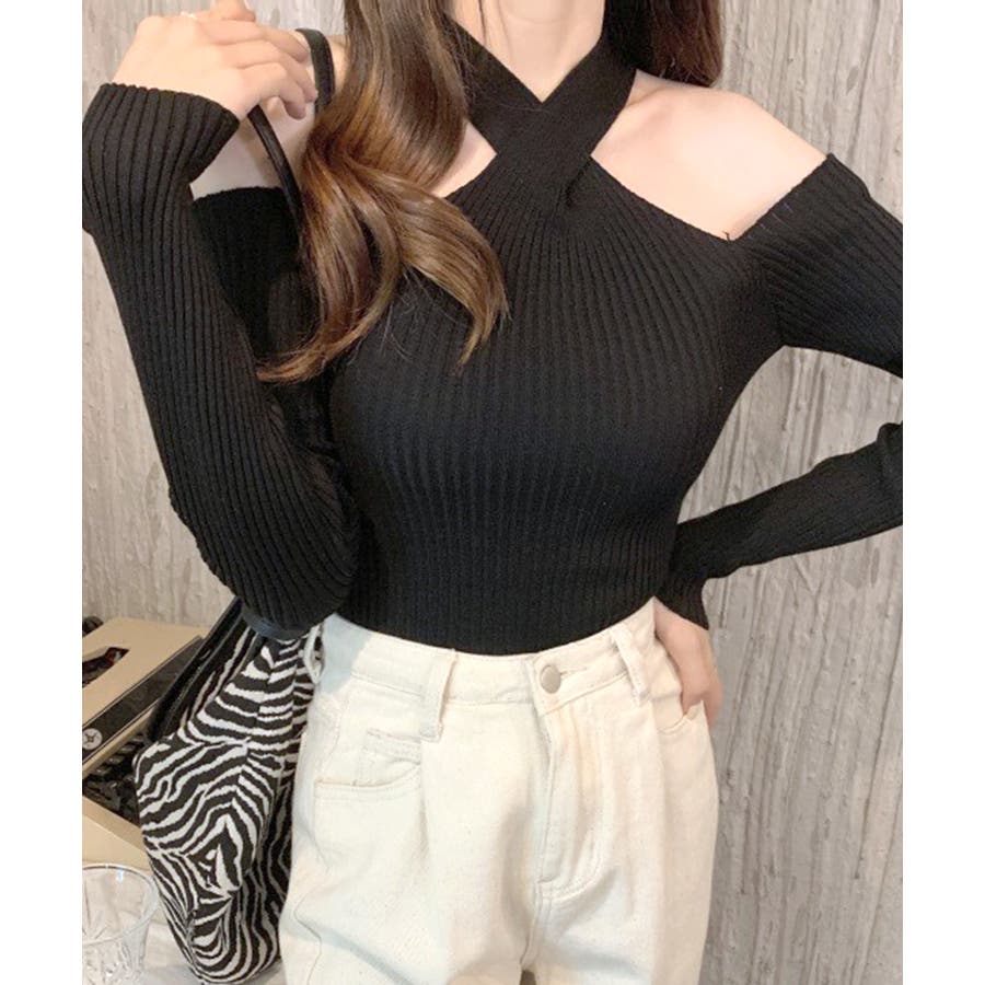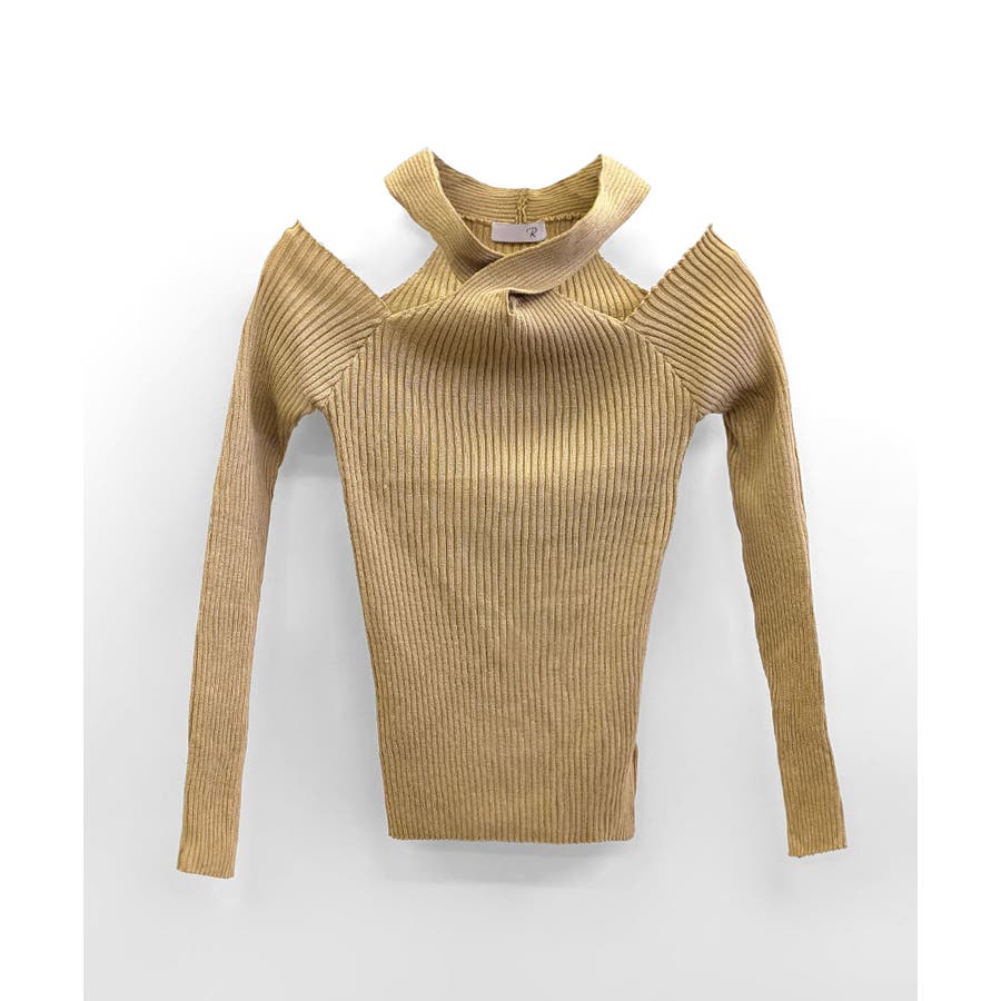 クロスホルターネックオフショルリブニット オフショルダー リブ編み