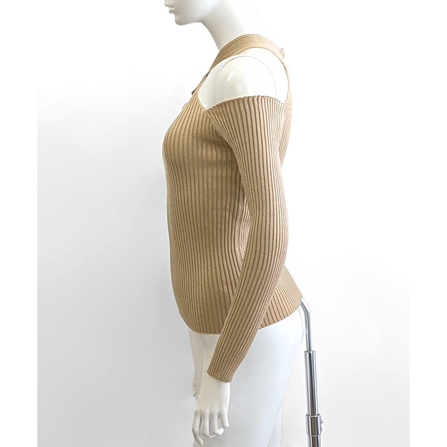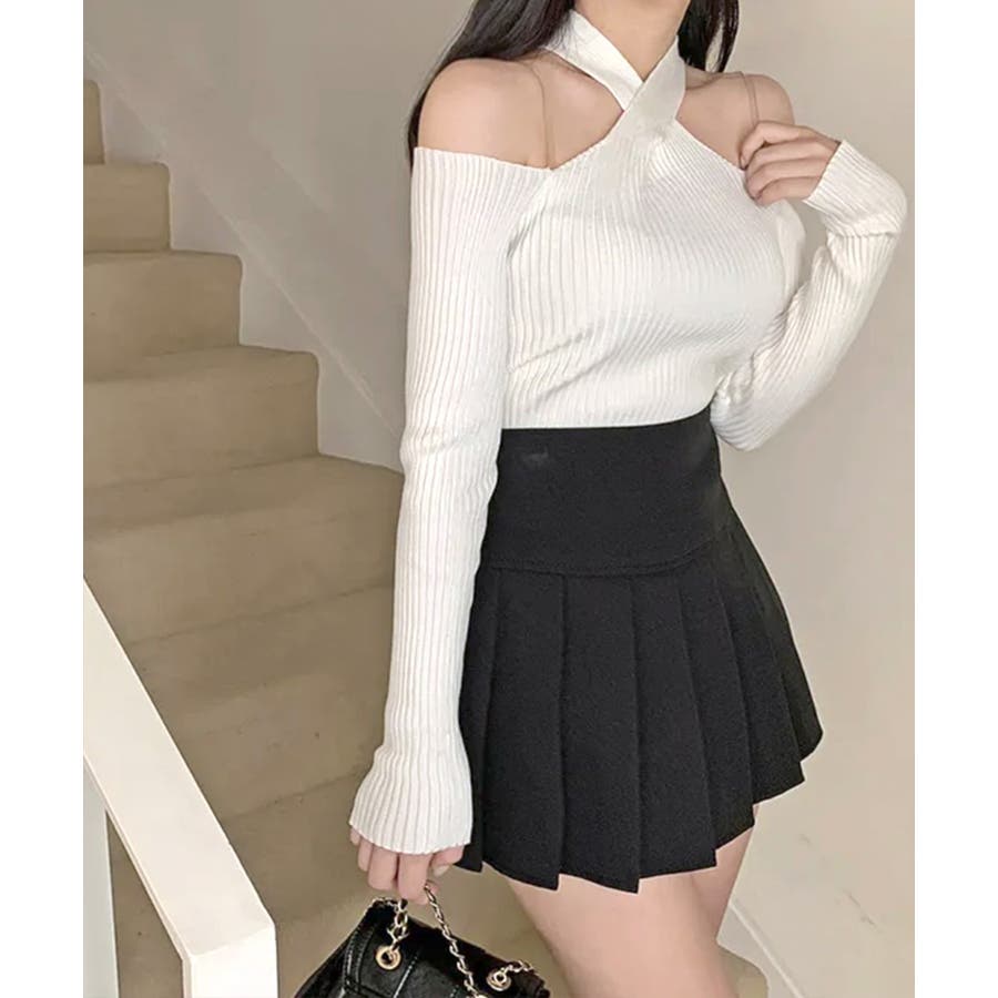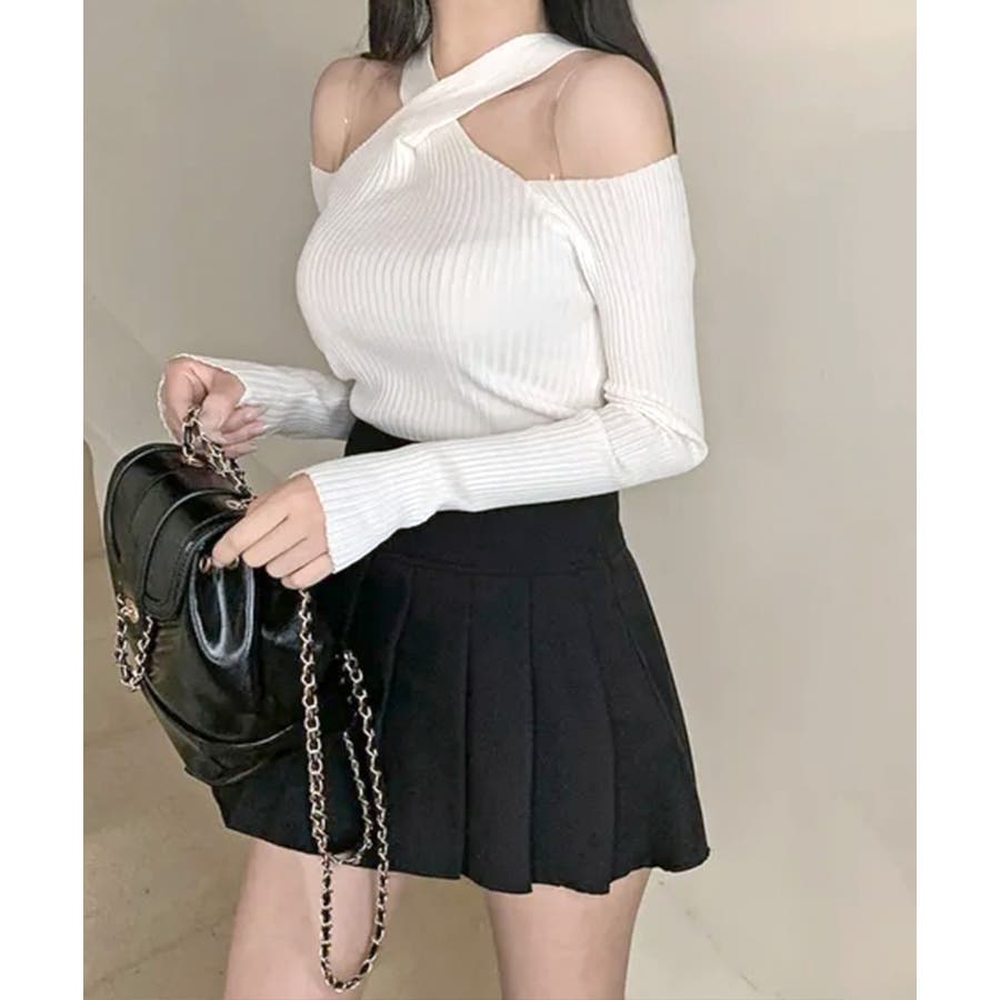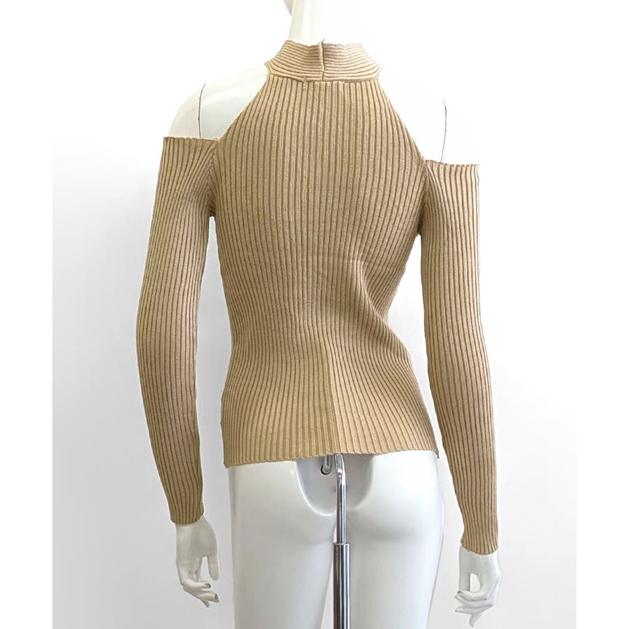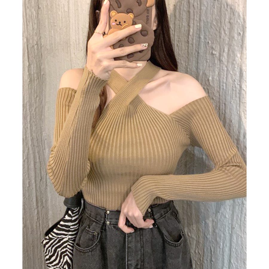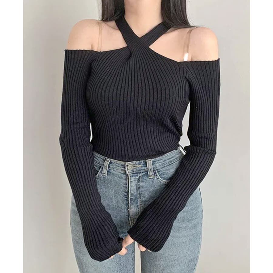 クロスホルターネックオフショルリブニット オフショルダー リブ編み