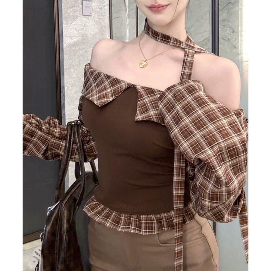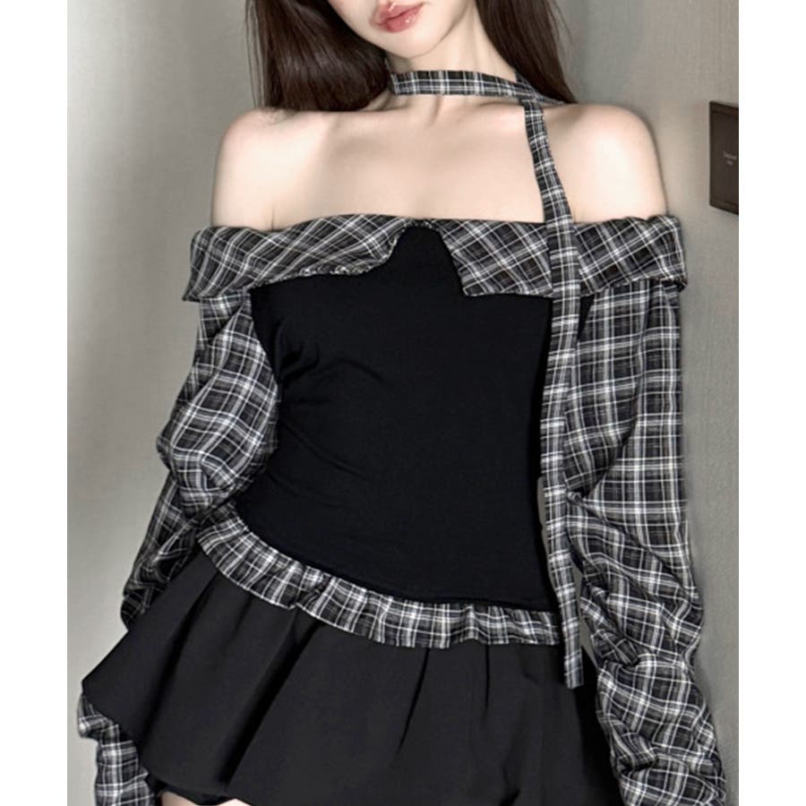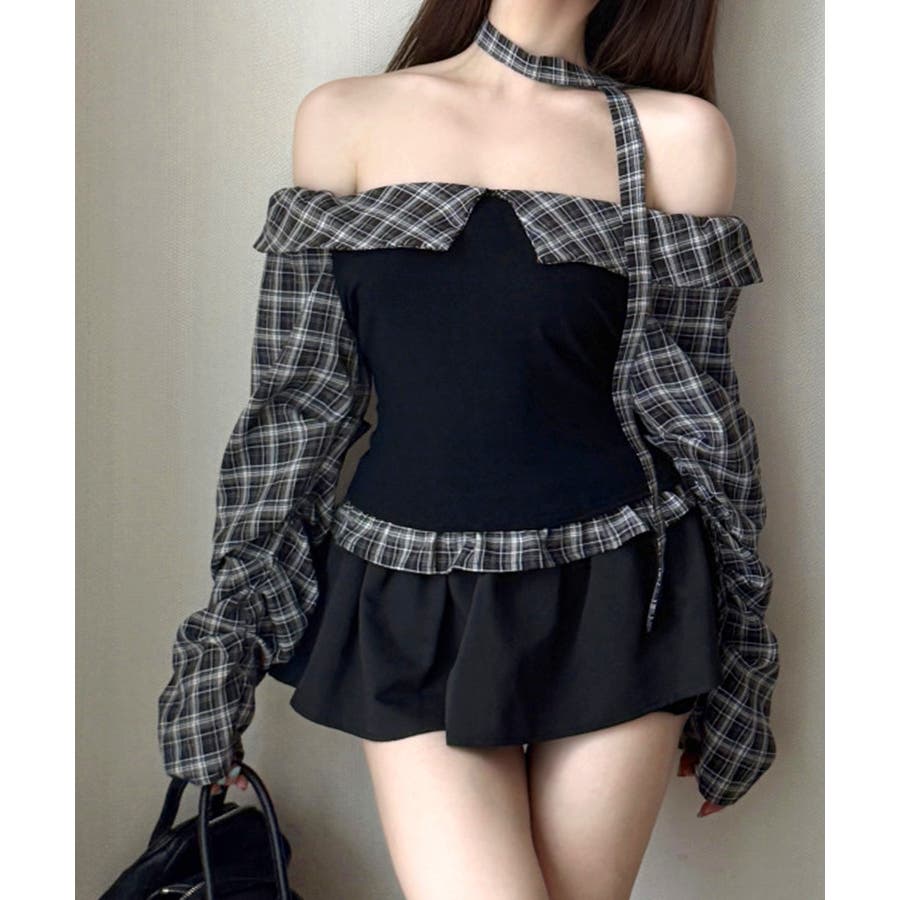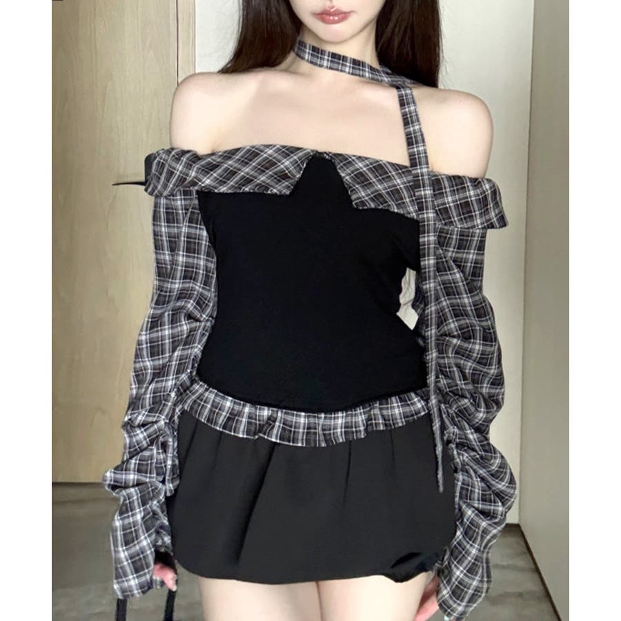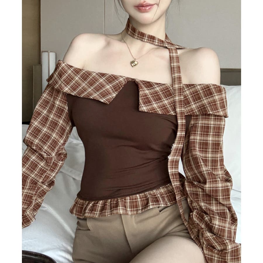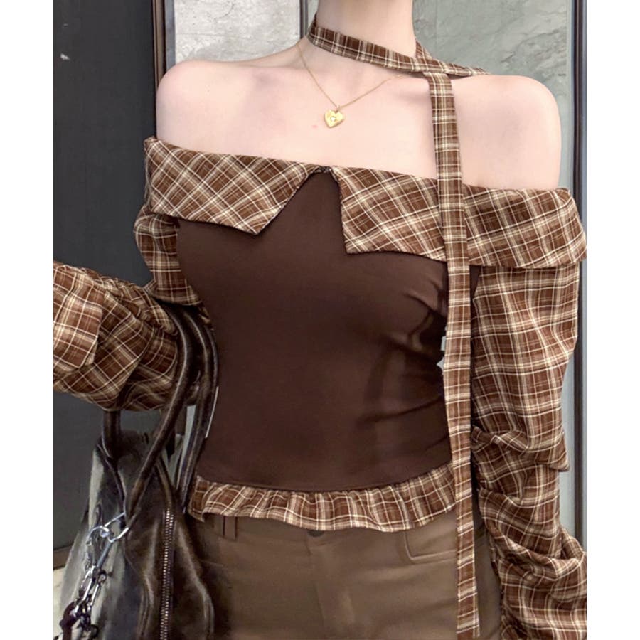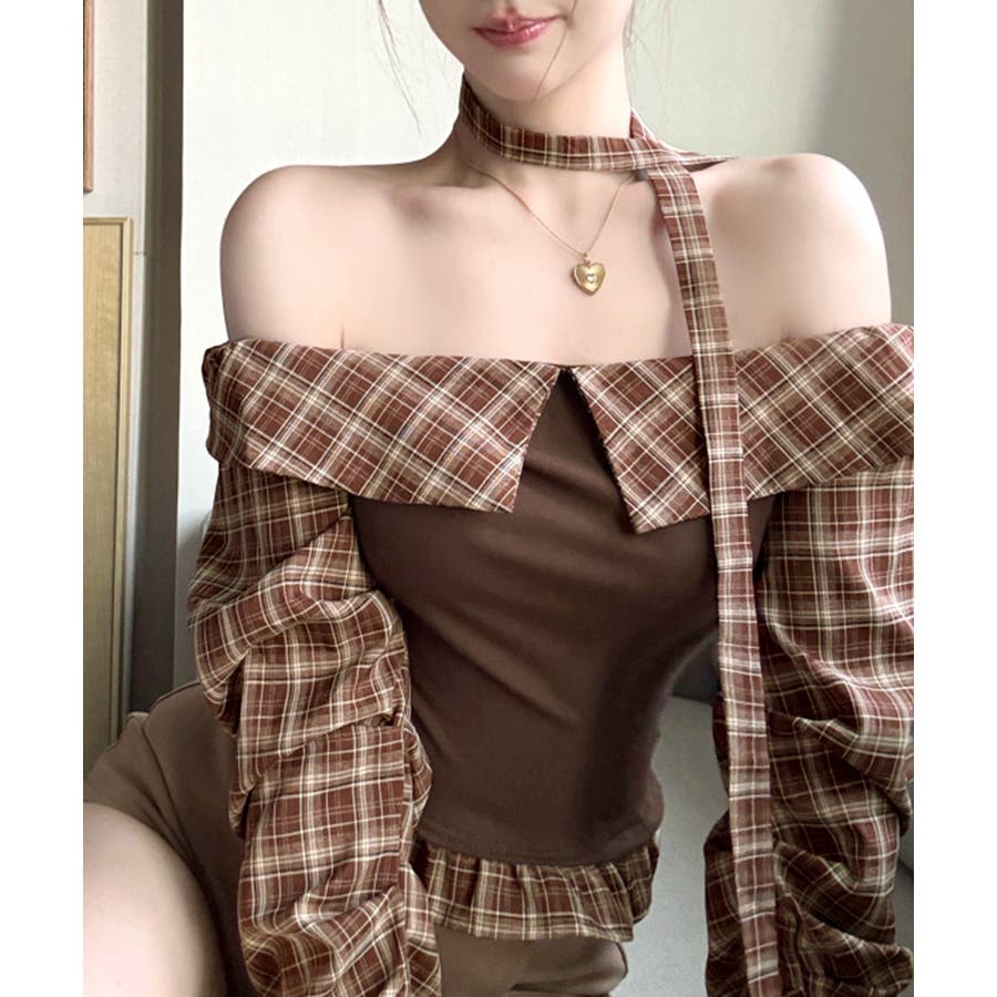 チョーカー付きチェックオフショルトップス
