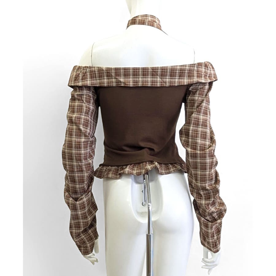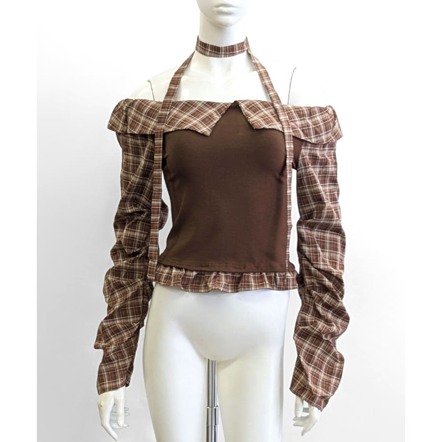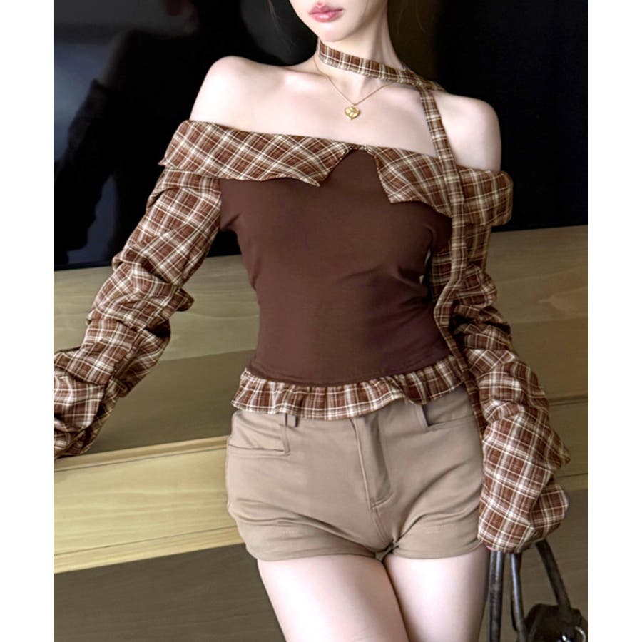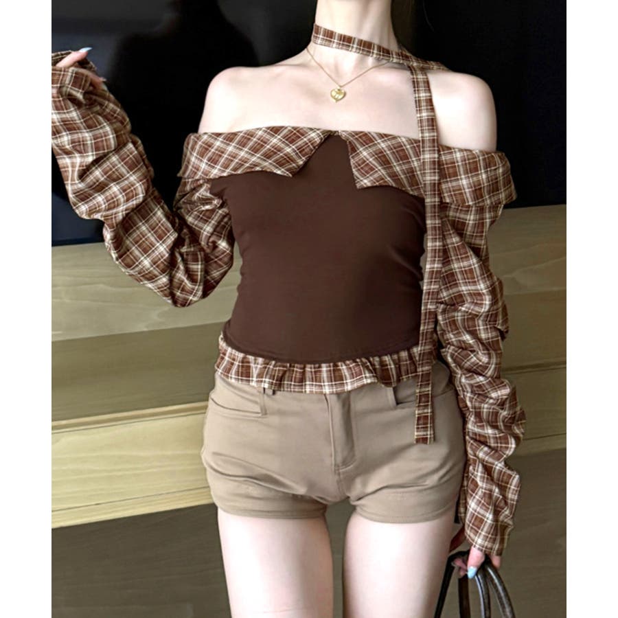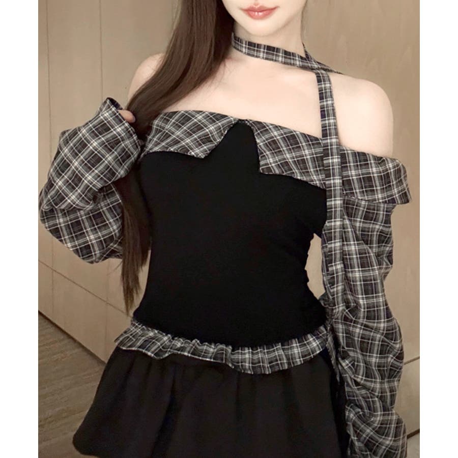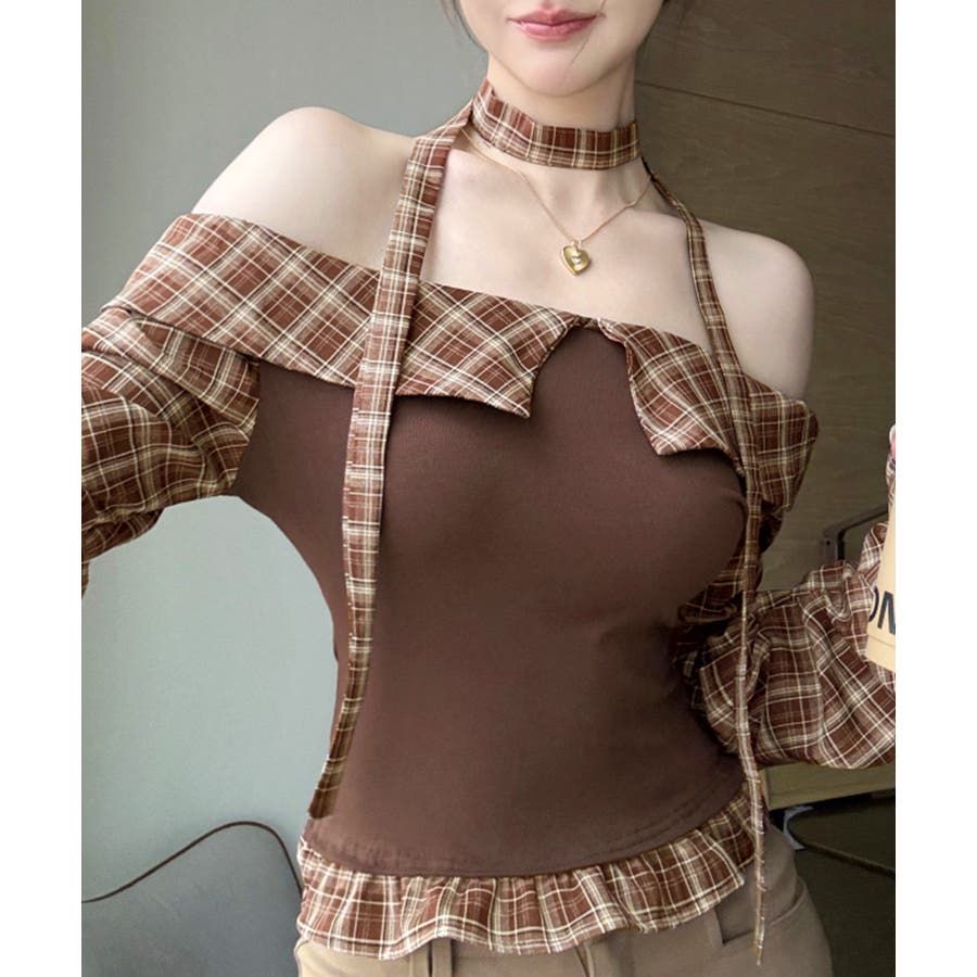 チョーカー付きチェックオフショルトップス