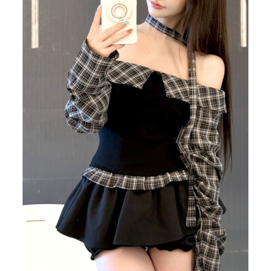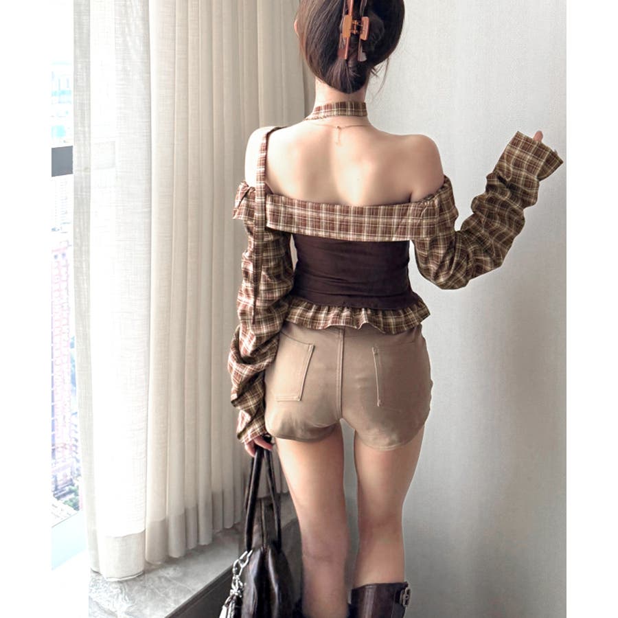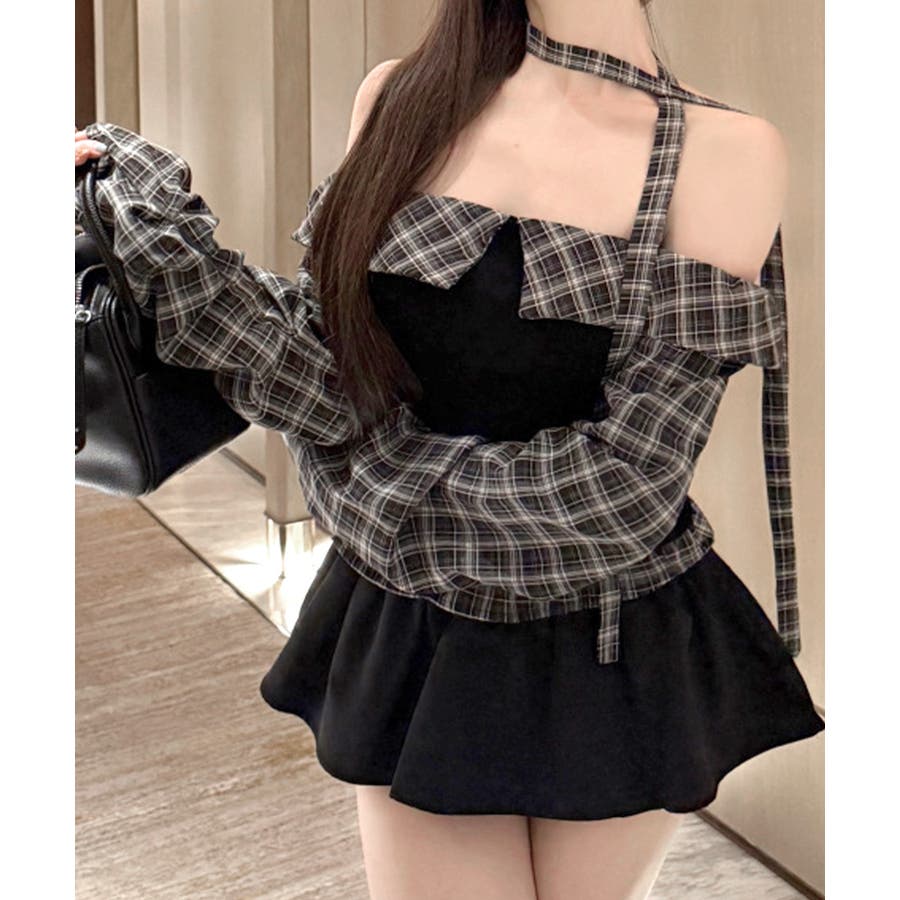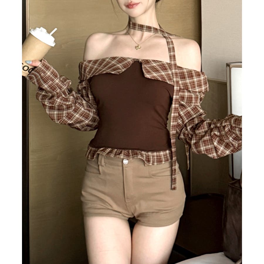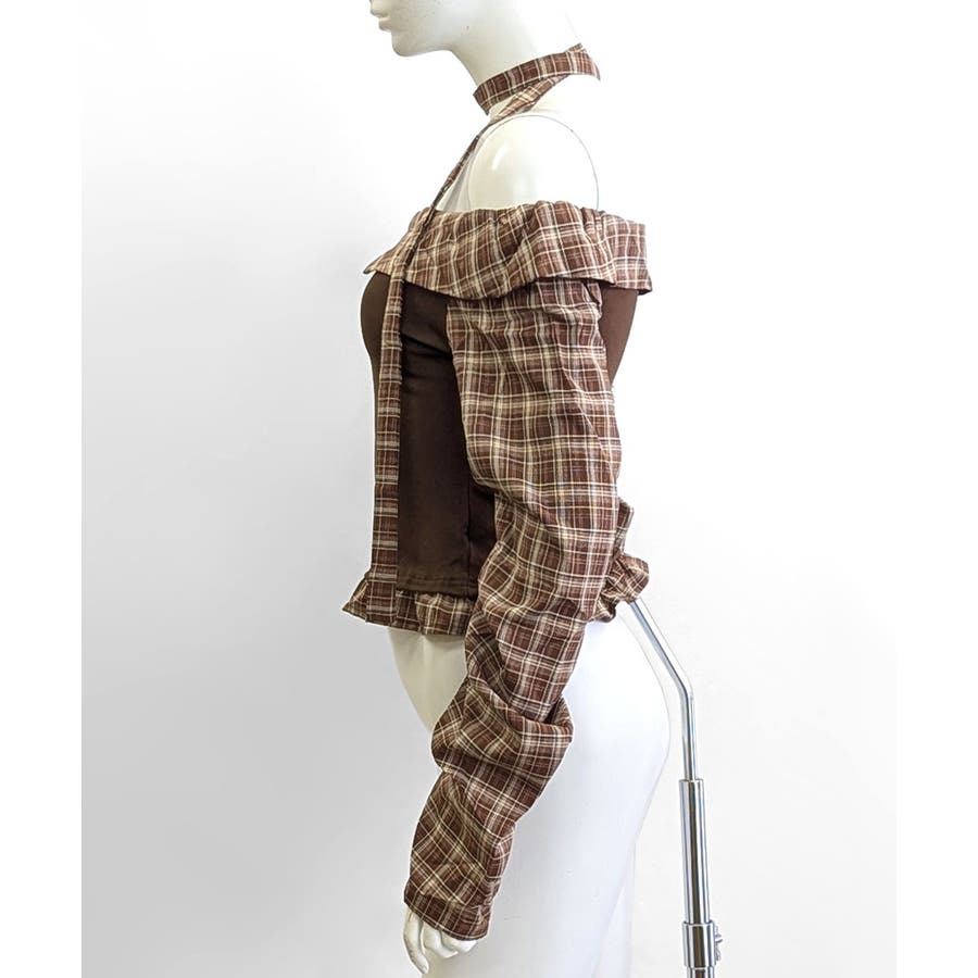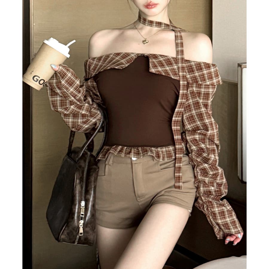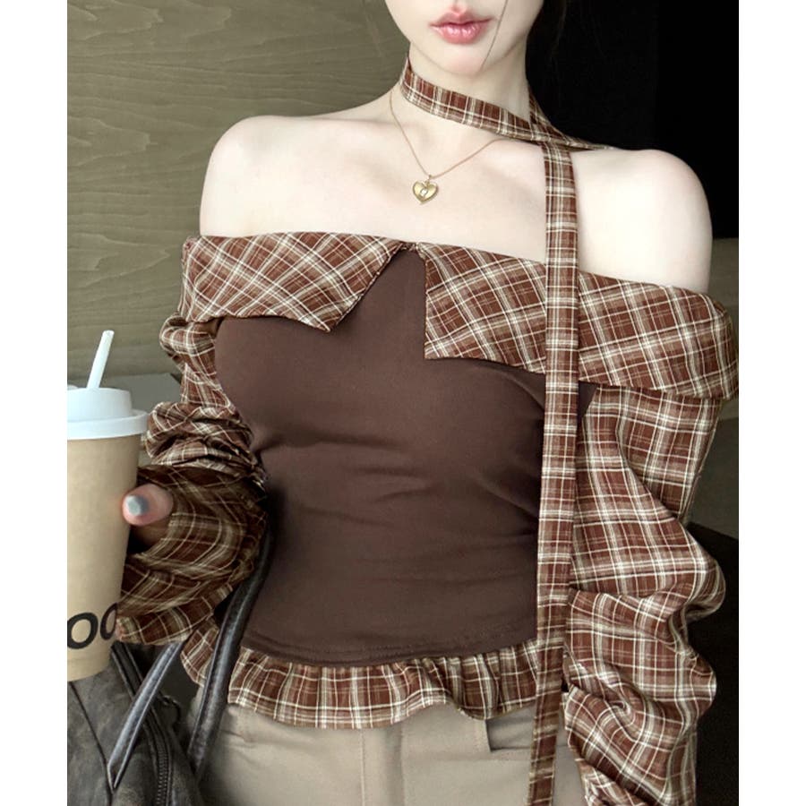 チョーカー付きチェックオフショルトップス