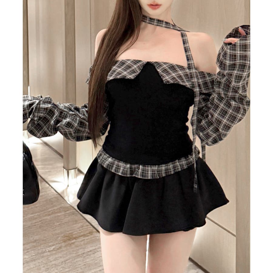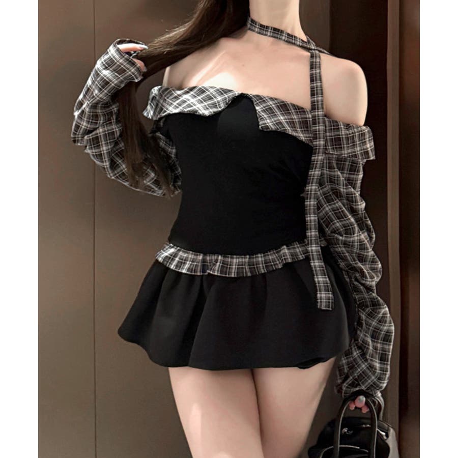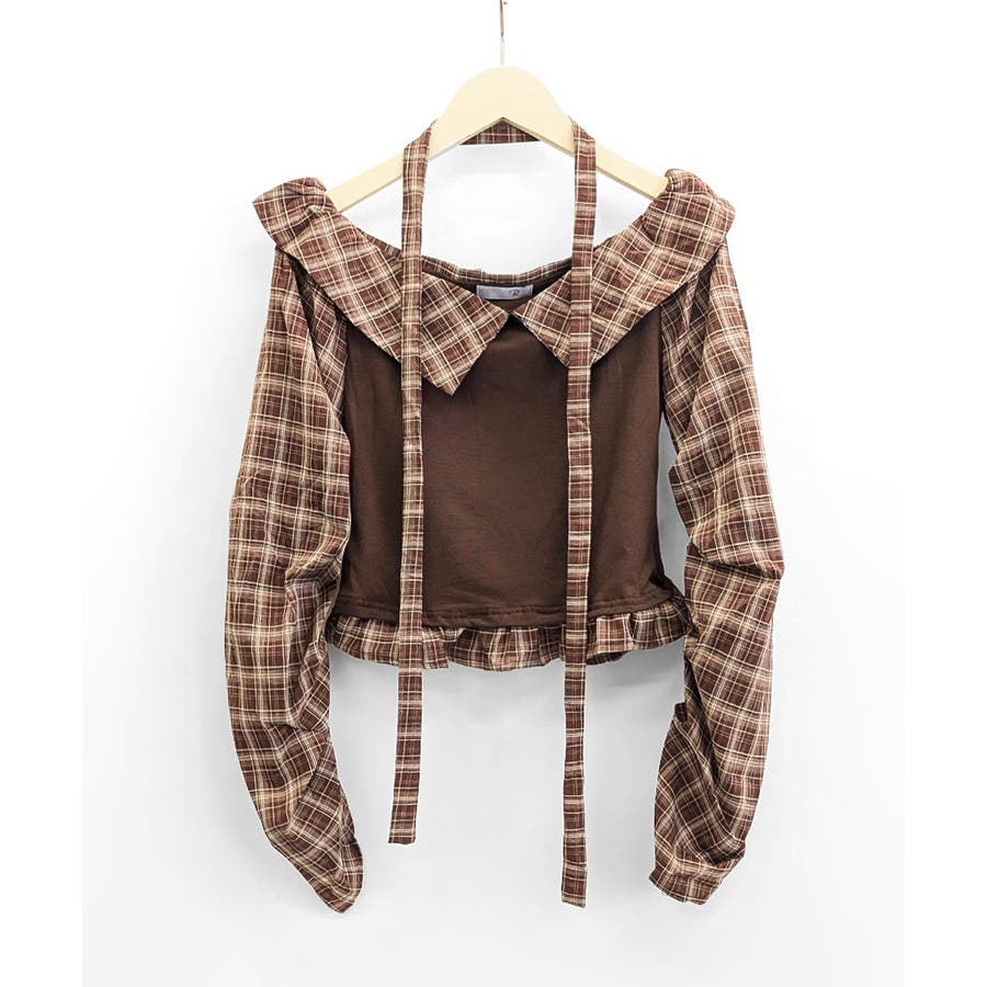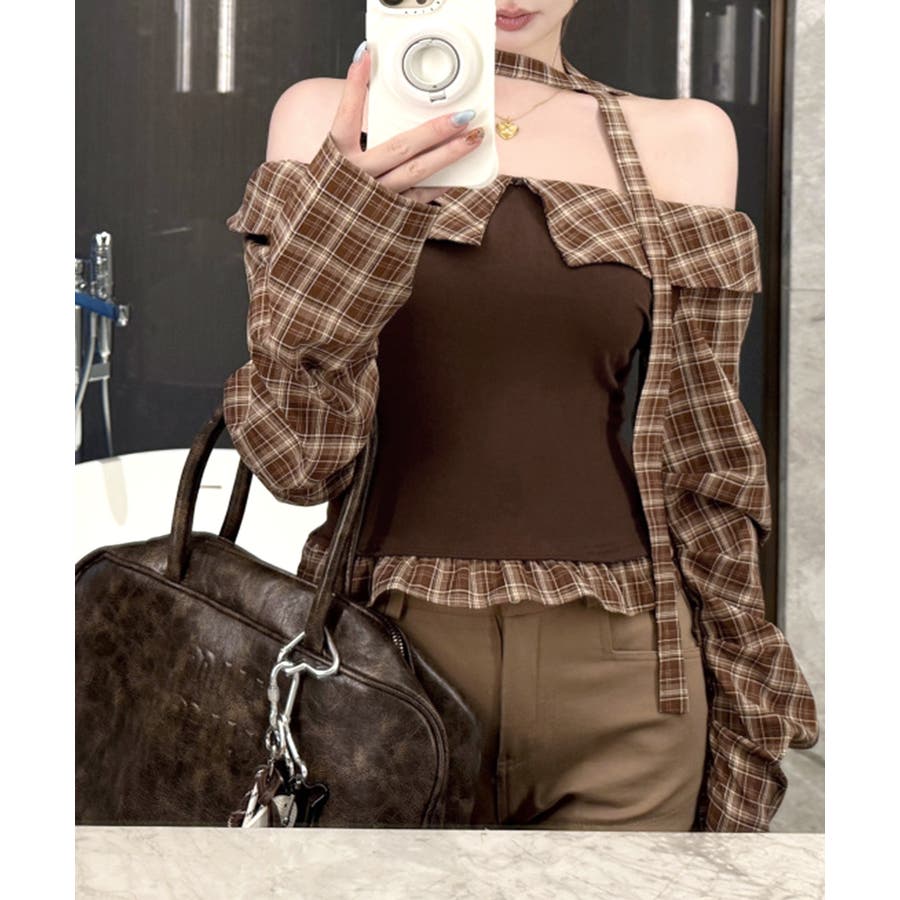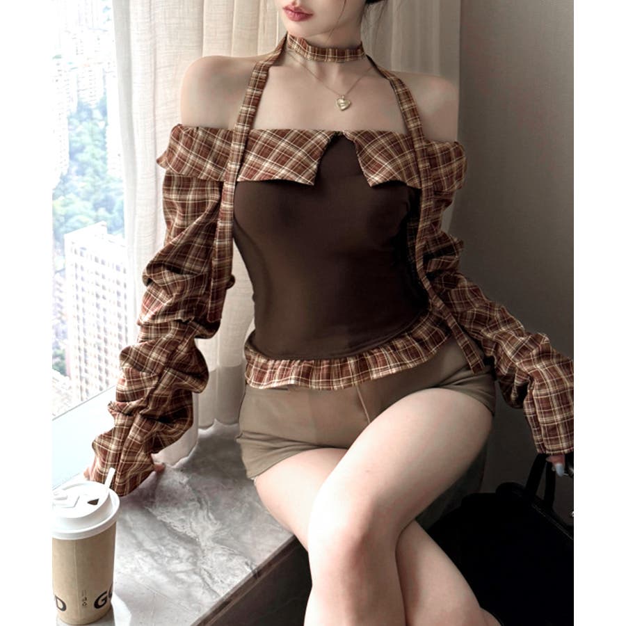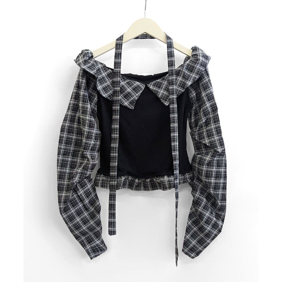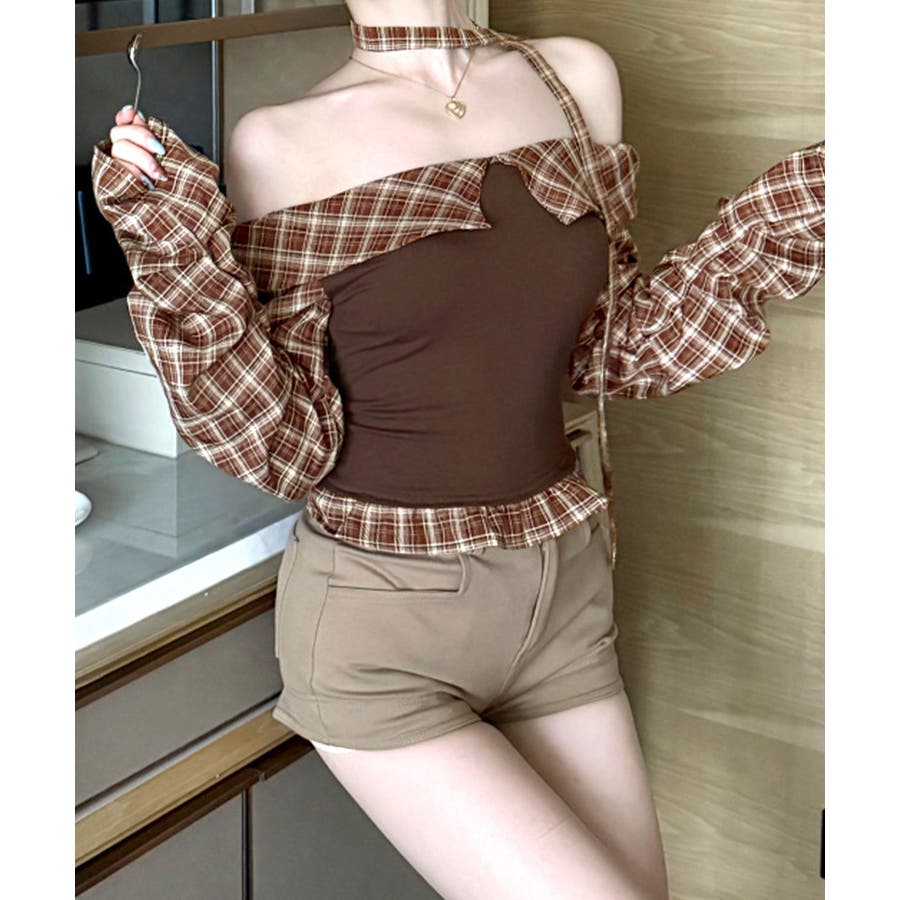 チョーカー付きチェックオフショルトップス