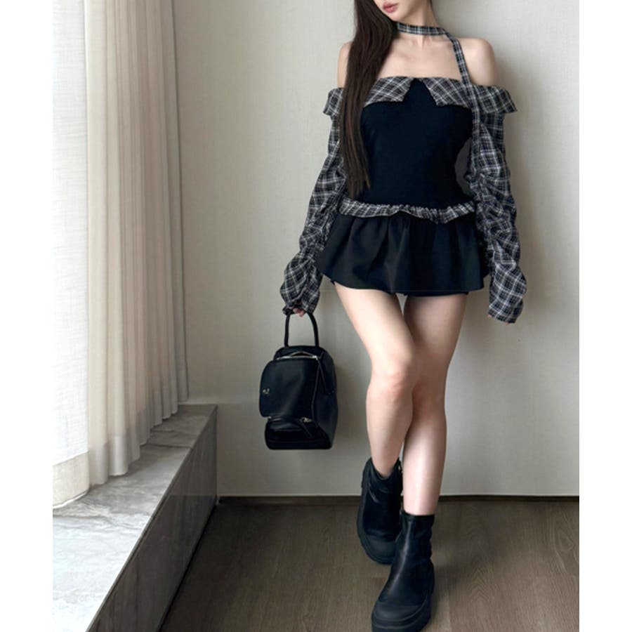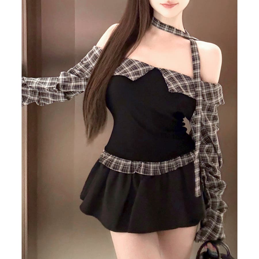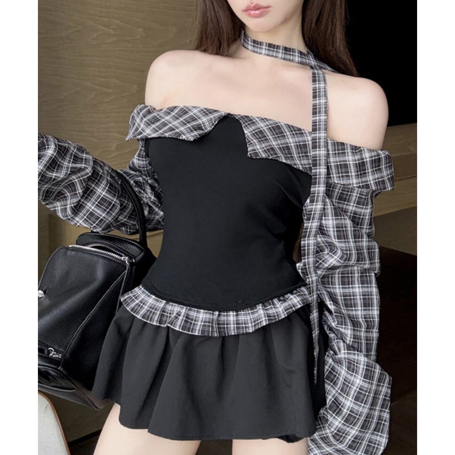チェックオフショルトップス チョーカー付き オフショルダー