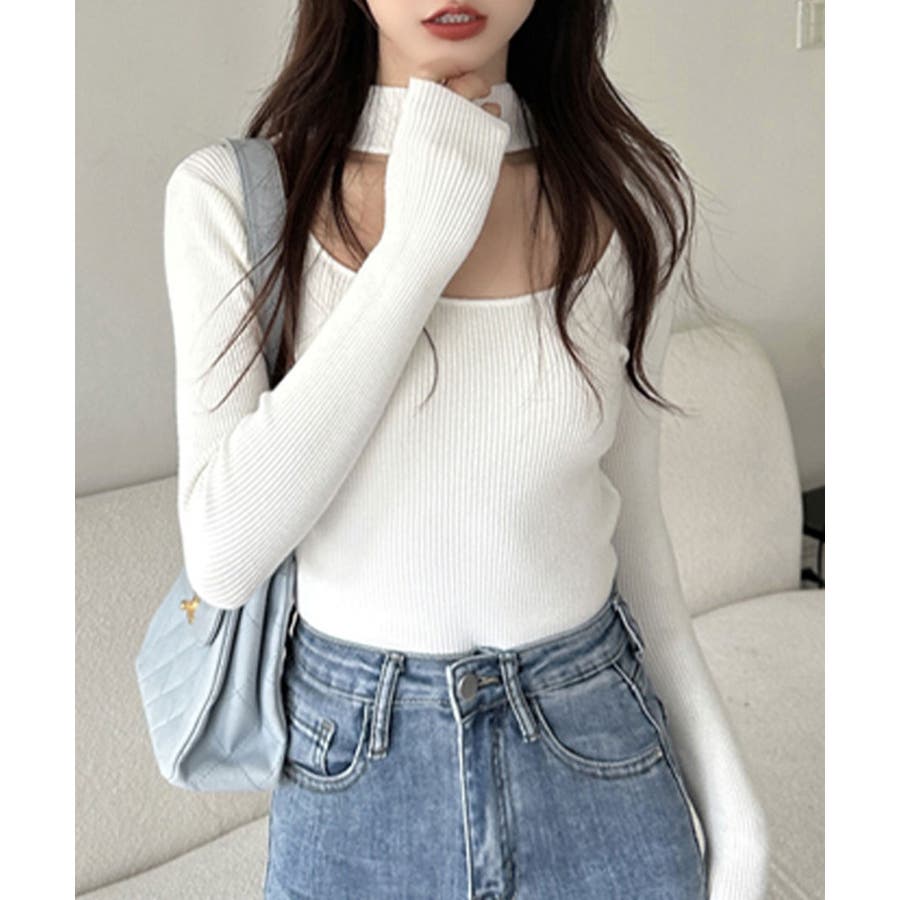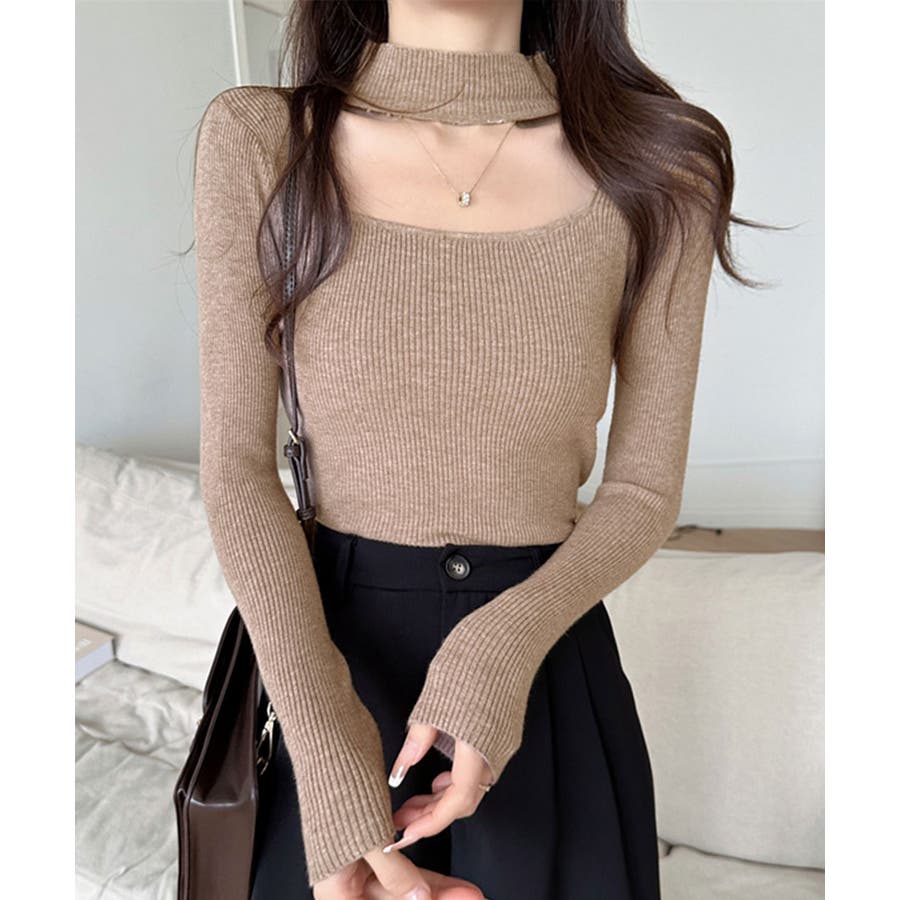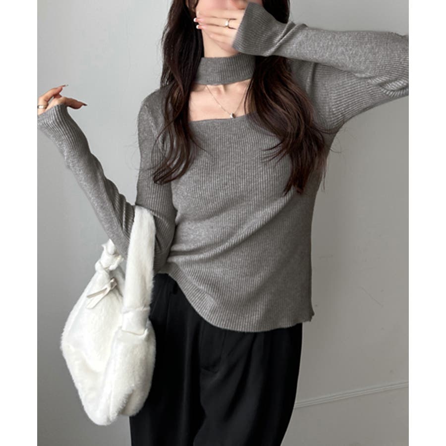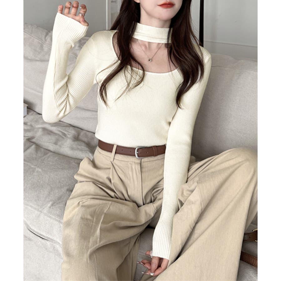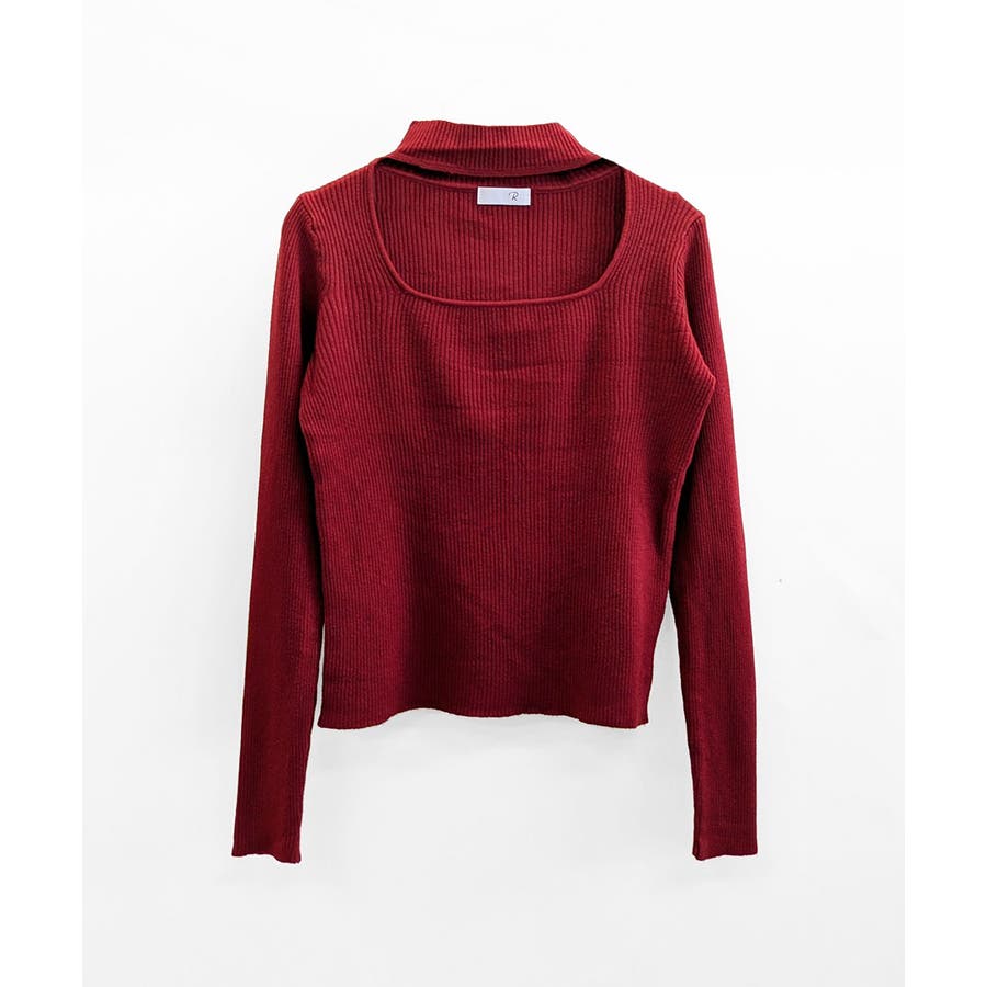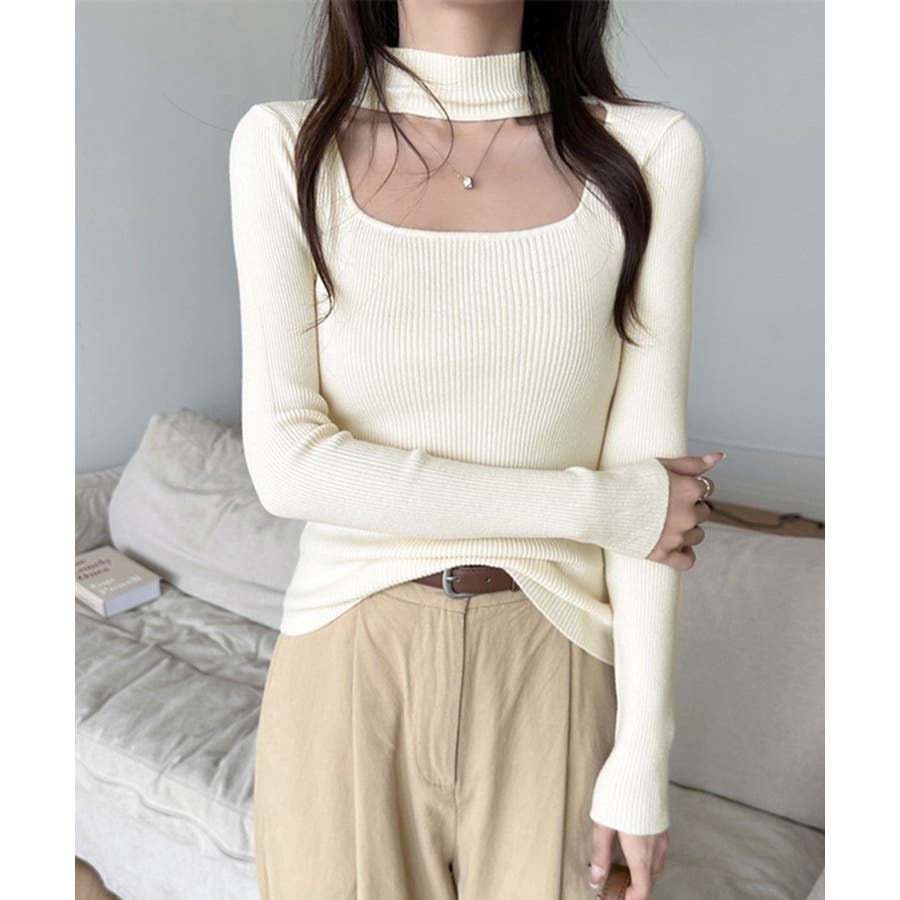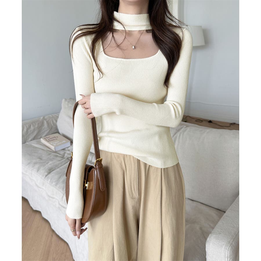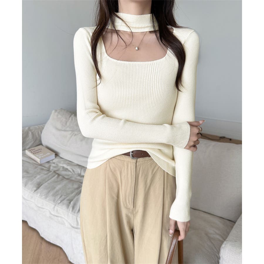 ハイネックデコルテ開きリブニット リブ編み セーター