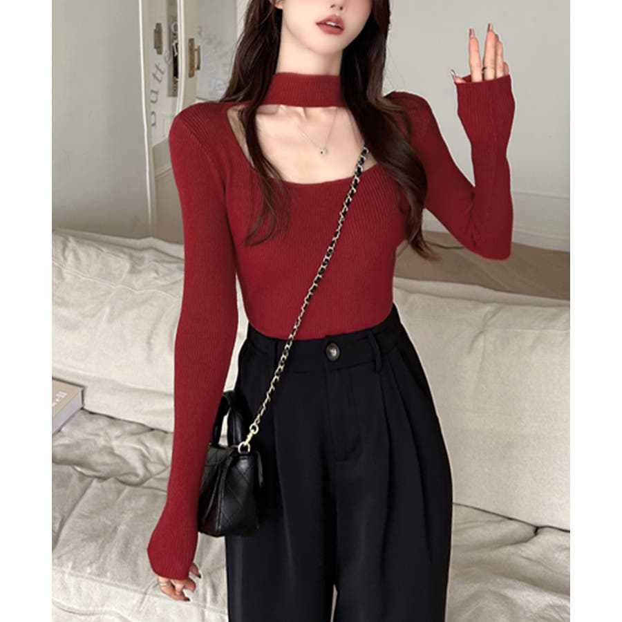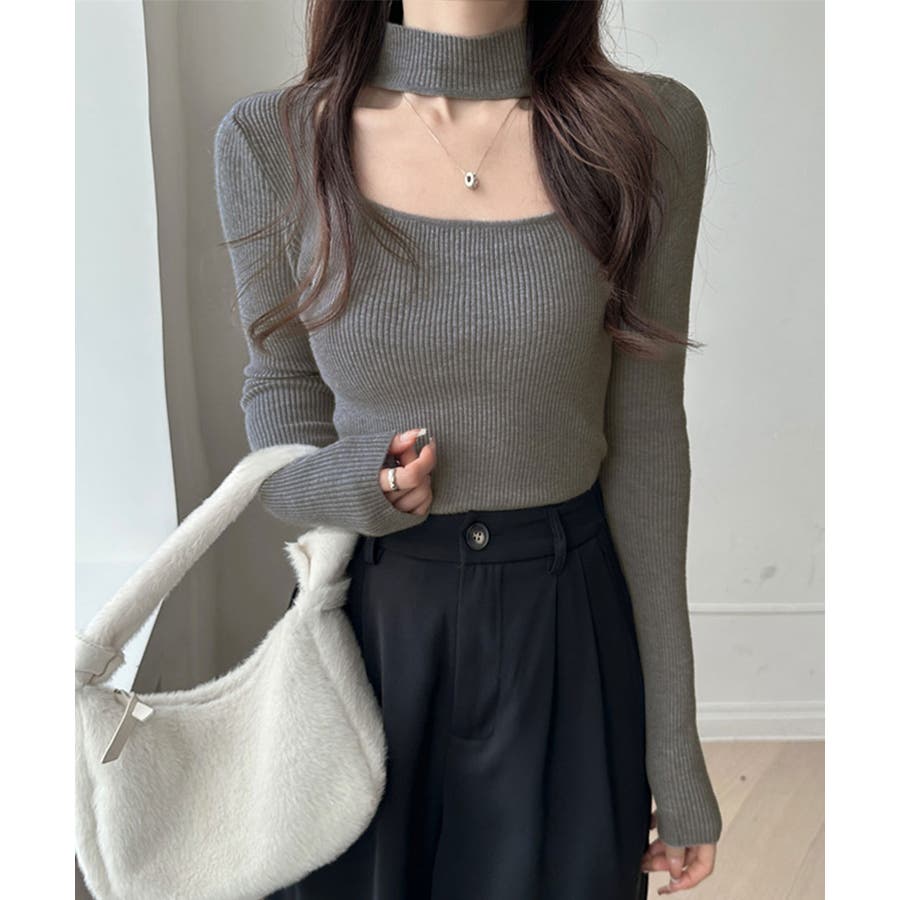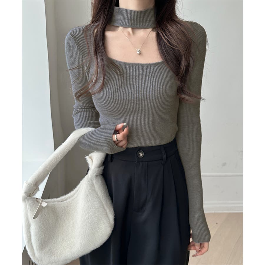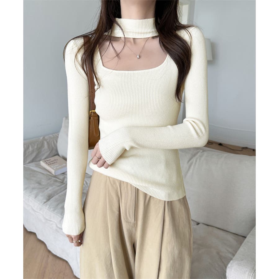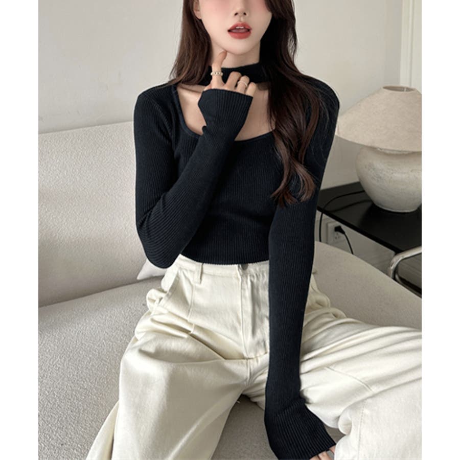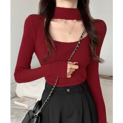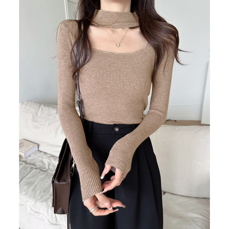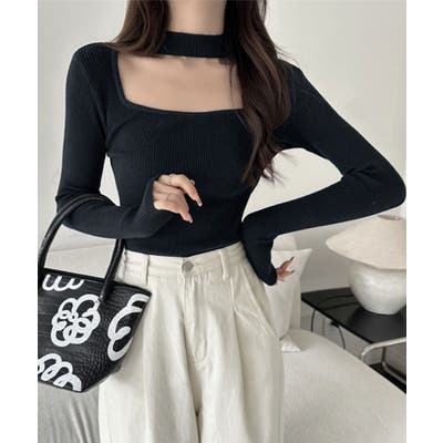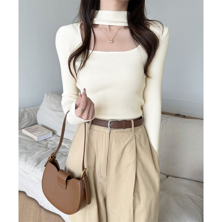 ハイネックデコルテ開きリブニット リブ編み セーター
