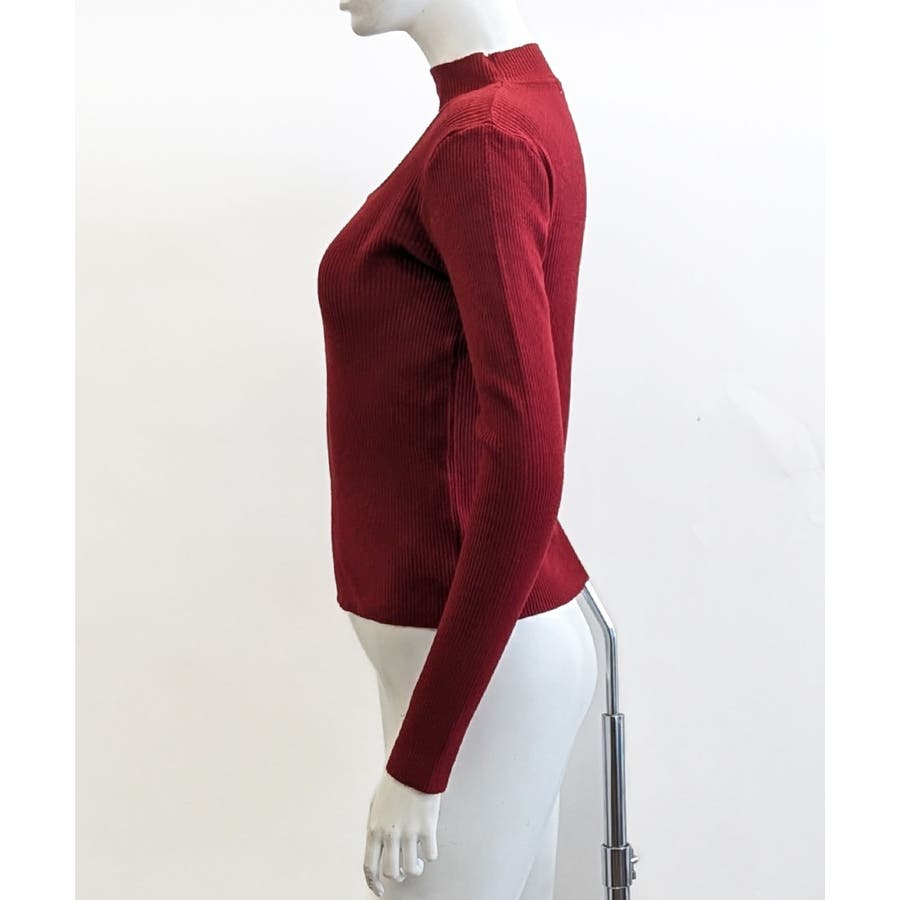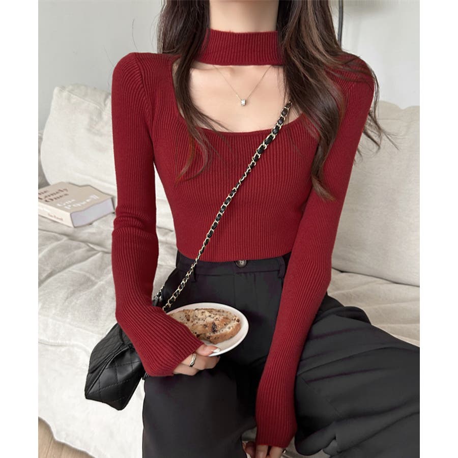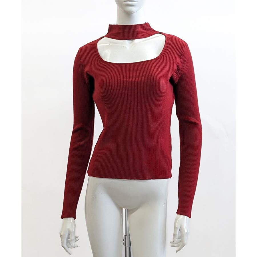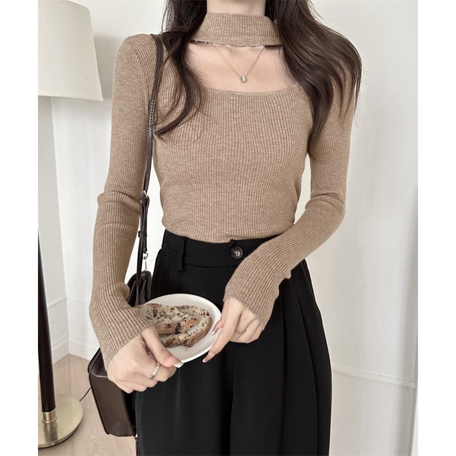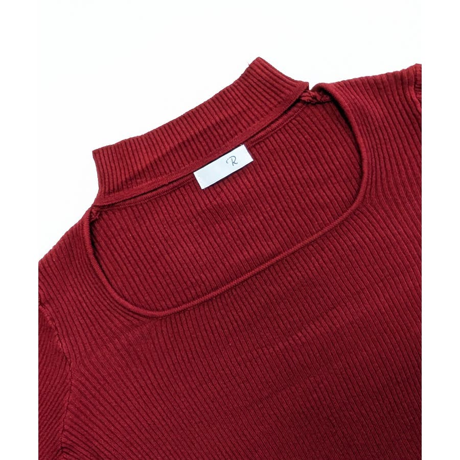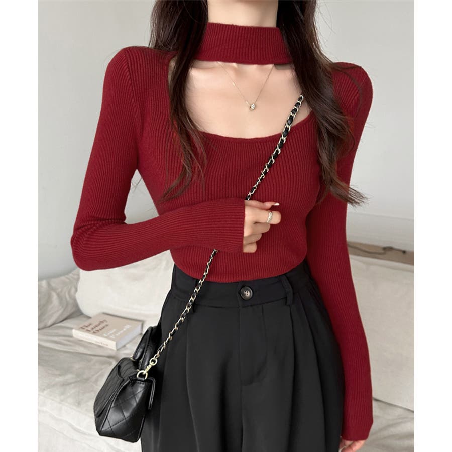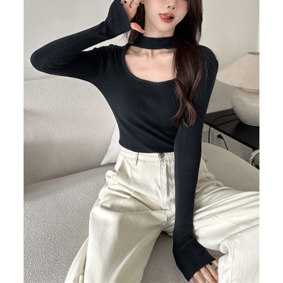 ハイネックデコルテ開きリブニット リブ編み セーター