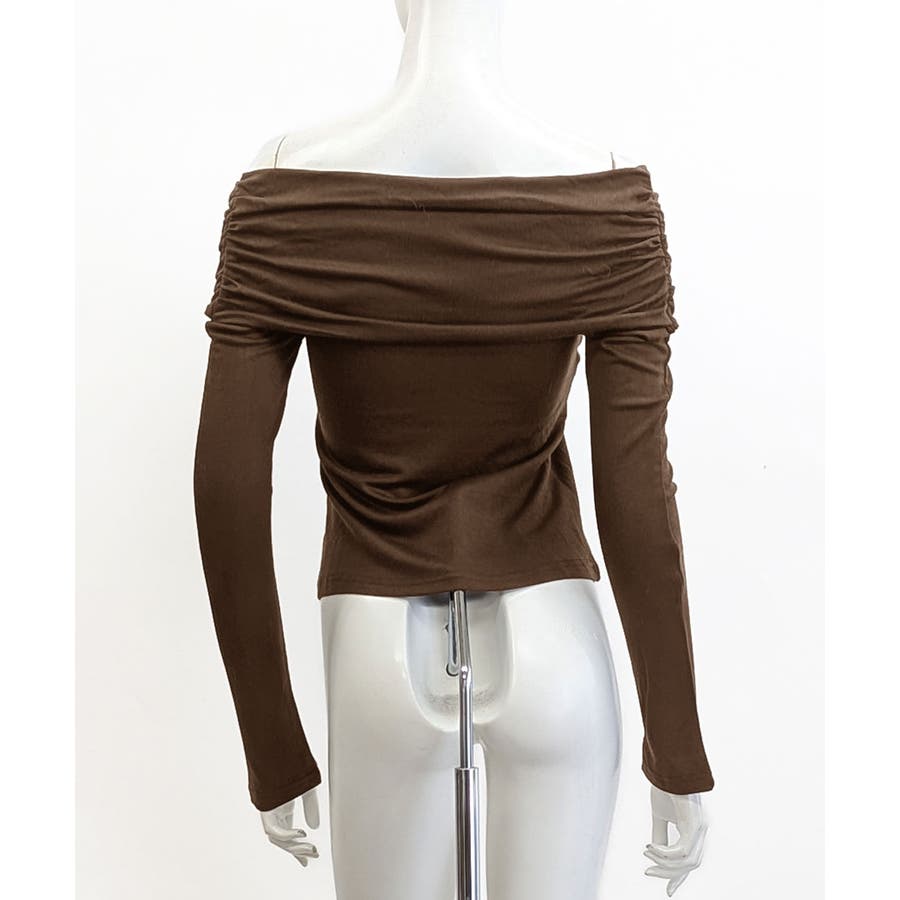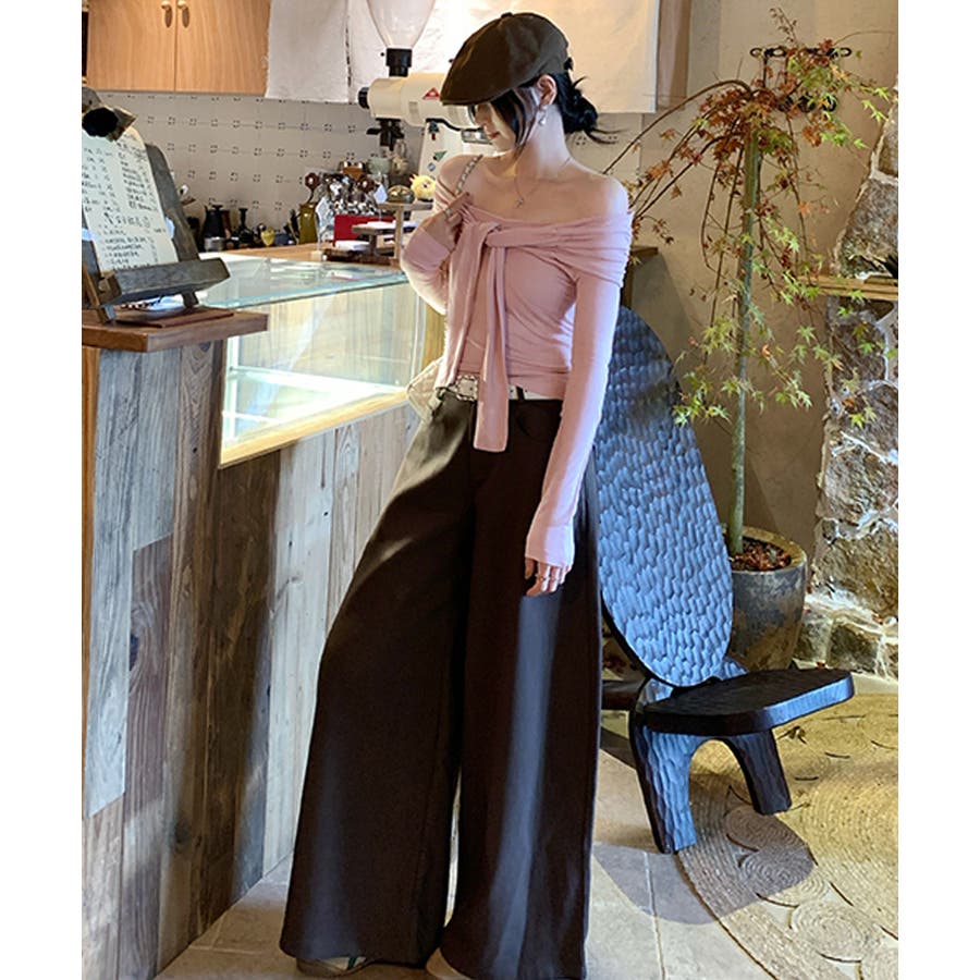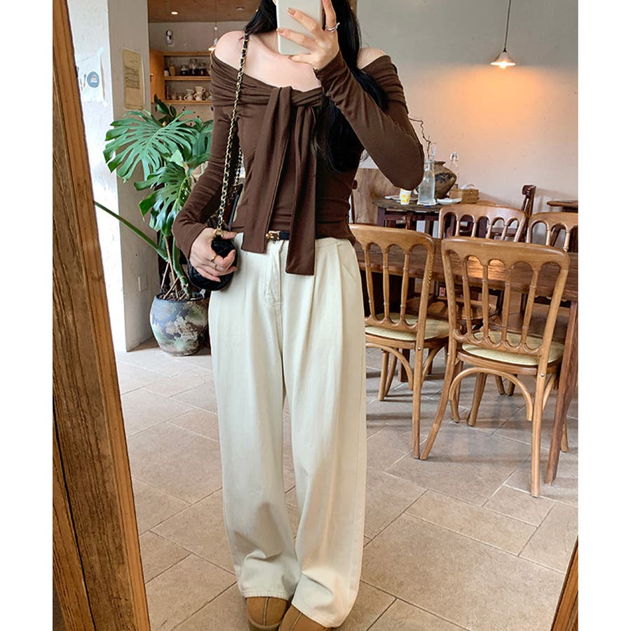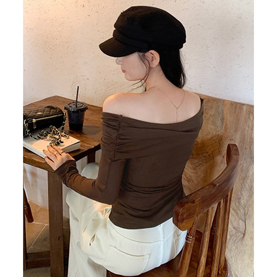 ・オフショルダーで美しいデコルテラインをメイク。