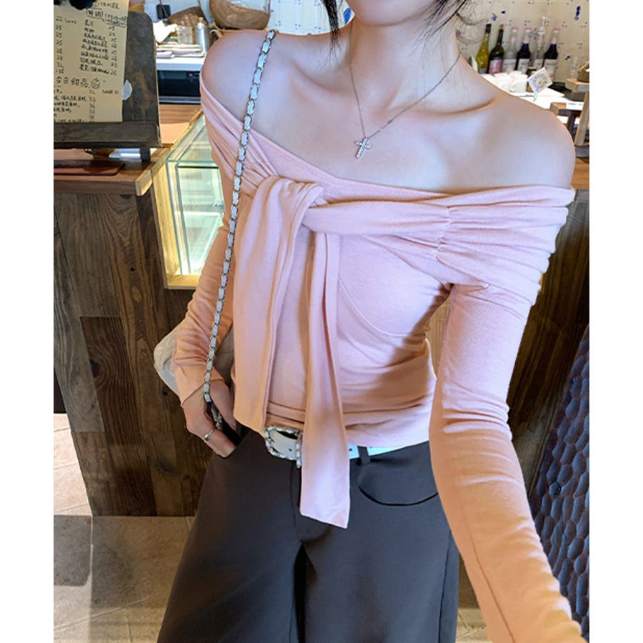 オフショルフロントリボントップス オフショルダー Tシャツ