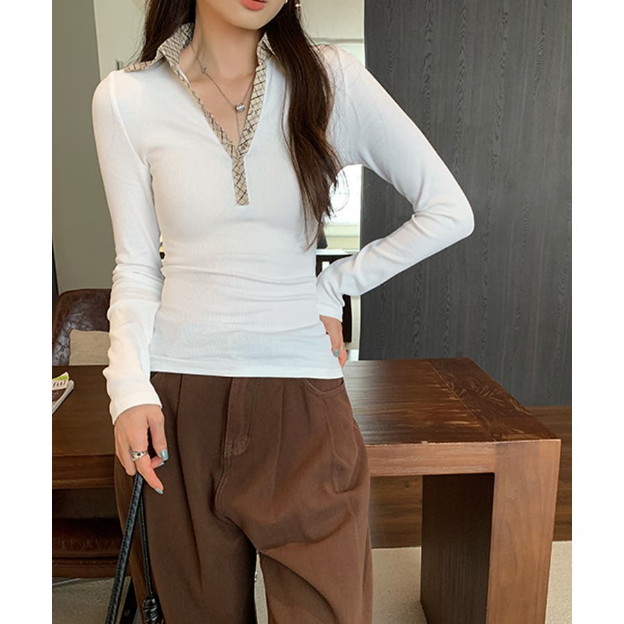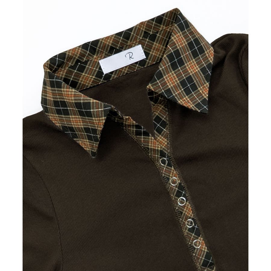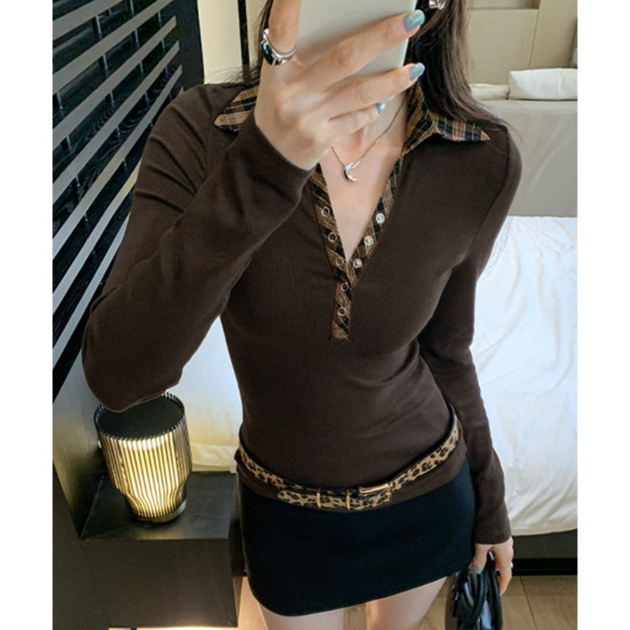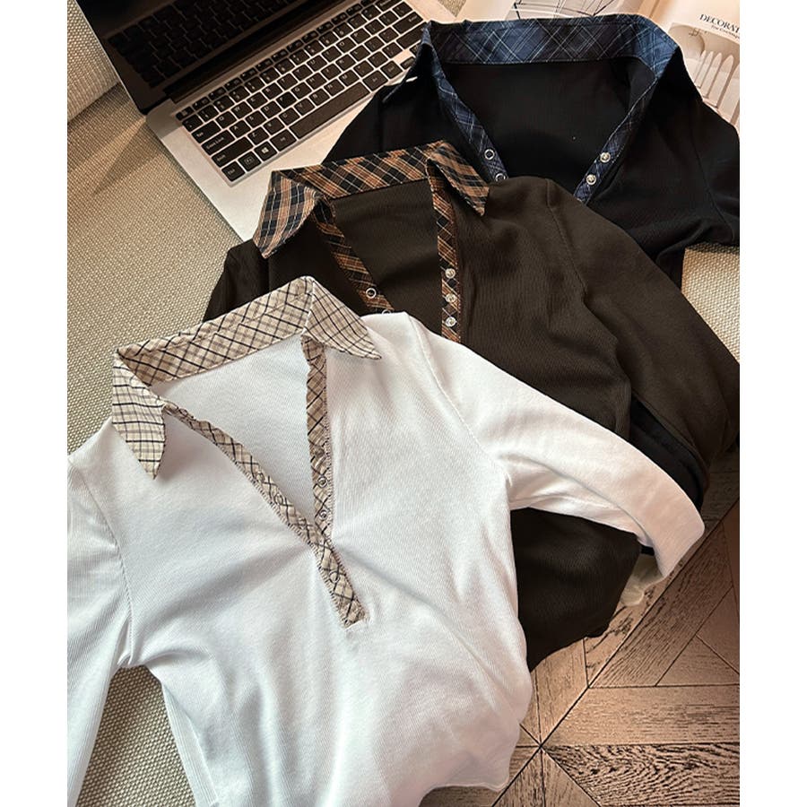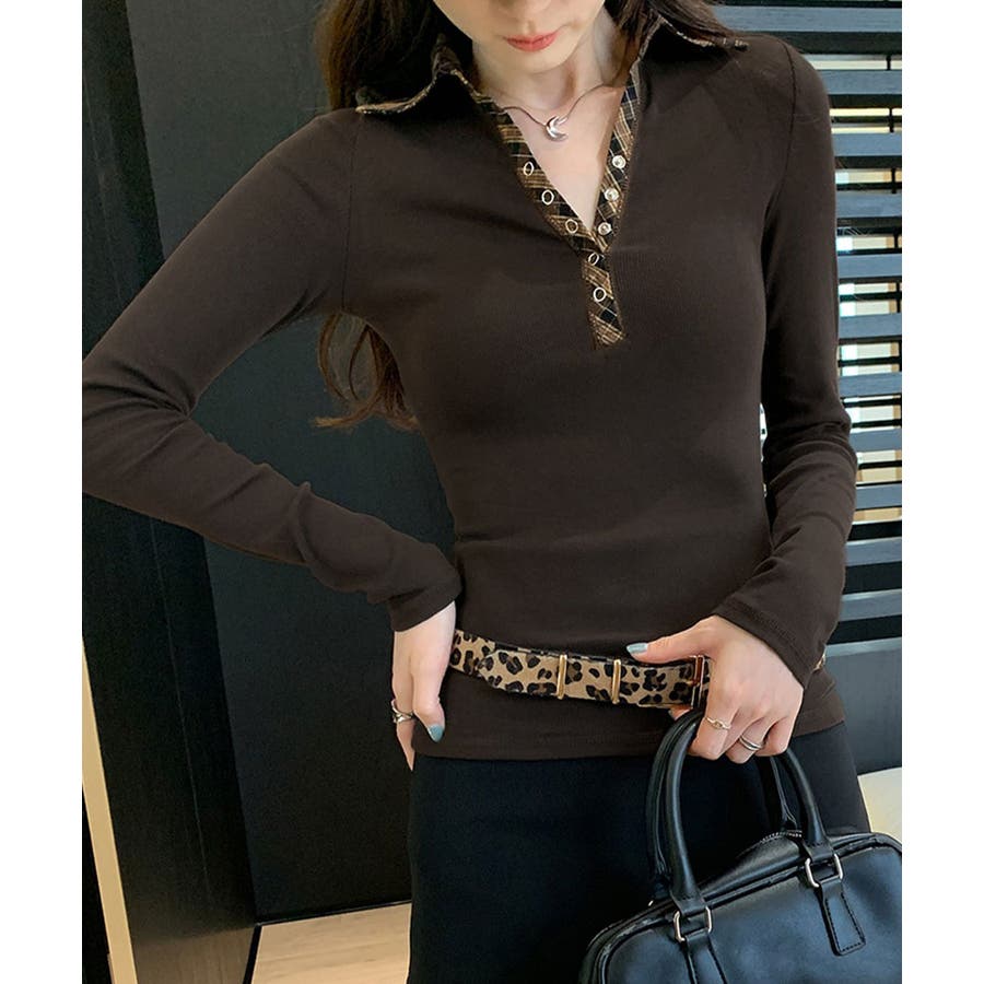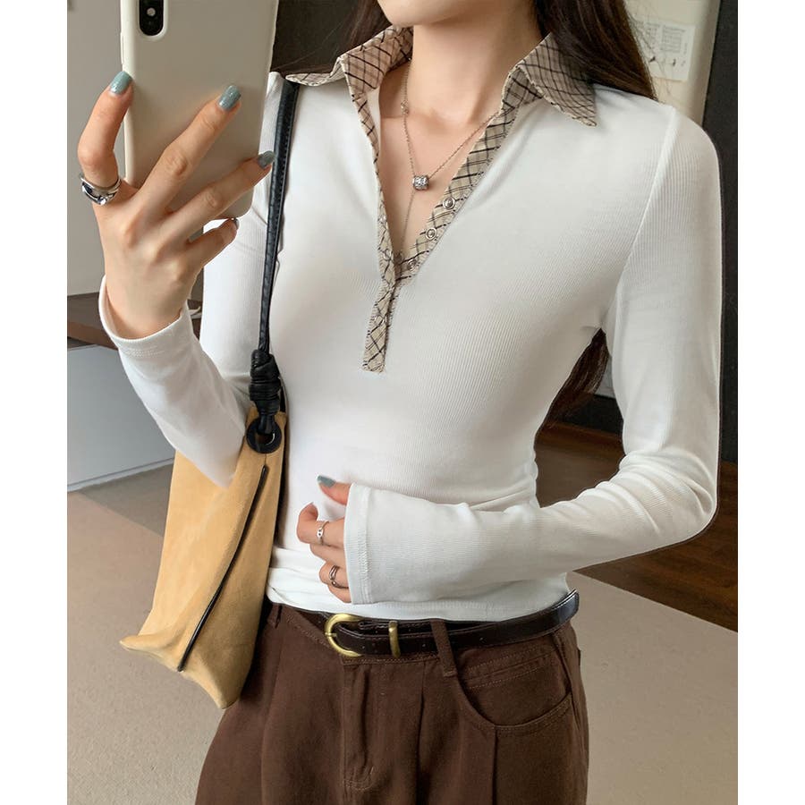 ポロ襟チェック柄切り替えトップス 衿付き Vネック