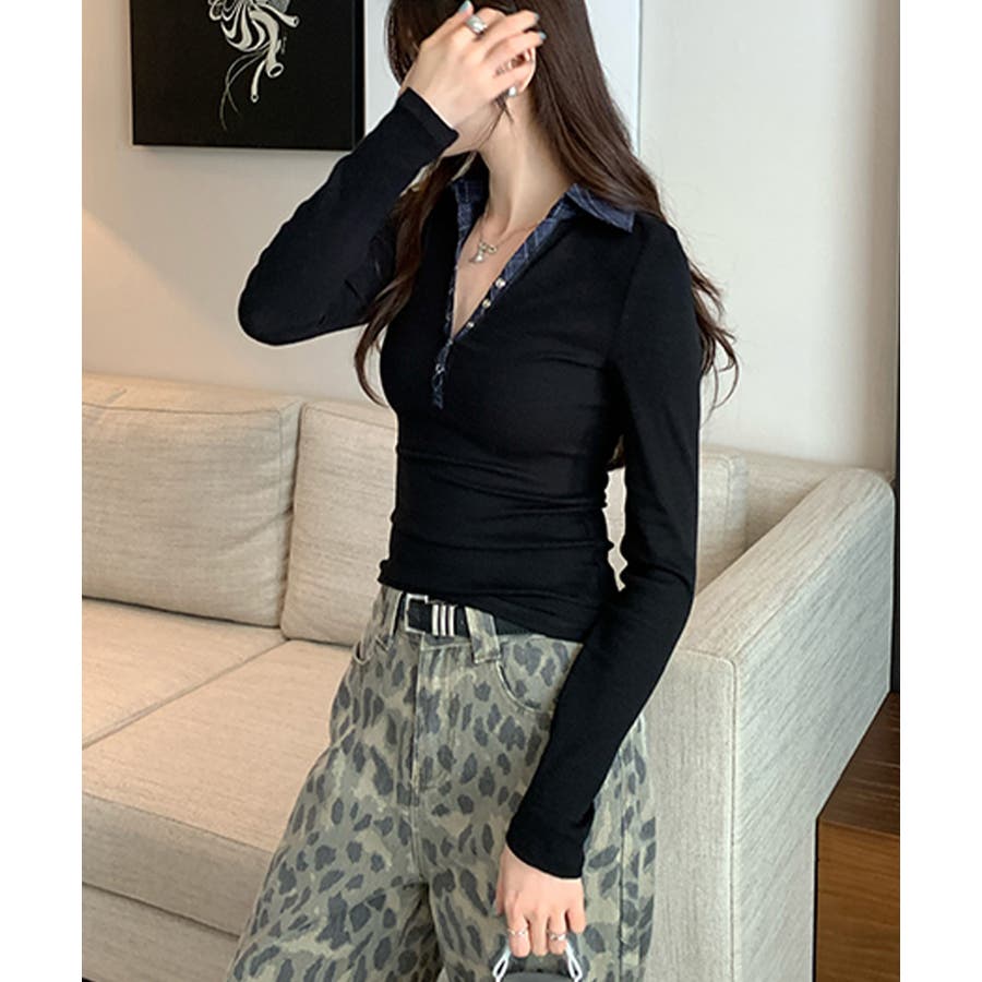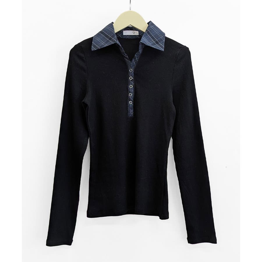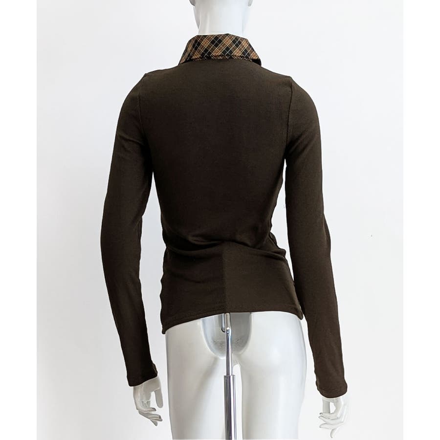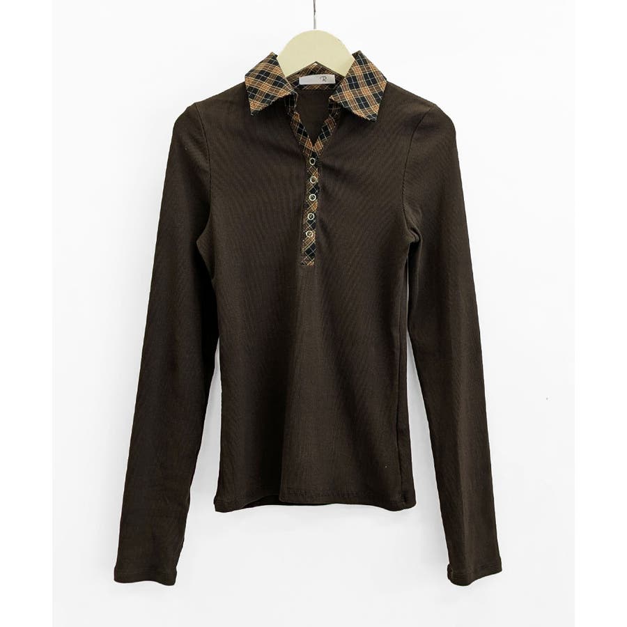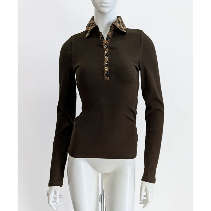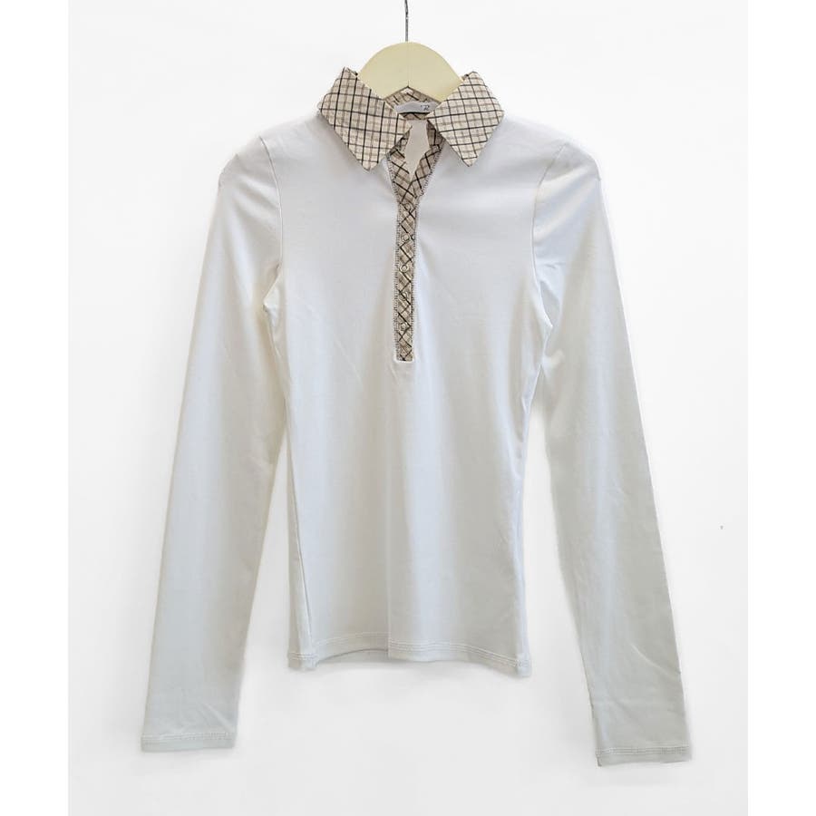 ポロ襟チェック柄切り替えトップス 衿付き Vネック
