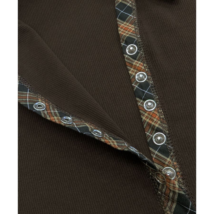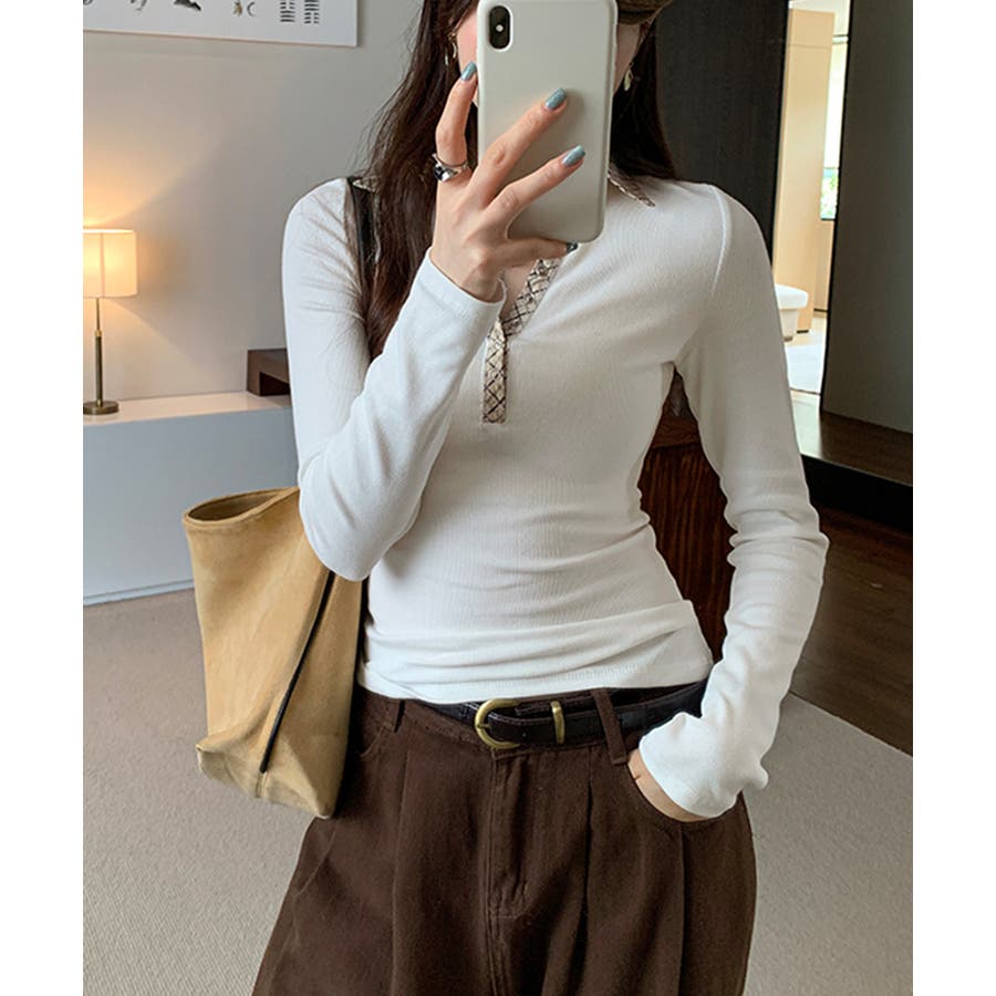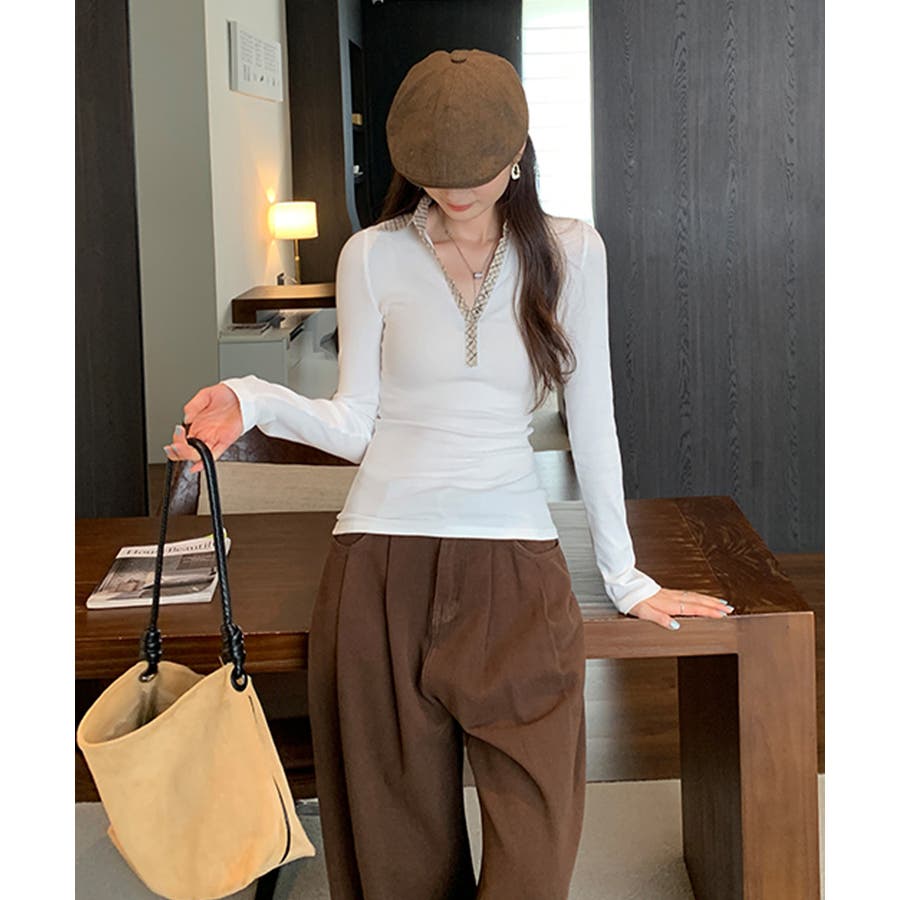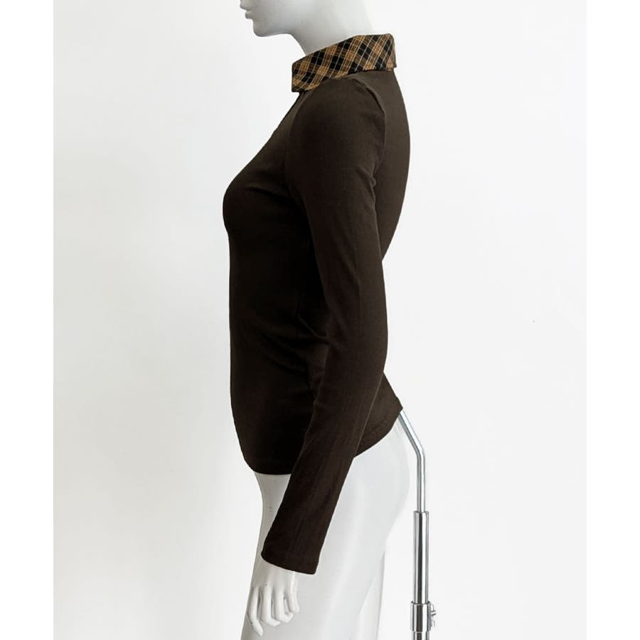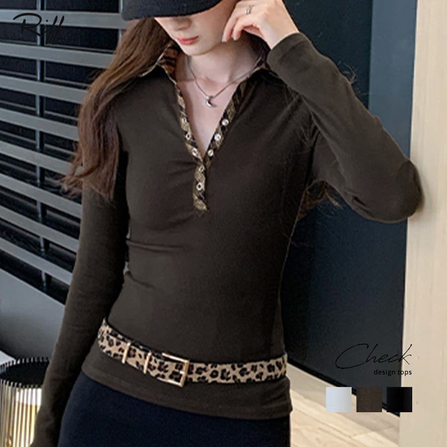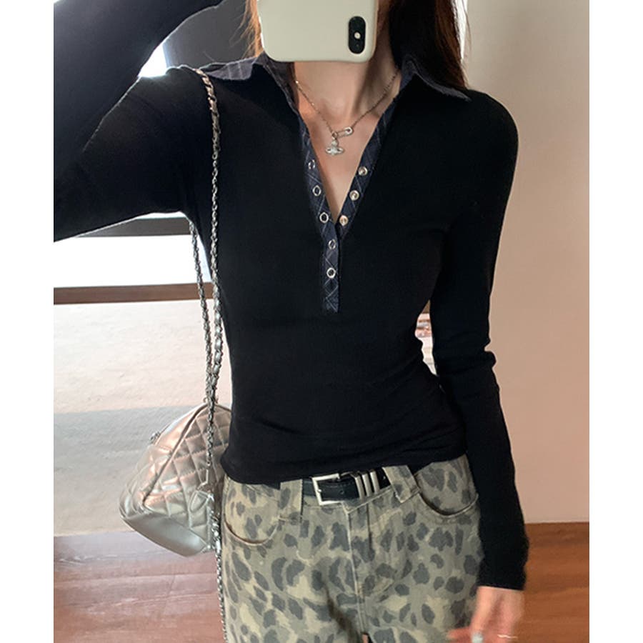 ポロ襟チェック柄切り替えトップス 衿付き Vネック