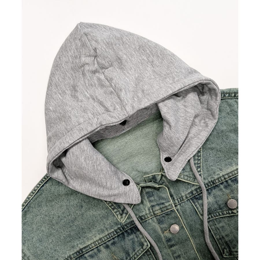 ・デニムジャケットにフードをドッキングした旬デザイン。