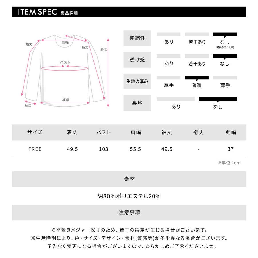 着丈:49.5cm / バスト:103cm / 肩幅:55.5cm / 袖丈:49.5cm / 裾幅:37cm