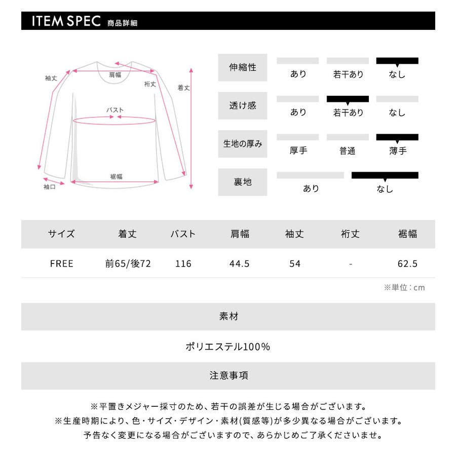 着丈:前65cm 後72cm / バスト:116cm / 肩幅:44.5cm / 袖丈:54cm / 裾幅:62.5cm