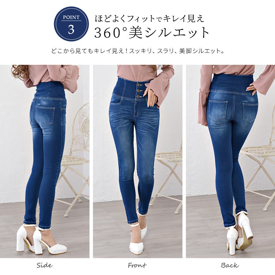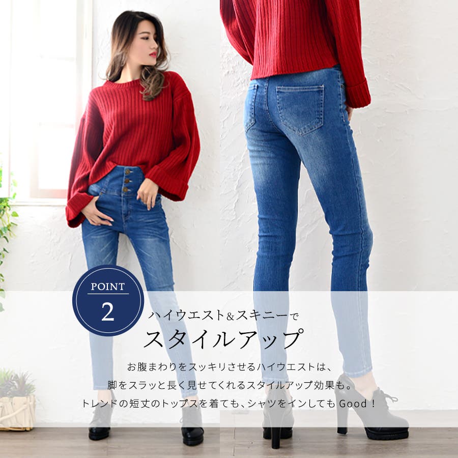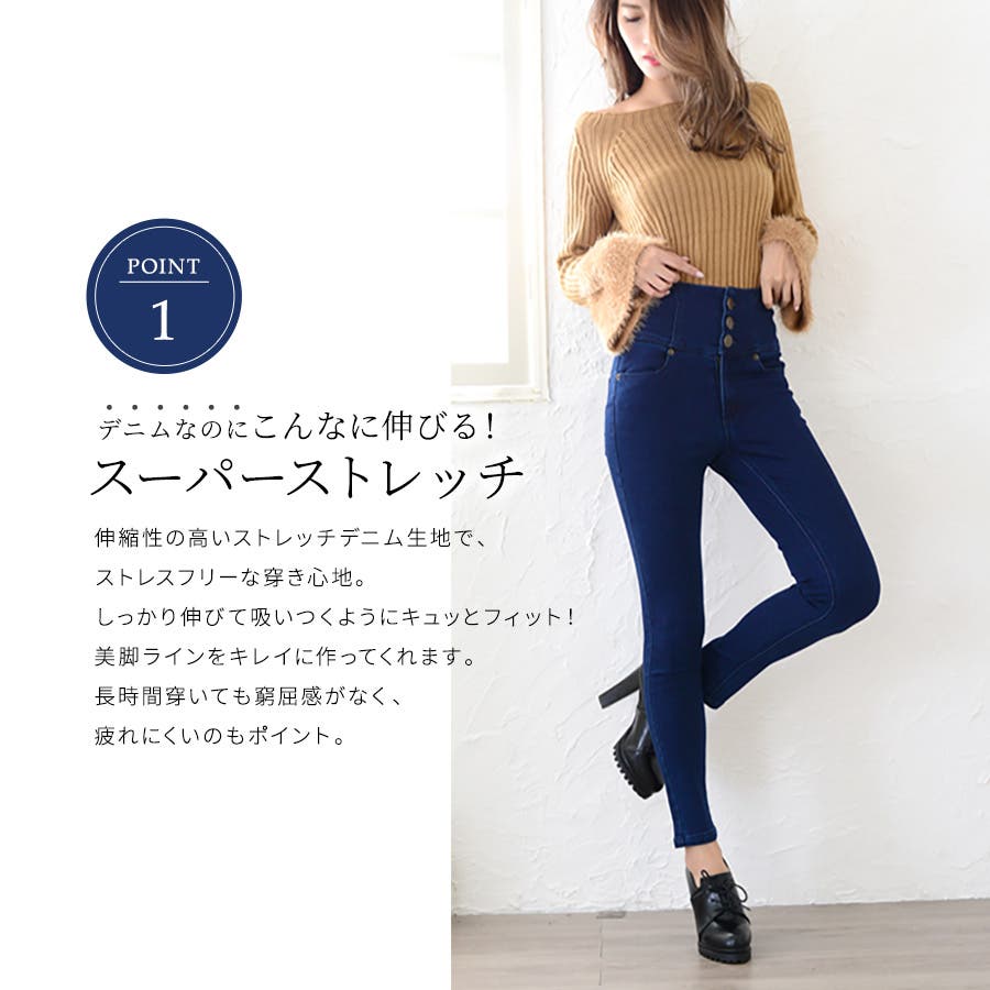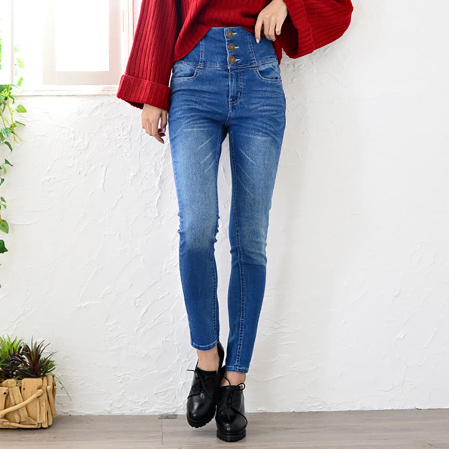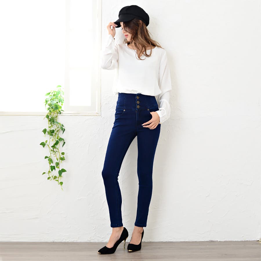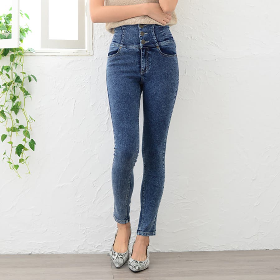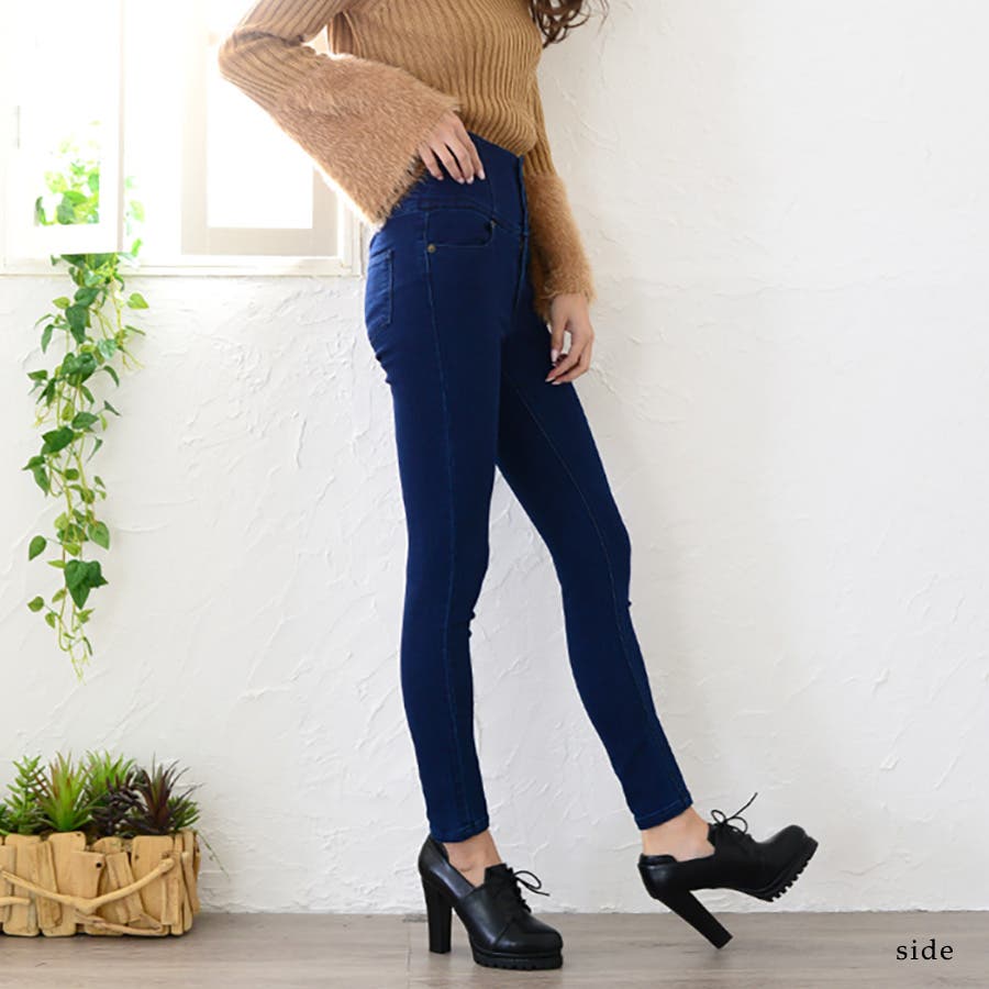 ハイウエストデニムスキニーパンツ3個釦タイプ。