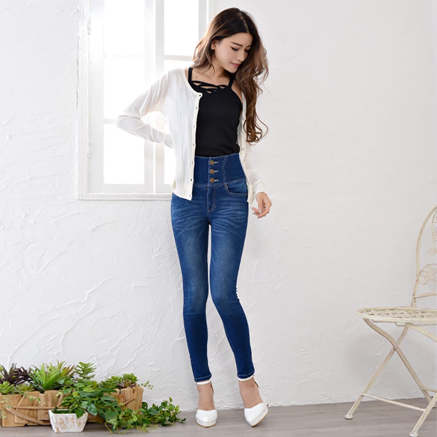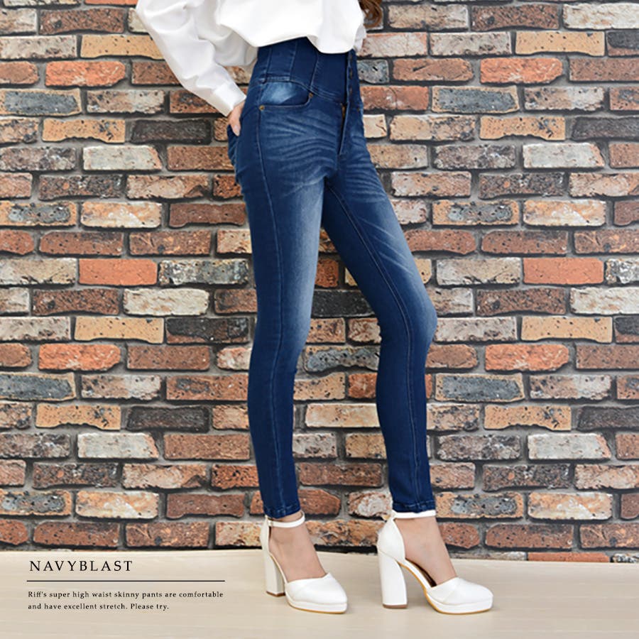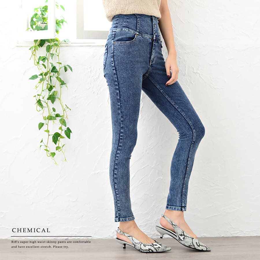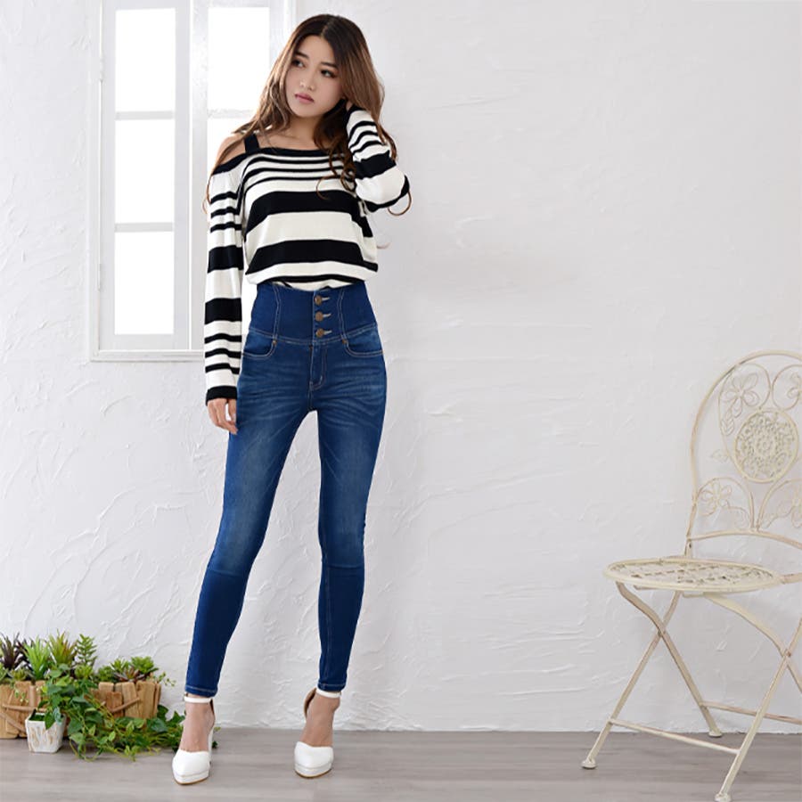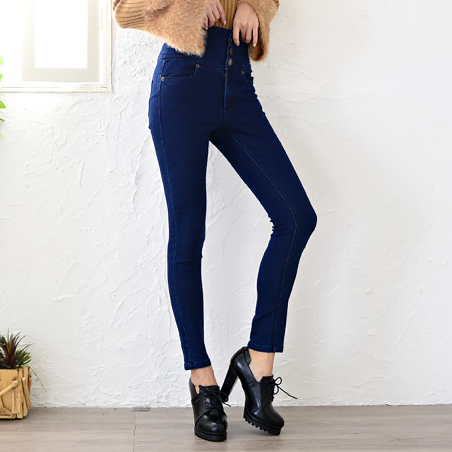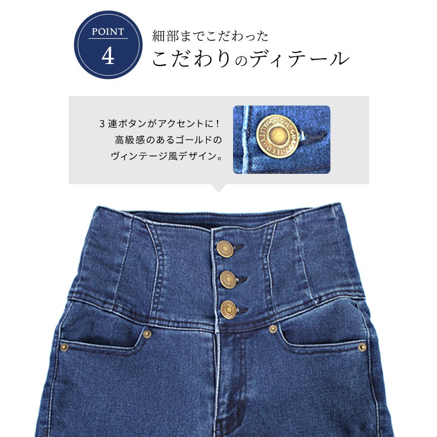 ハイウエストデニムスキニーパンツ3個釦タイプ。