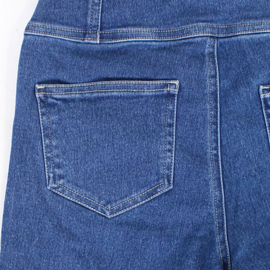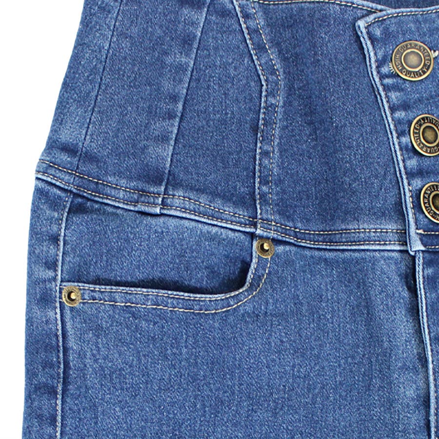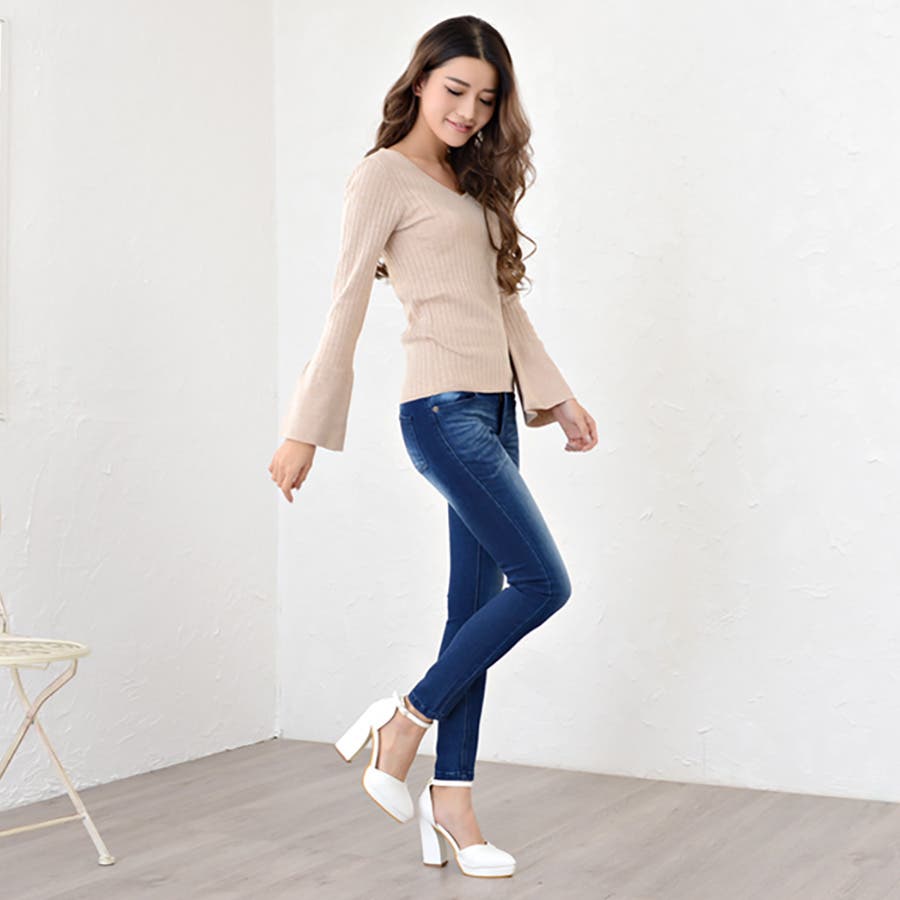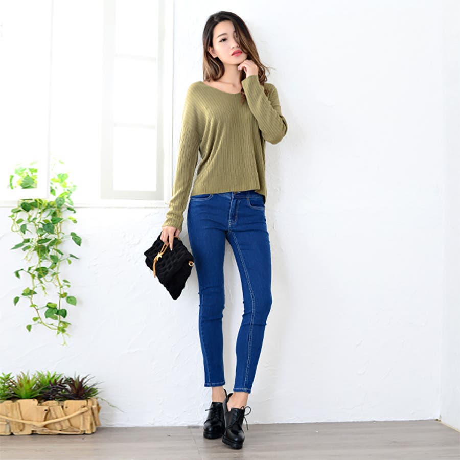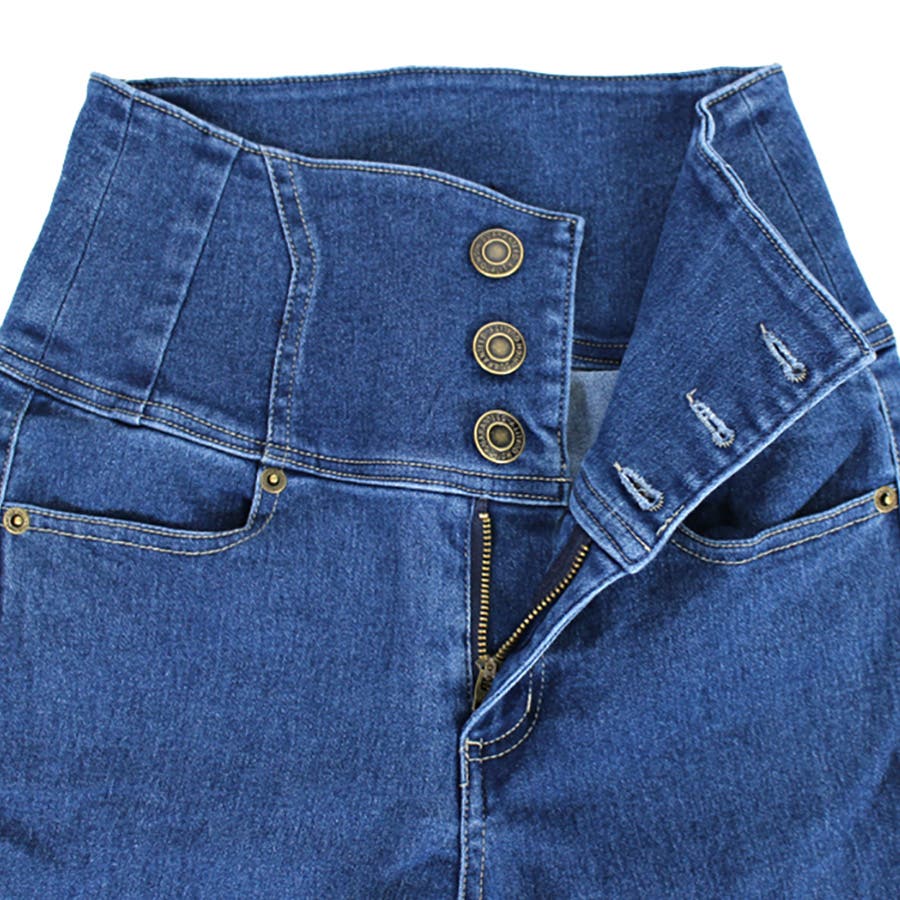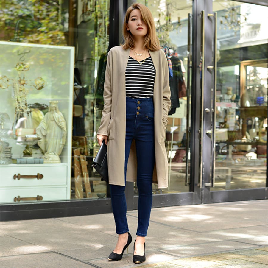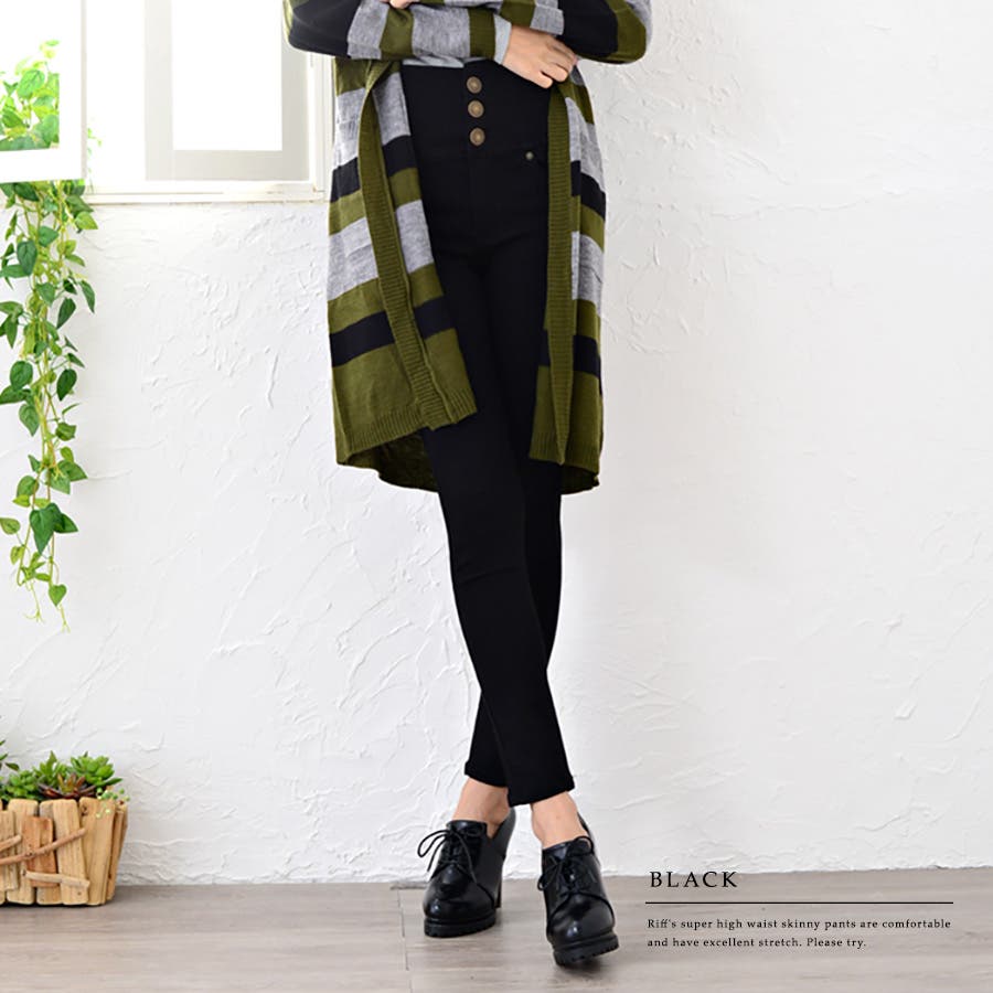 ハイウエストデニムスキニーパンツ3個釦タイプ。