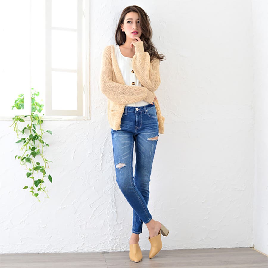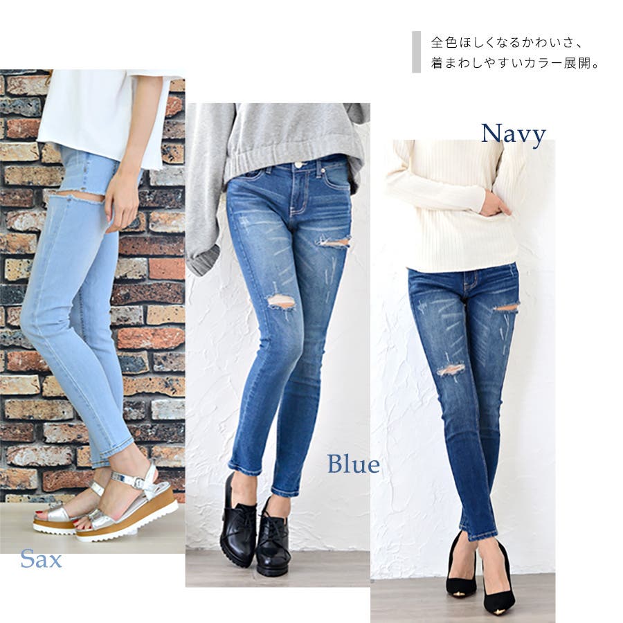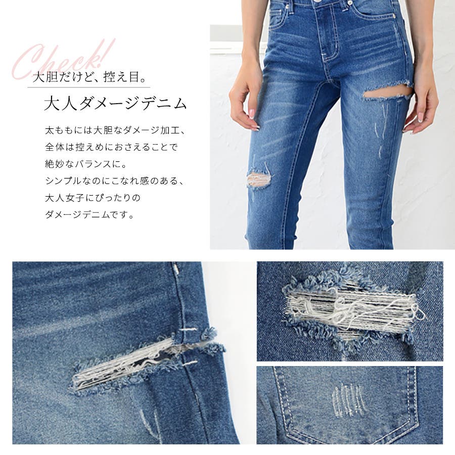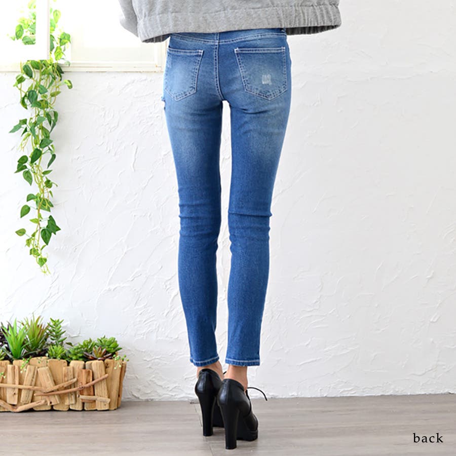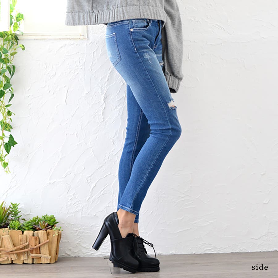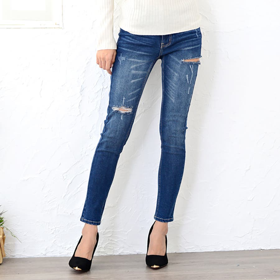 太もも付近に大胆にダメージ加工を施したデニムスキニーパンツ。