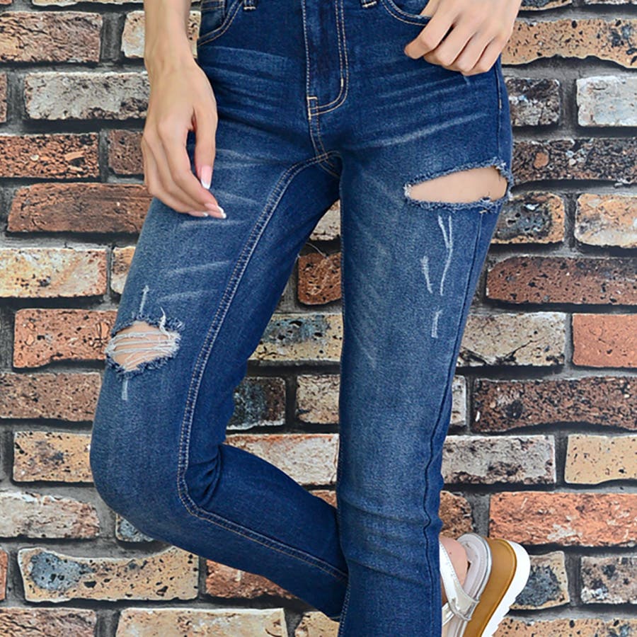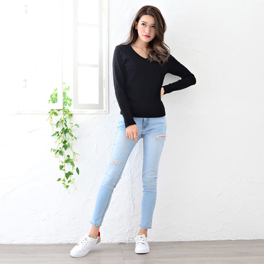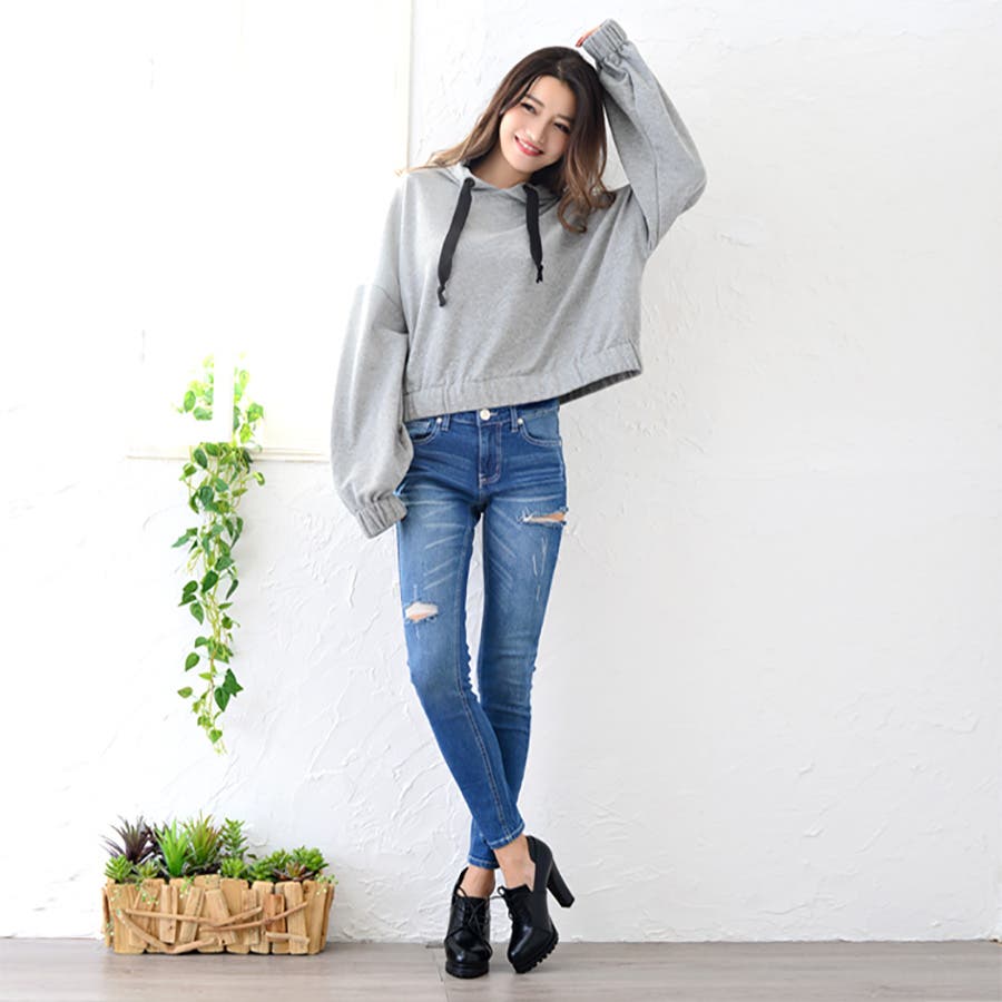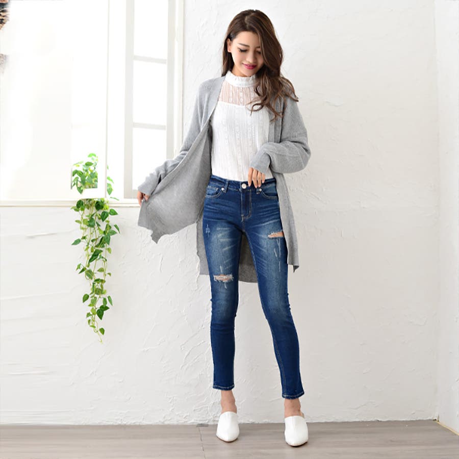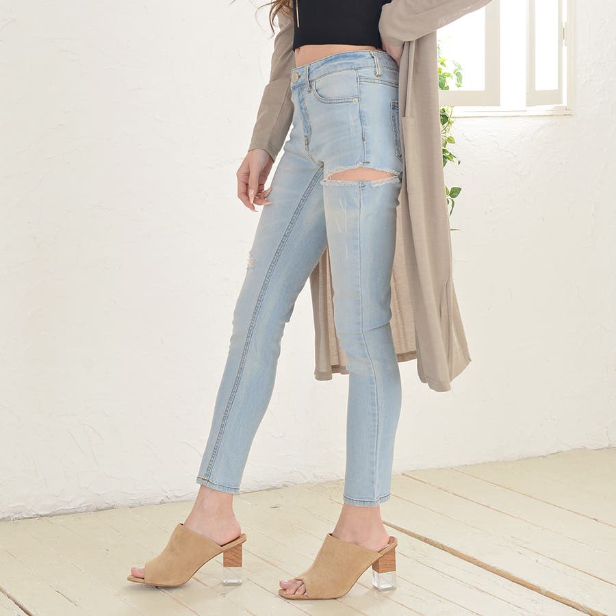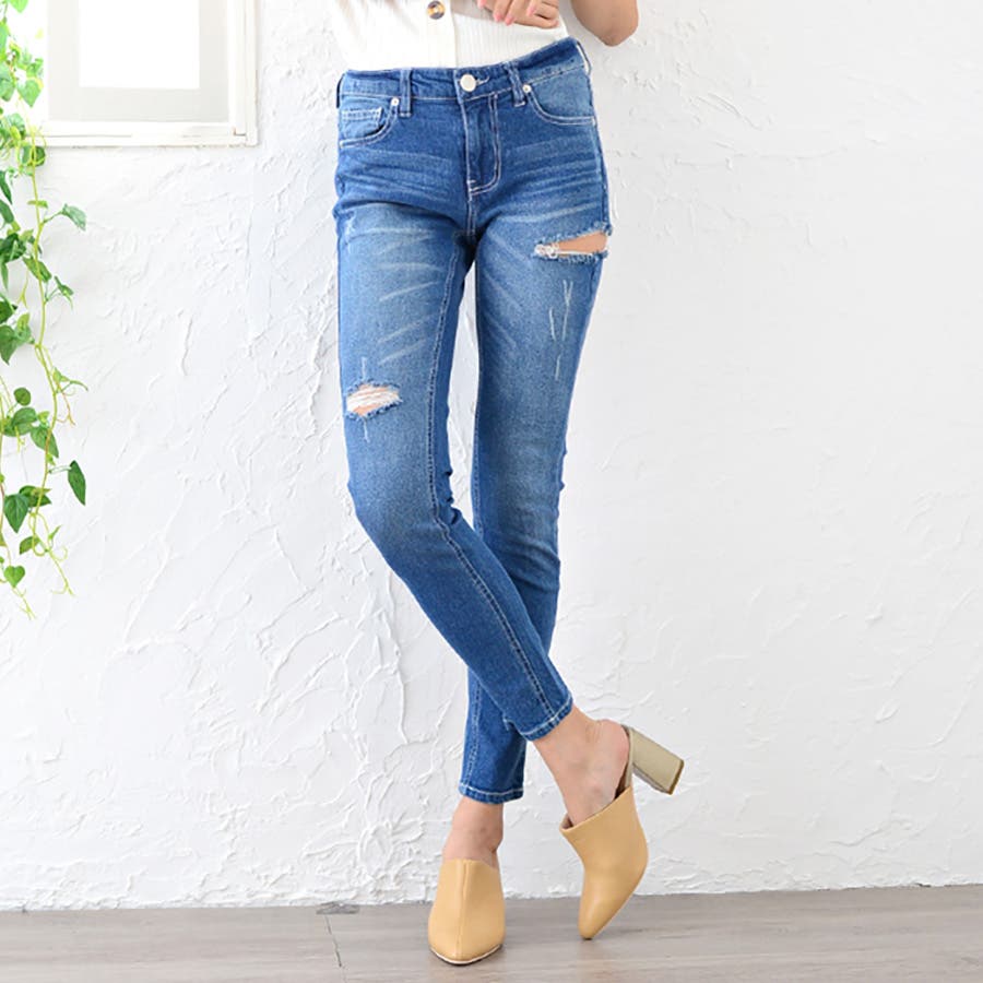 太もも付近に大胆にダメージ加工を施したデニムスキニーパンツ。