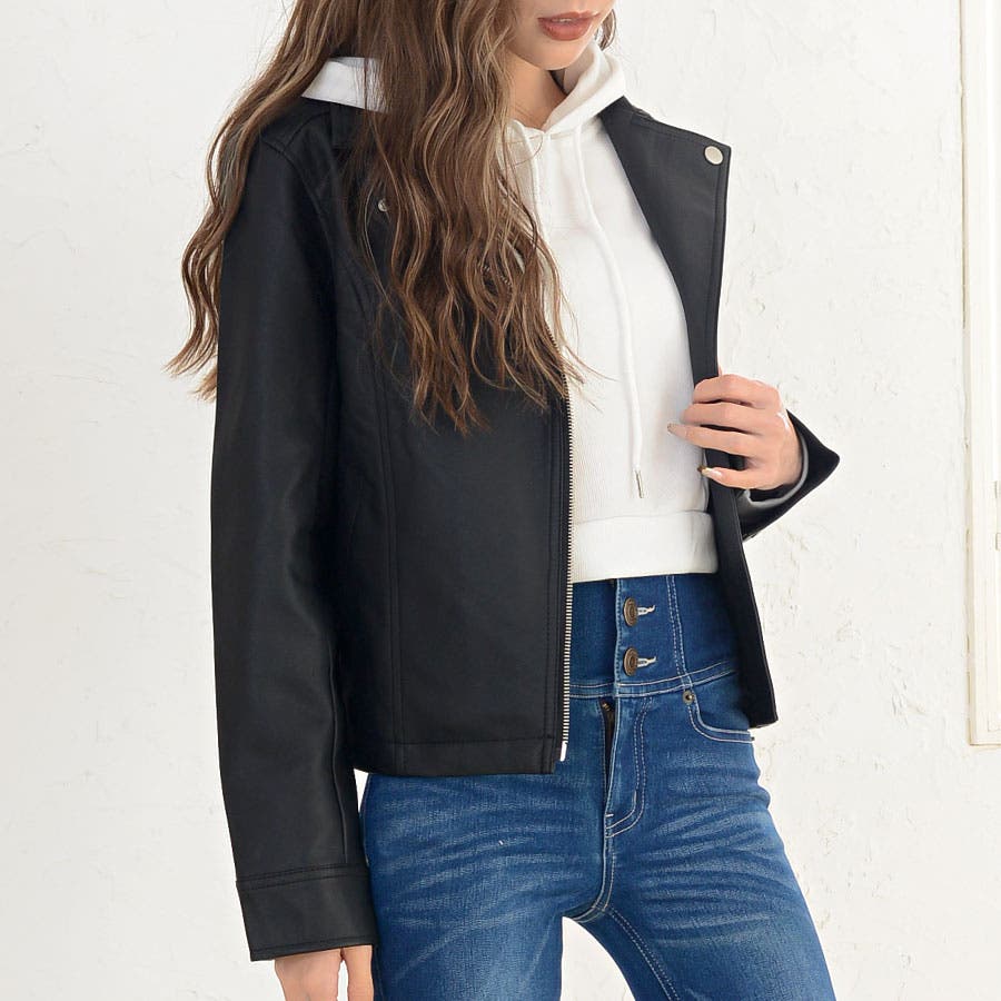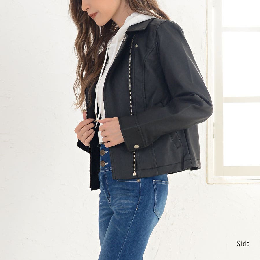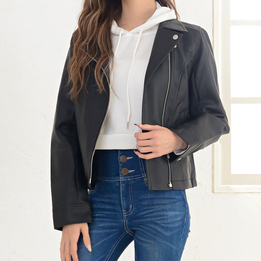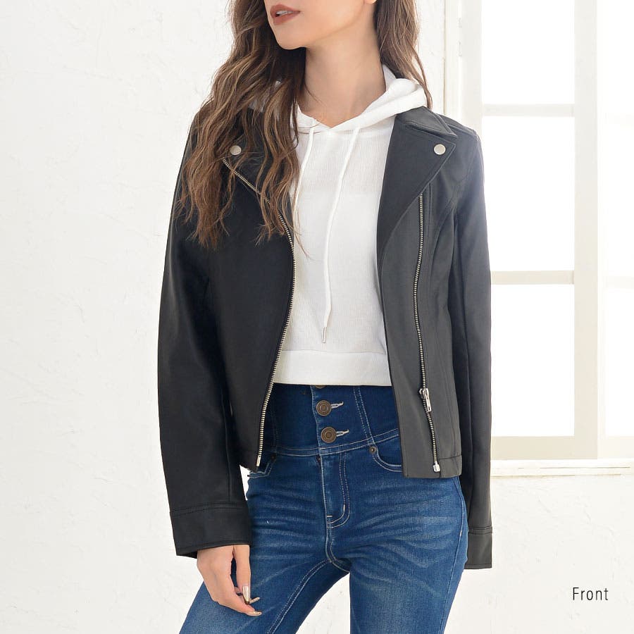 すっきりと無駄のない人気のダブルライダース。ショート丈でスッキリとした着こなしをアシスト。自然とスタイルアップを演出します。合皮なのにリアルレザーのような質感。軽量で羽織りやすいのも魅力です。フェイクレザーなのでお手入れも楽チンで、デイリーに気兼ねなく使えます。定番デザインなのでカジュアルコーデはもちろん、ガーリー・フェミニン系の甘辛MIXスタイルにもピッタリです。
