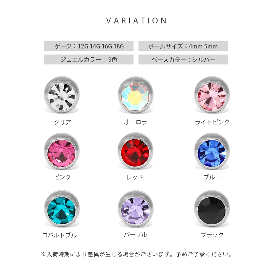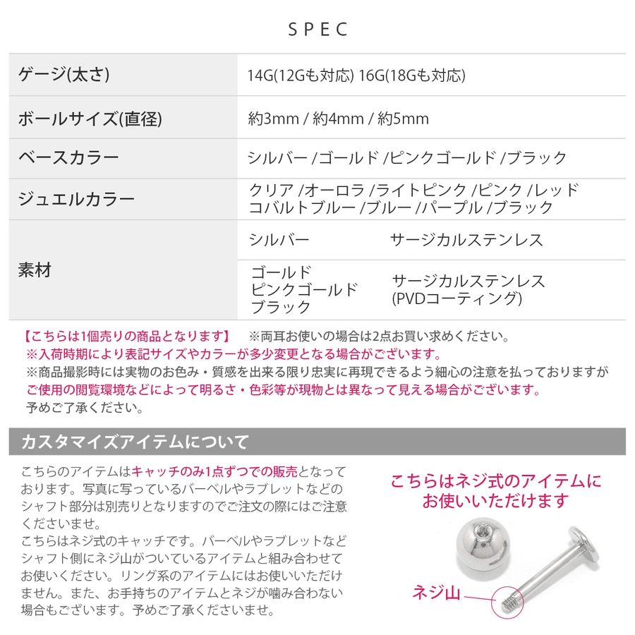 | ゲージ・ボールサイズ | 14G(12Gも対応)・4mm / 14G(12Gも対応)・5mm / 16G(18Gも対応)・4mm / 16G(18Gも対応)・5mm / 16G(18Gも対応)・3mm |