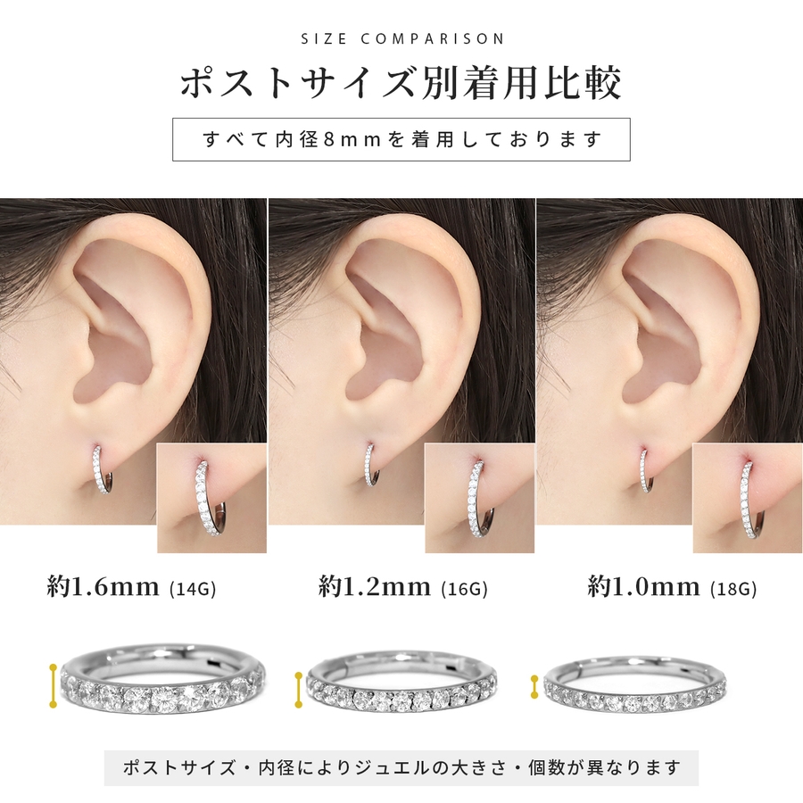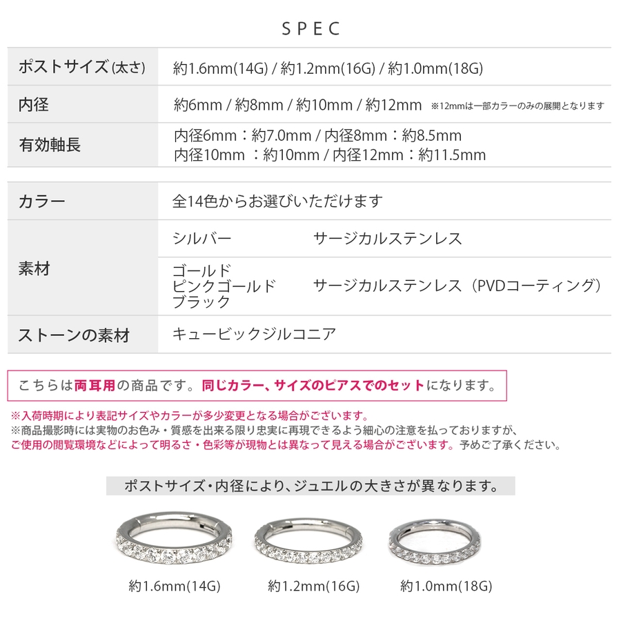 | ゲージ・内径 | 14G・6mm / 14G・8mm / 14G・10mm / 16G・6mm / 16G・8mm / 16G・10mm / 18G・6mm / 18G・8mm / 18G・10mm / 14G・12mm / 16G・12mm / 18G・12mm |