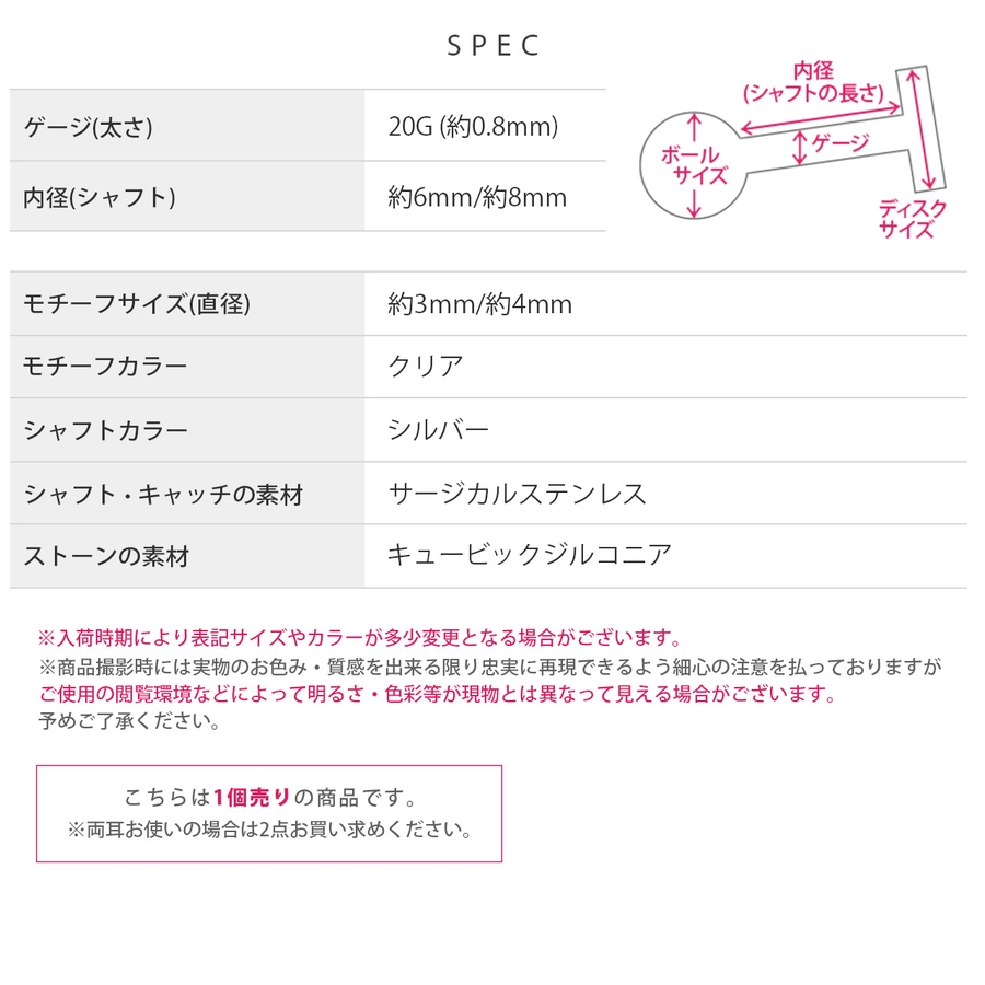 | ゲージ・内径×ストーンサイズ | 20G・6mm×3mm / 20G・6mm×4mm / 20G・8mm×3mm / 20G・8mm×4mm |