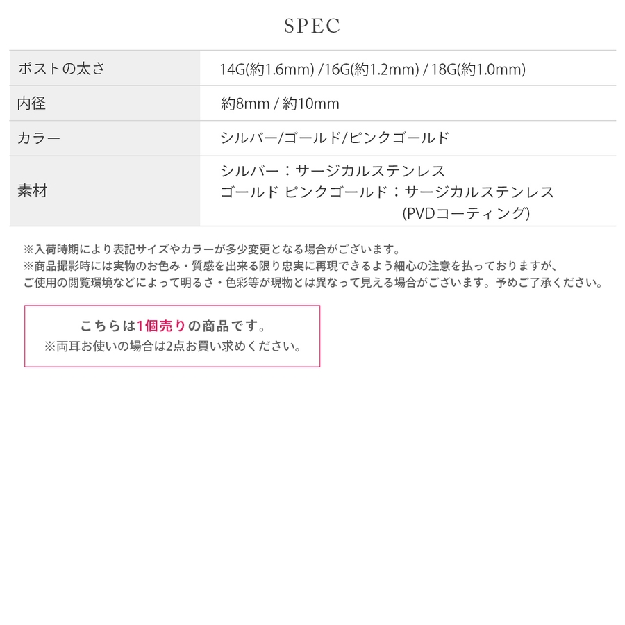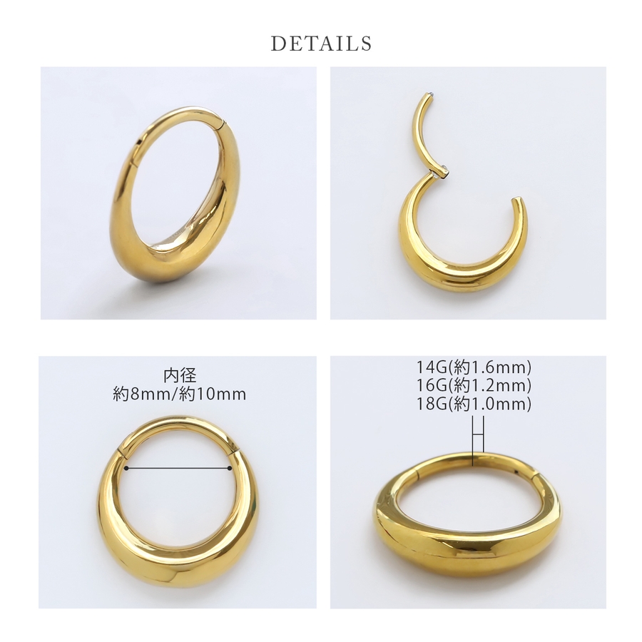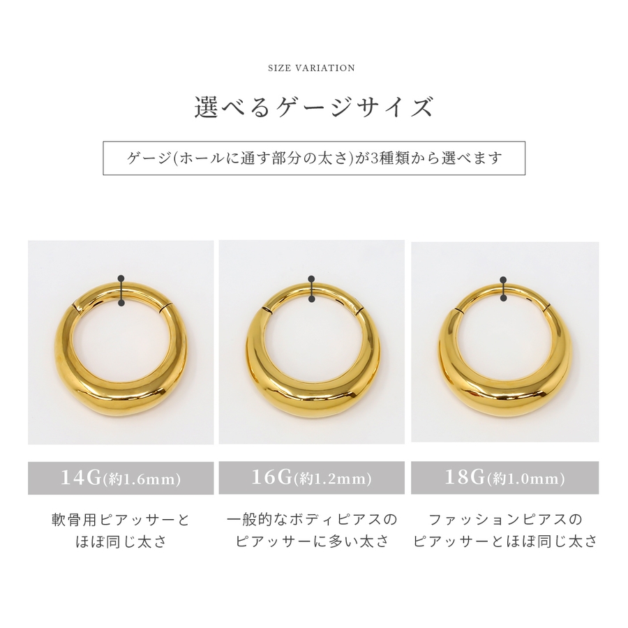 | ゲージ・内径 | 16G・8mm / 16G・10mm / 18G・8mm / 18G・10mm / 14G・8mm / 14G・10mm |