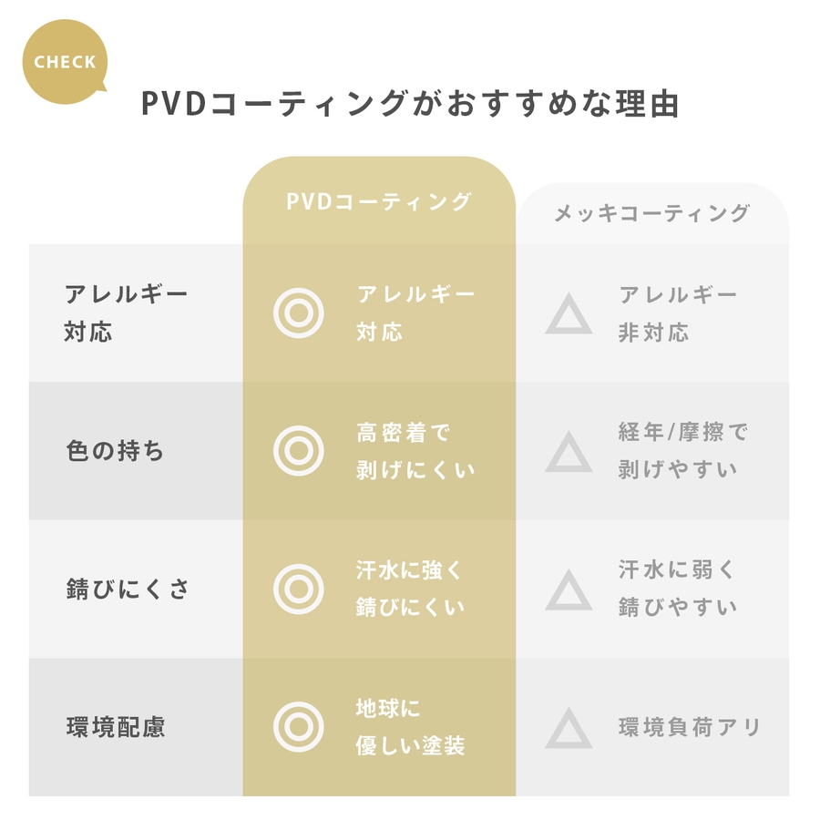 ※本商品の一部カラーは、カラーのPVDコーティングを施しています。アレルギーには個人差があり、必ずしもアレルギーが出ないとは限りません。