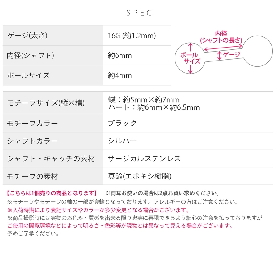 蝶:約5mm×約7mm ハート:約6mm×約6.5mm