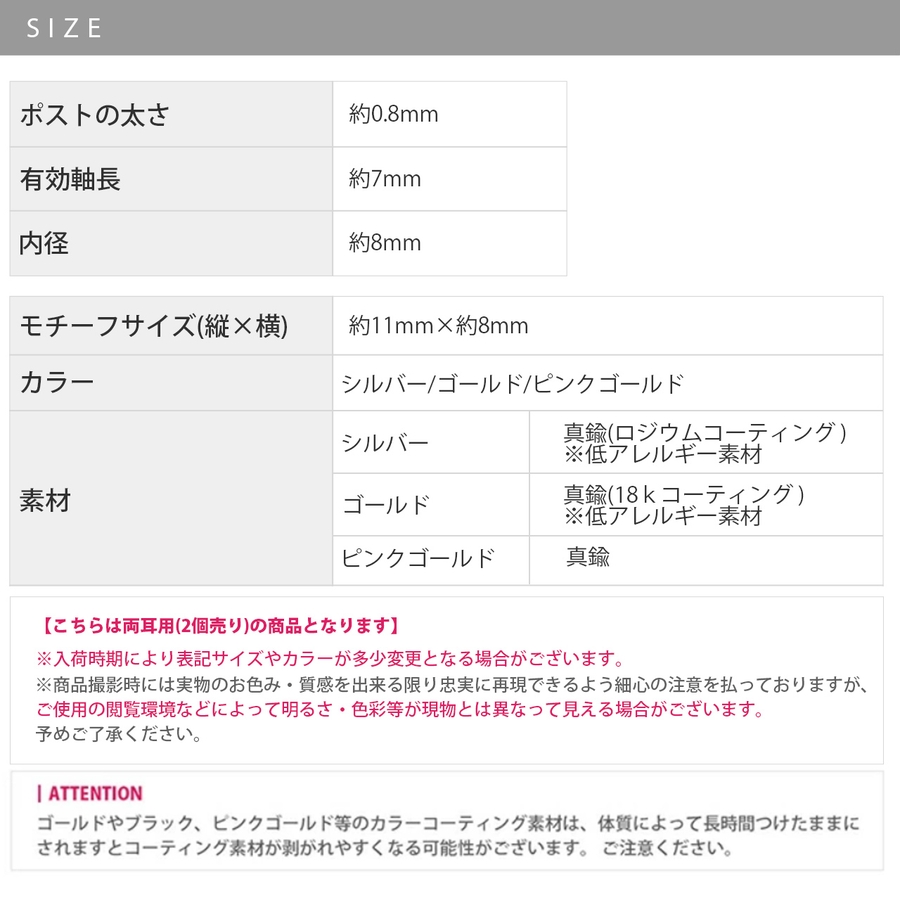 ※ゴールドやブラック、ピンクゴールド等のカラーコーティング素材は、体質によって長時間つけたままにされますとコーティング素材が剥がれやすくなる可能性がございます。※ニッケルフリー素材は全ての方に金属アレルギーが出ないことを保証するものではございません。